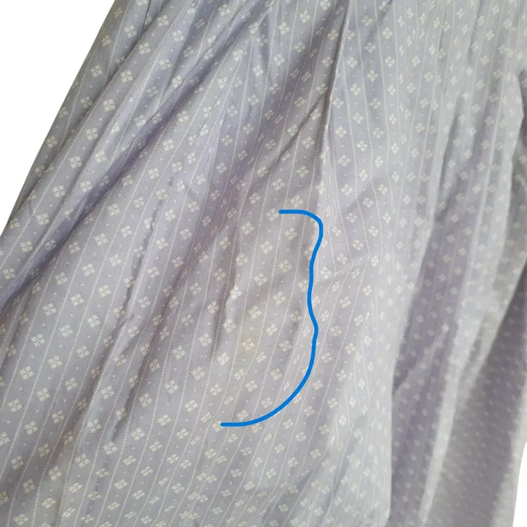 Condition: Dress was dry cleaned a while ago and not worn since. It does have a very light spot that is in a crease on the front of the skirt. The dry cleaner must have missed this area. The one I go to is bad about it unless I put on tags that point everything out ugh! The last photo shows the stain area which I marked next to in blue. I thought there was a tiny stain along the edge of a sleeve but now I cannot find it.