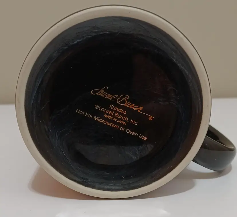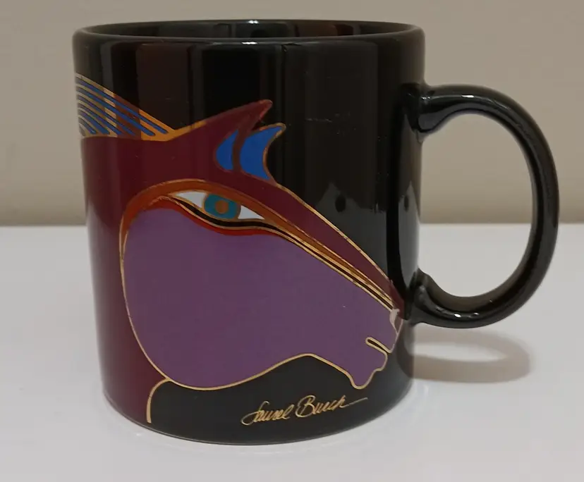 Vintage 80's Laurel Burch Black And Purple With Gold Outline Of Cool Stallion Coffee Mug; Cool Retro Design; 4" tall x 5" wide thru handle; nice condition; shows very little wear; no chips or cracks