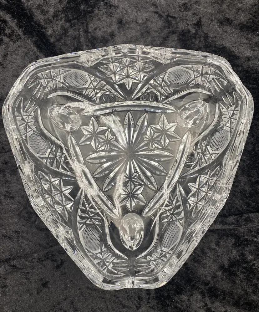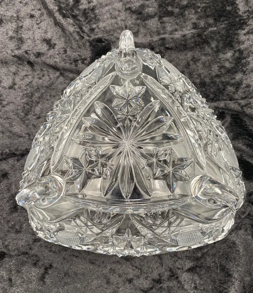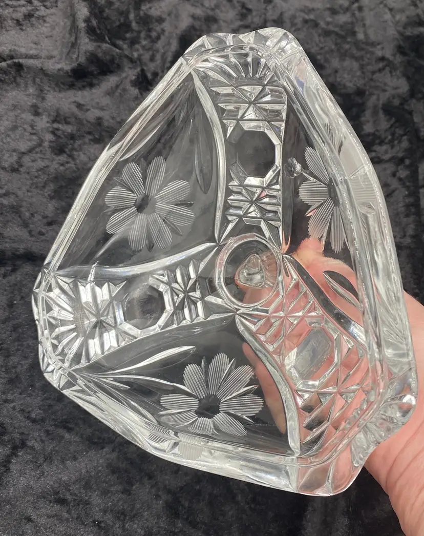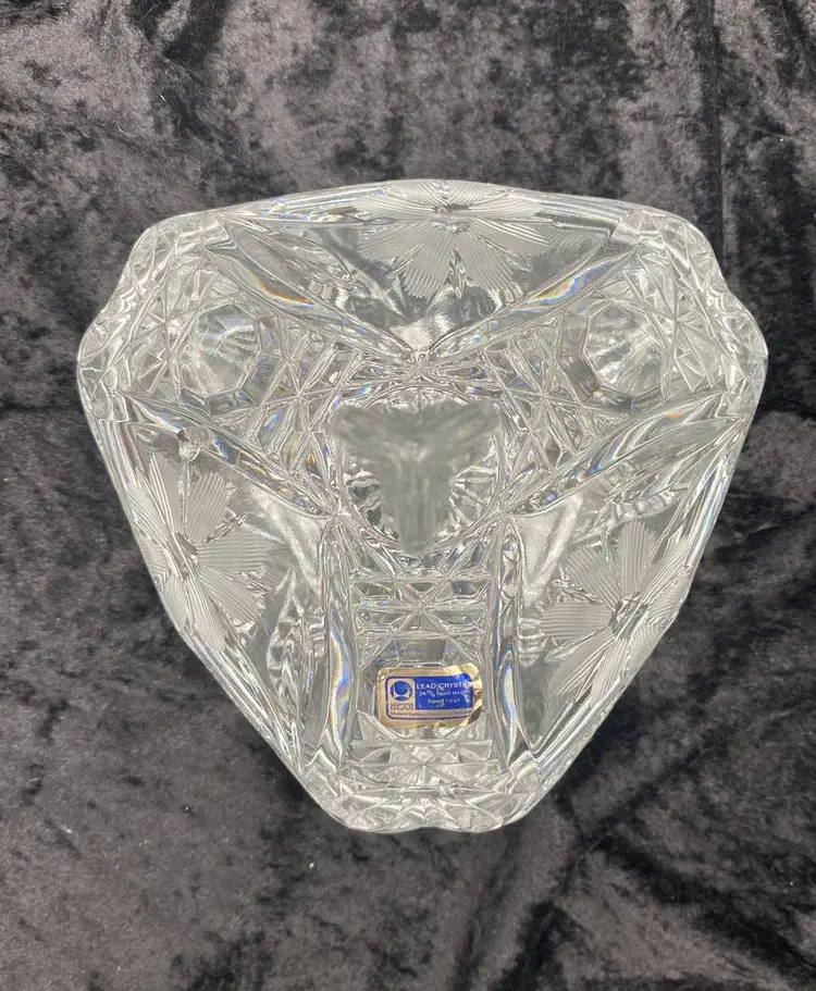 Experience the elegance of mid-century modern design with this exquisite Lausitzer Glas lead crystal candy dish, complete with a glossy finish that showcases its hand-blown glass craftsmanship. The dish features a beautiful floral pattern, a nod to the timeless appeal of nature-inspired decor. With its generous 8-inch height and 7-inch width, this piece is perfectly sized to grace any mantle or display cabinet, adding a touch of sophistication and charm to your home. Crafted in the German Democratic Republic (East Germany) during the 1960s, this hand-cut crystal dish is a testament to the skill and artistry of the era. The intricate cut design, complemented by the three scrolled feet and triangle finial, ensures this piece is not only a visual delight but also a notable addition to your collection. Whether for special occasions or as a permanent fixture in your decor, this Lausitzer Glas crystal candy dish is a true representation of vintage beauty and craftsmanship.