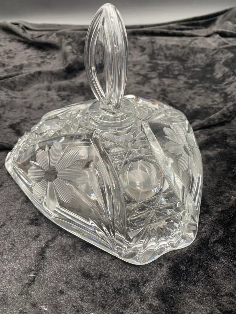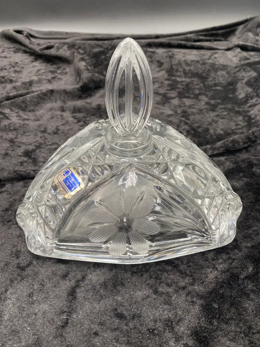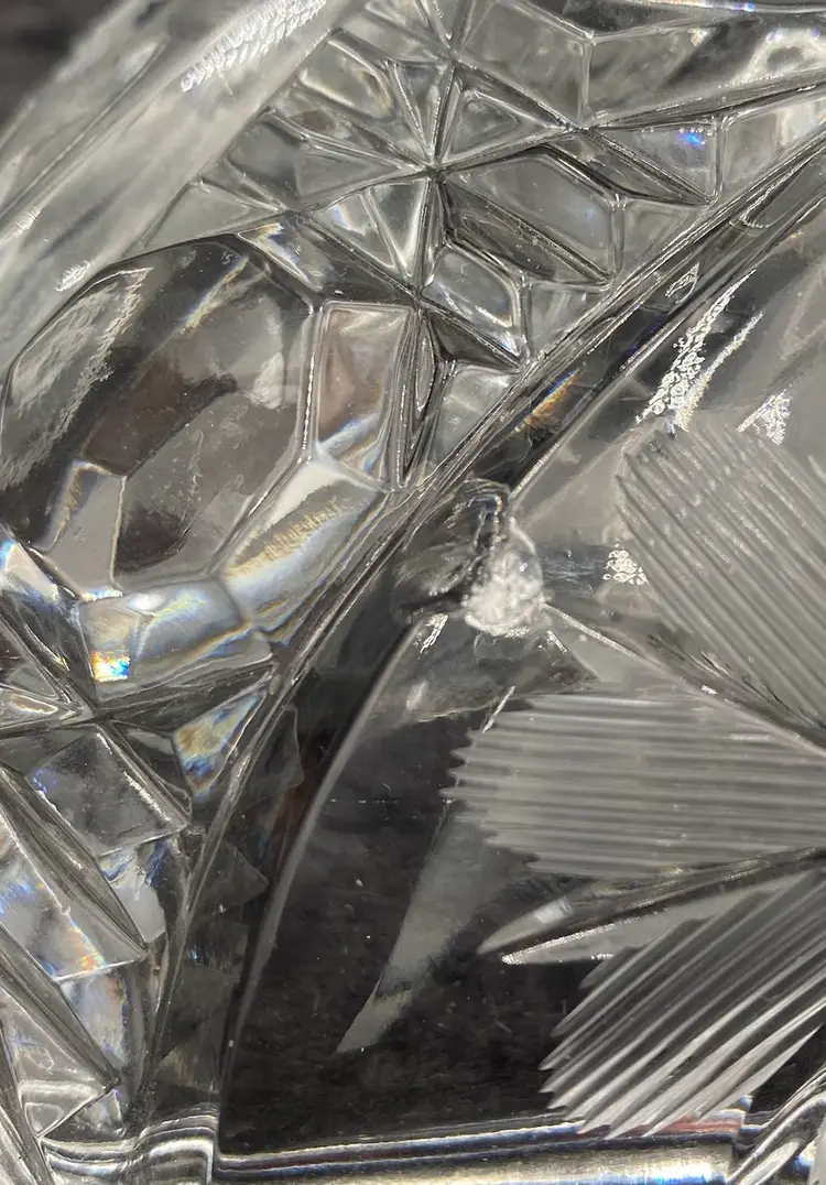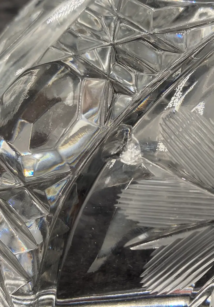 The candy dish is in very good condition. There is one chip, which does not stand out due to the many facets of the crystal (see close up picture). Otherwise, both the base and lid are in mint condition.