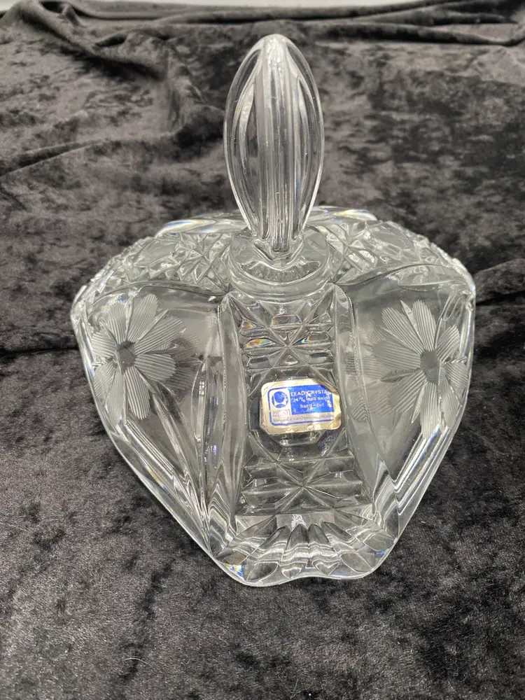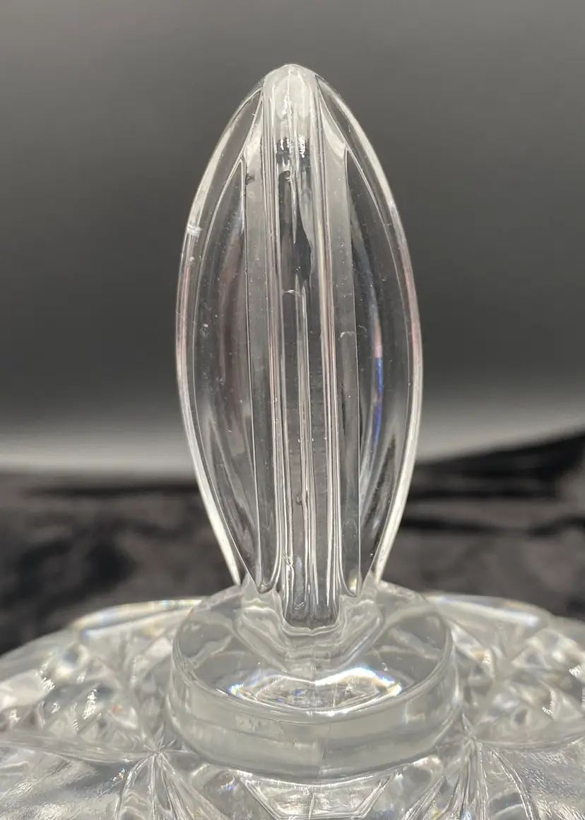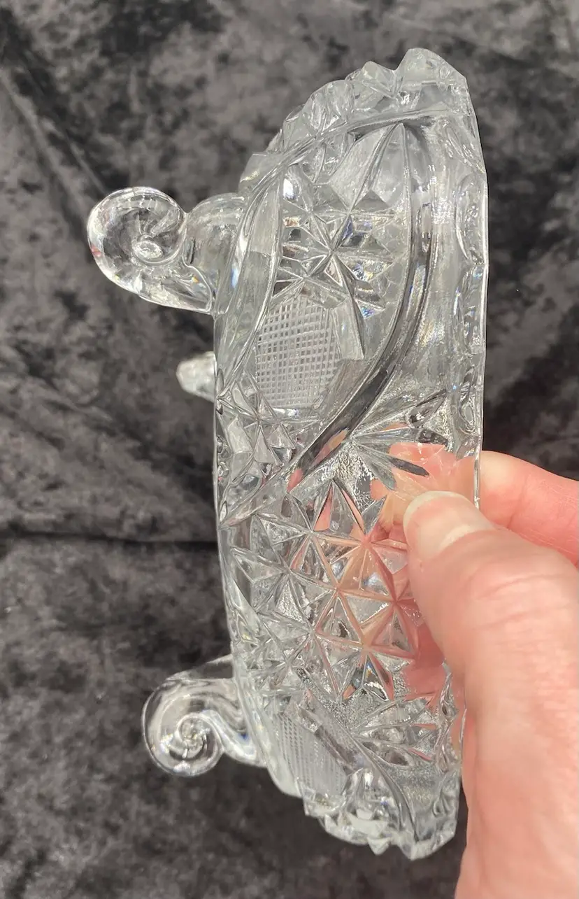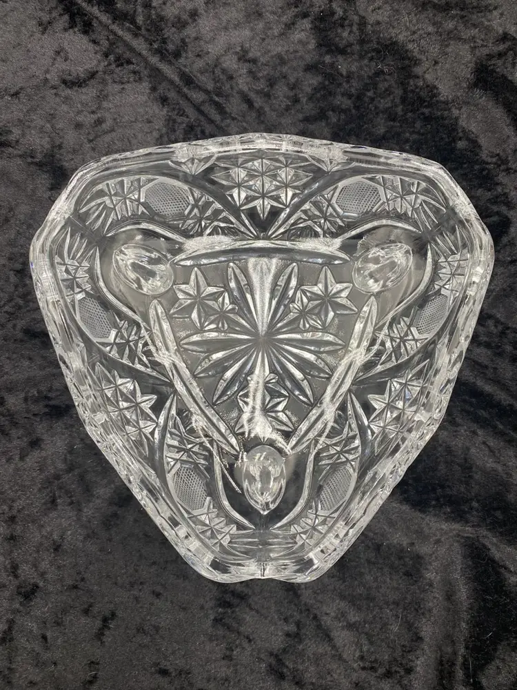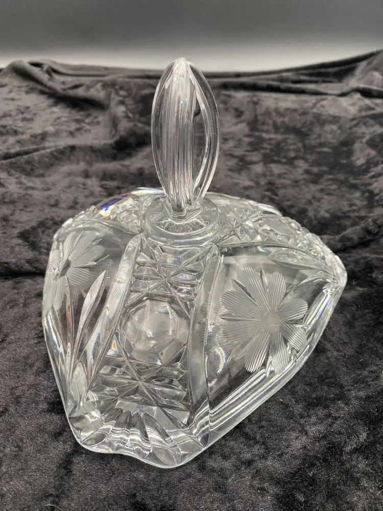 The candy dish is in very good condition. There is one chip, which does not stand out due to the many facets of the crystal (see close up picture). Otherwise, both the base and lid are in mint condition.