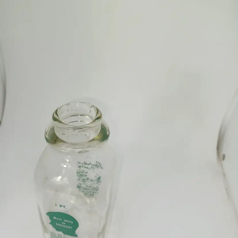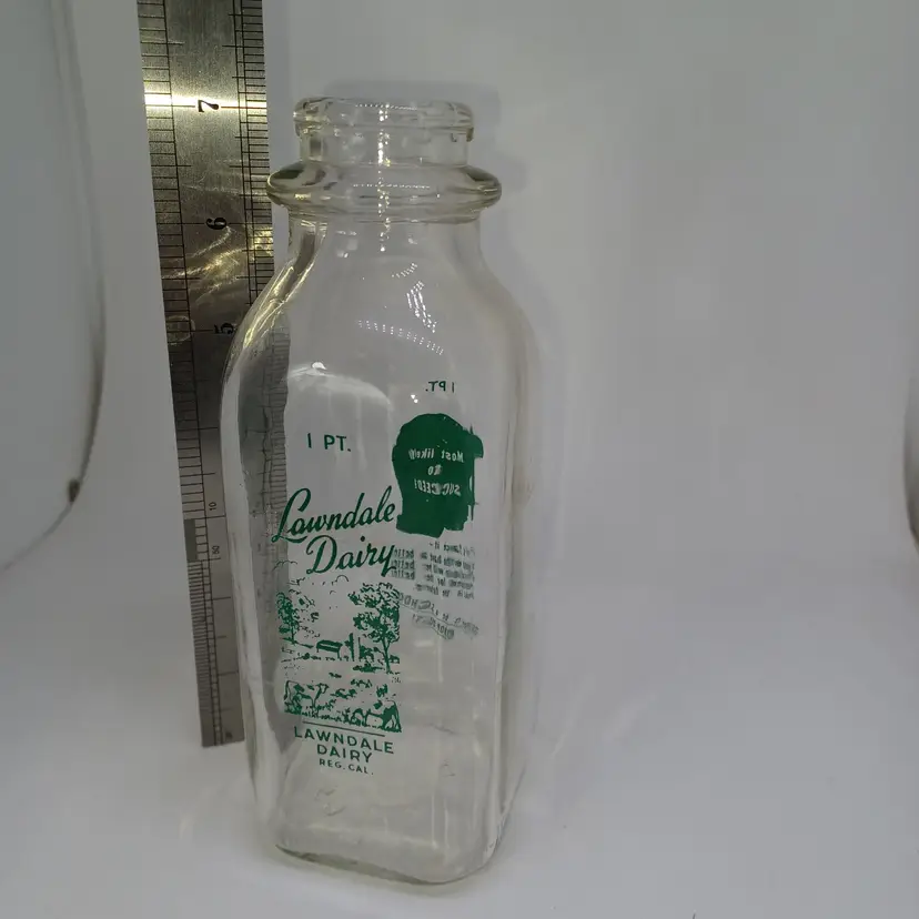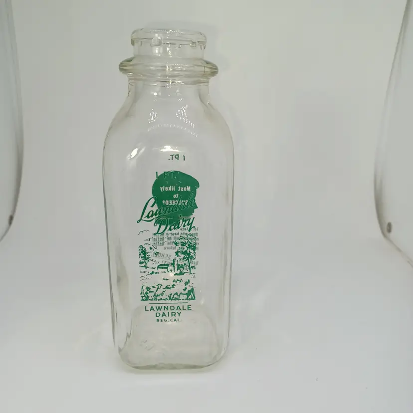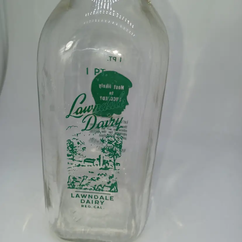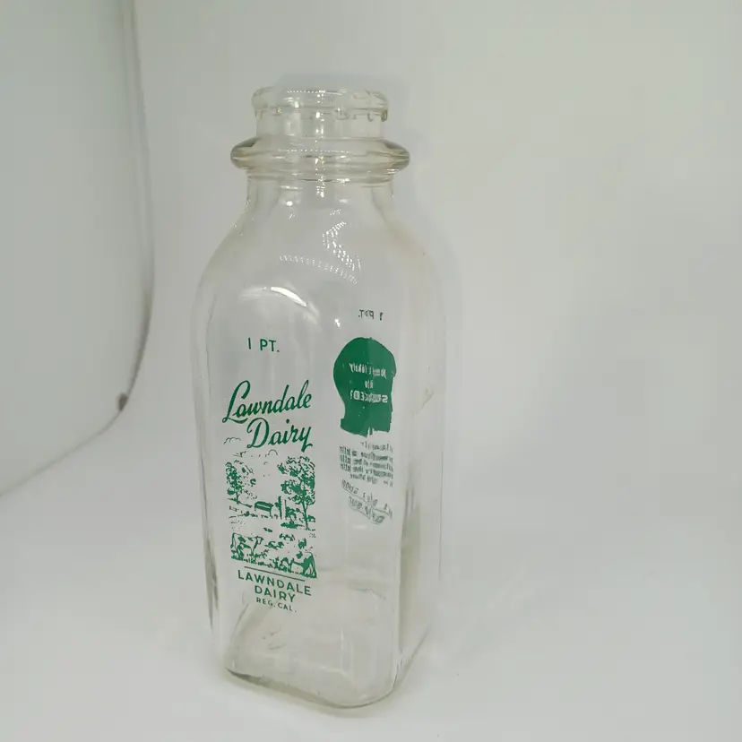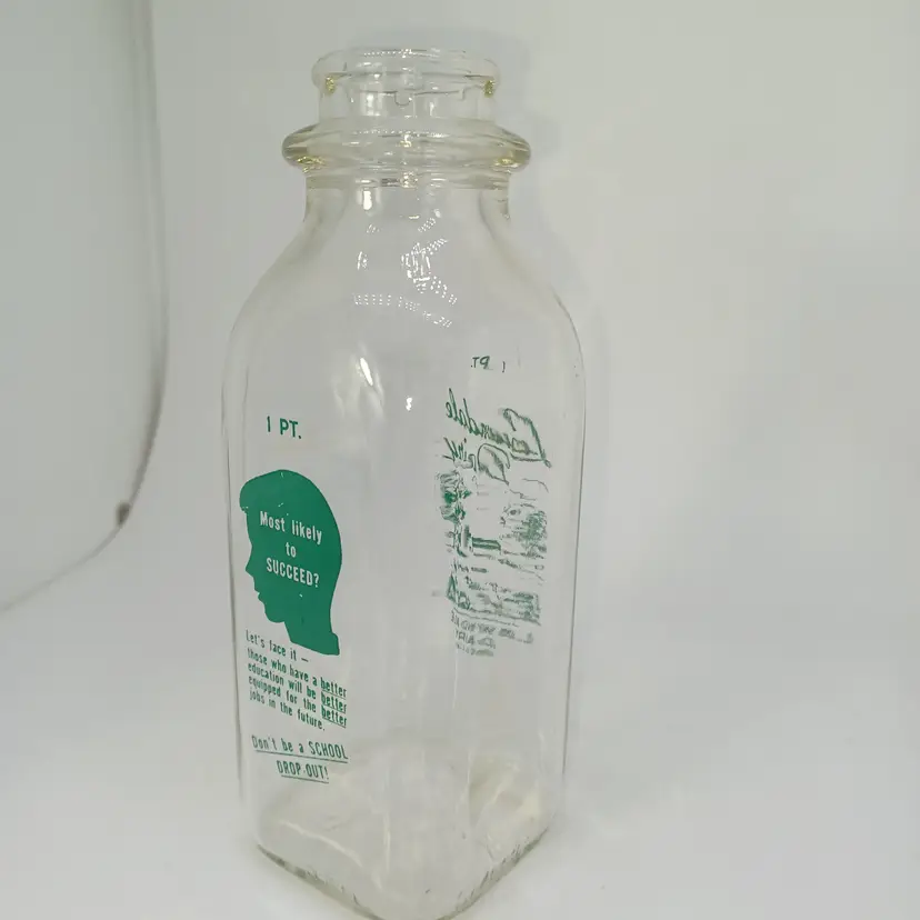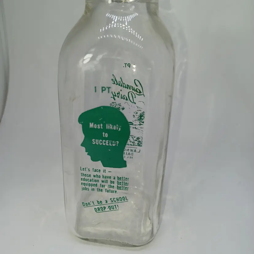 Vintage Lawndale Dairy 1 pint milk bottle marked Lawndale Dairy reg Cal on the front with a picture of trees and a park bench on the back it has a child's head that says "most likely to succeed? Let's face it those have been have a better education will be better equipped for a better jobs in the future. Don't be a school dropout! Believe this bottle is from the early 50s ( Not much info for it out there) And good vintage condition Graphics are nice and bright does have a little bit of water staining on the inside and possibly a few scratches but still displays well -hard to photograph the clear glass. all items from a smoke-free home with pets experienced glass shipper