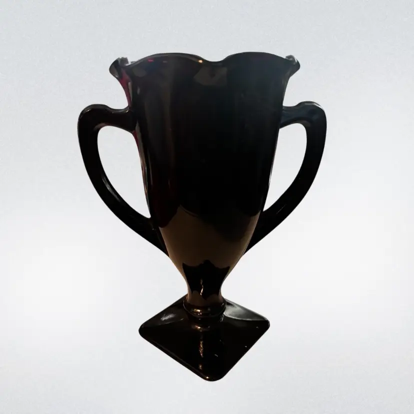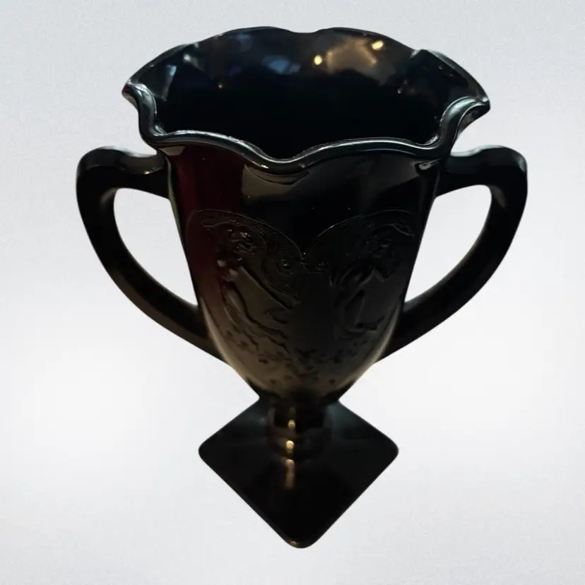 This exquisite vase is a true work of art. Crafted by L.E. Smith in the US during the 1930’s, it features a stunning pattern of dancing nymphs on a black glass background. The vase is large in size, measuring 7” in height and has two handles.