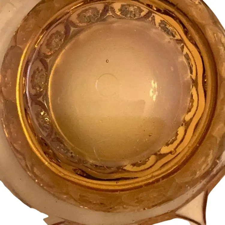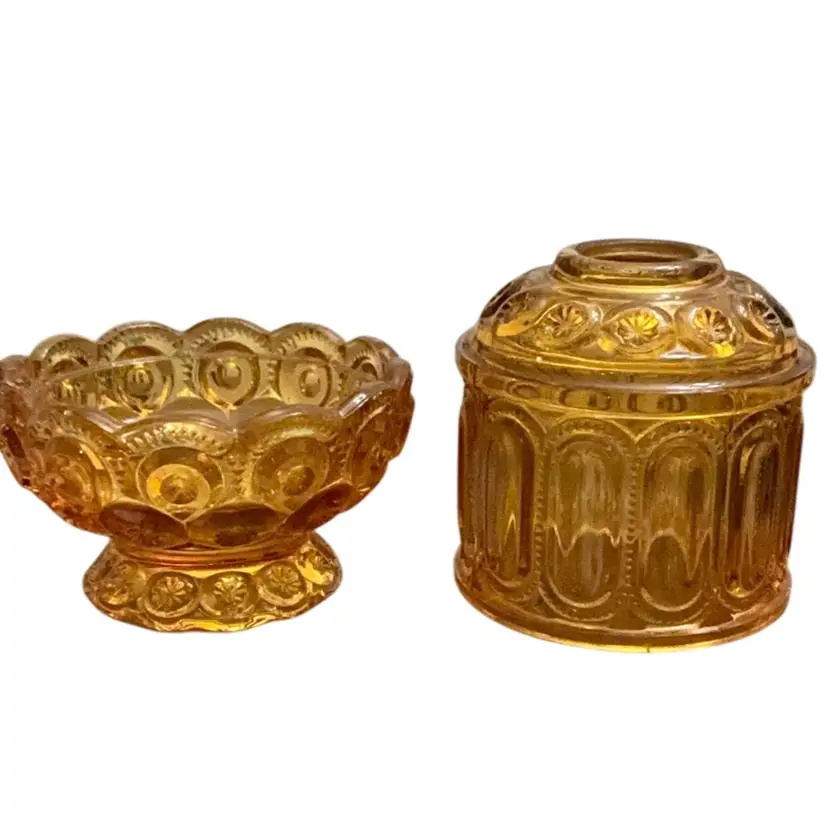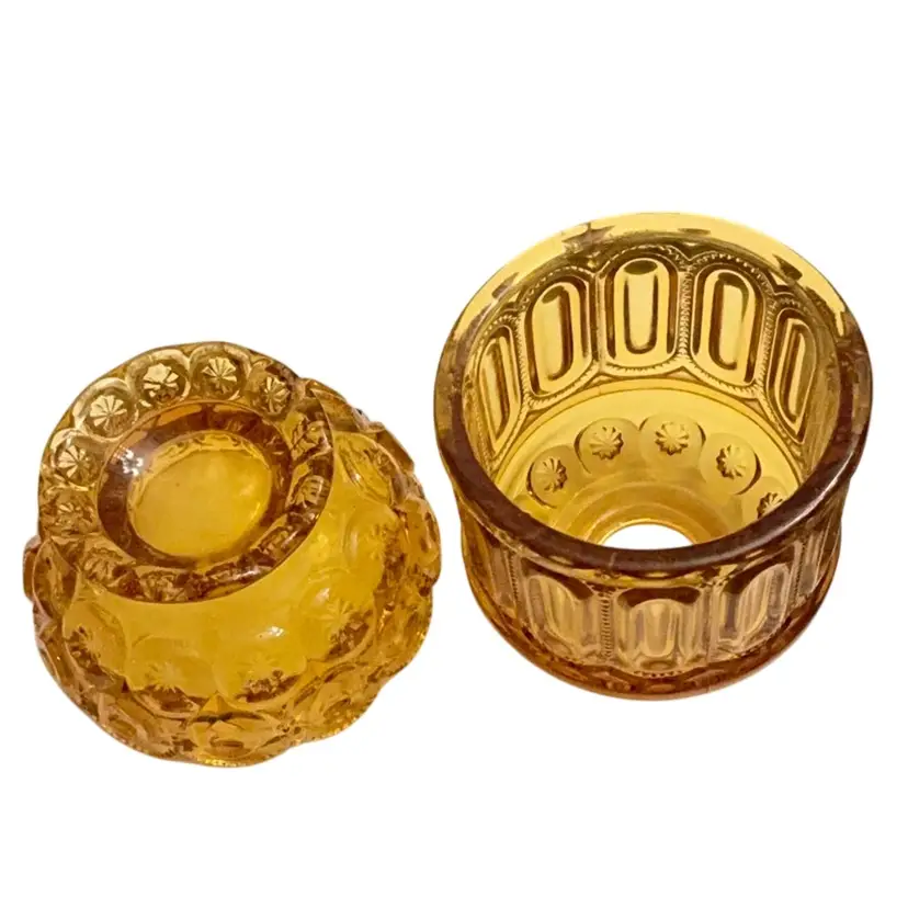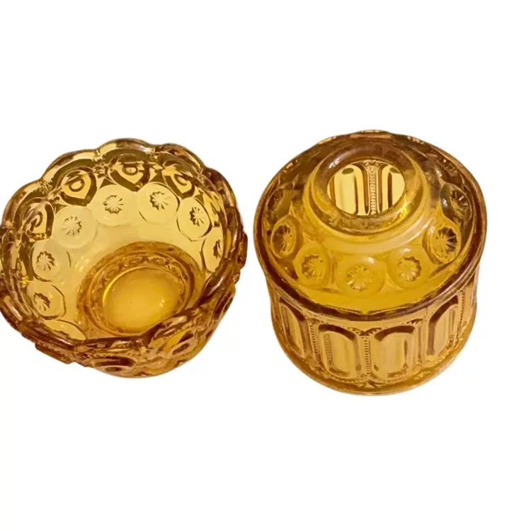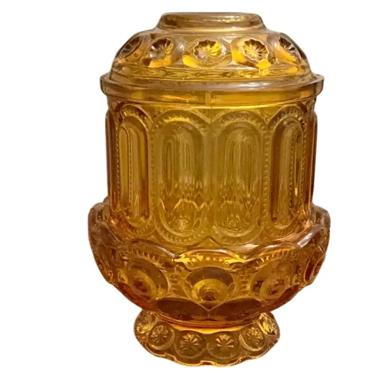 Stunning amber colored fairy lamp. The moon and stars design is highly sought out by fairy lamp collectors because of its larger profile. There are a few very tiny flea bites around the base of the top due to the age of the item. Otherwise this lamp is in perfect condition.
