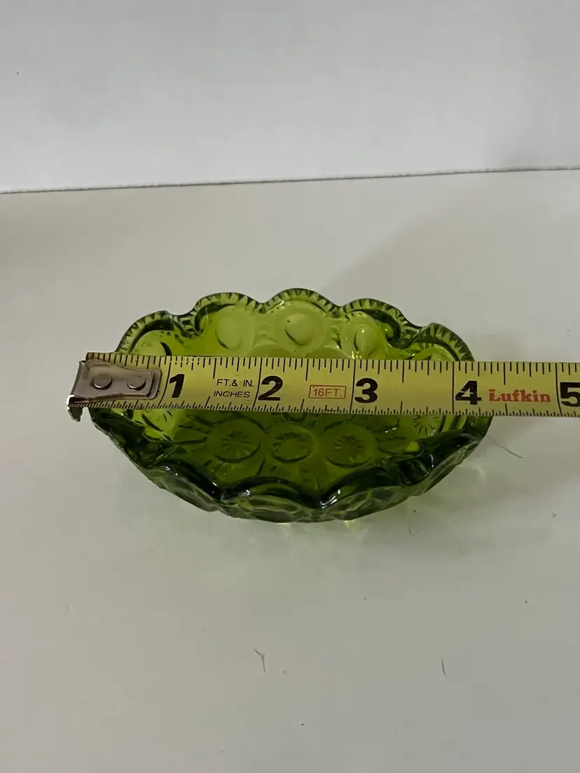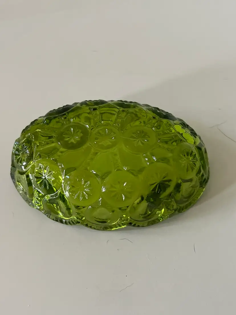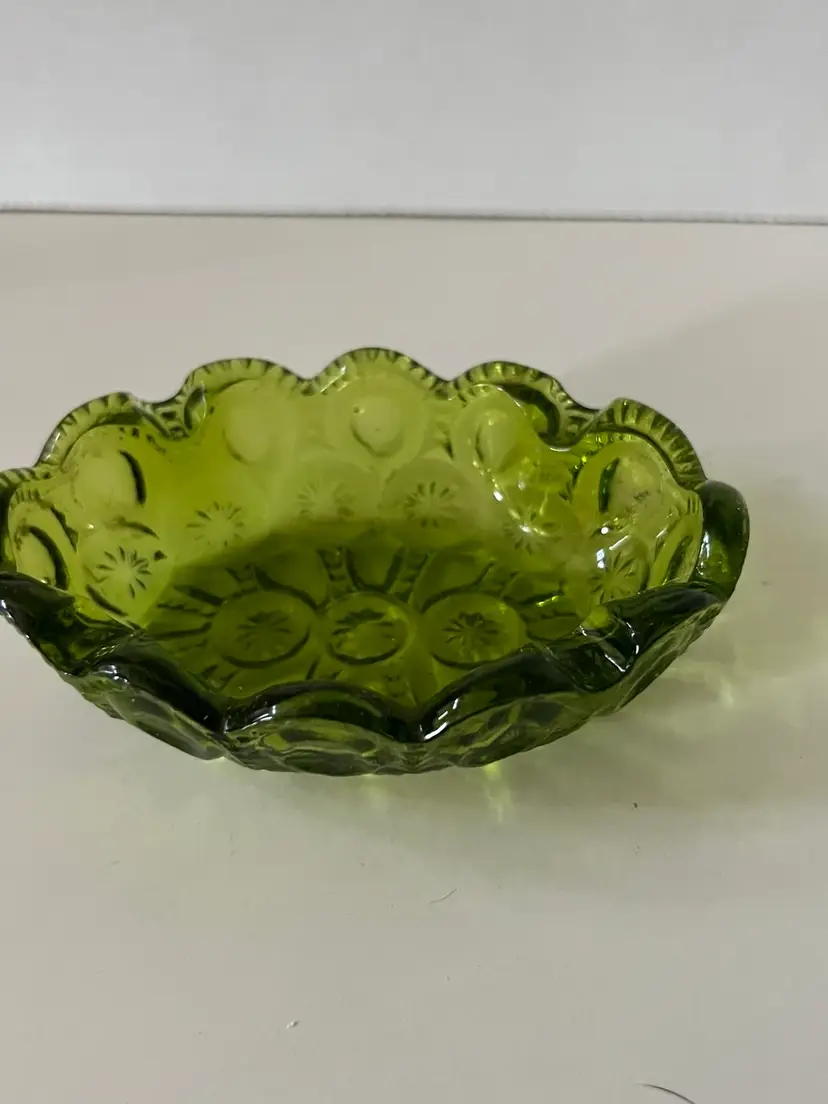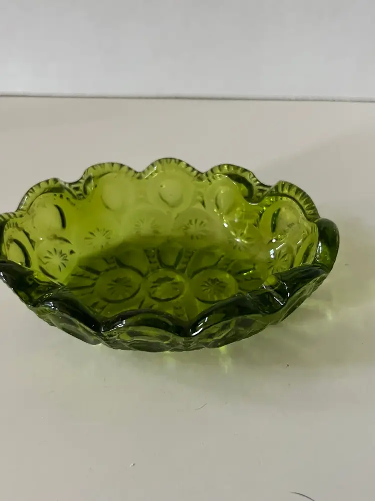 Beautiful avocado green LE Smith moon and stars ashtray trinket dish. There are no chips or cracks it’s in very good to excellent condition. Please see accompanying photos for condition s d measurements.