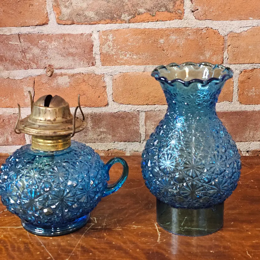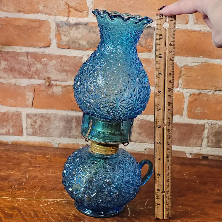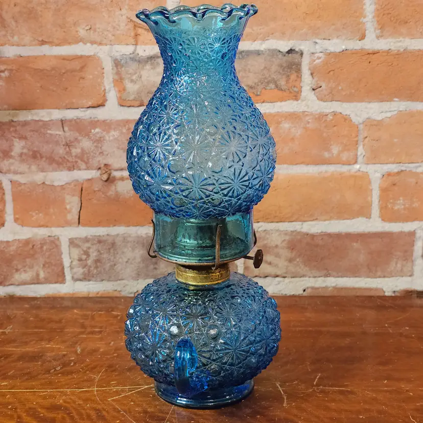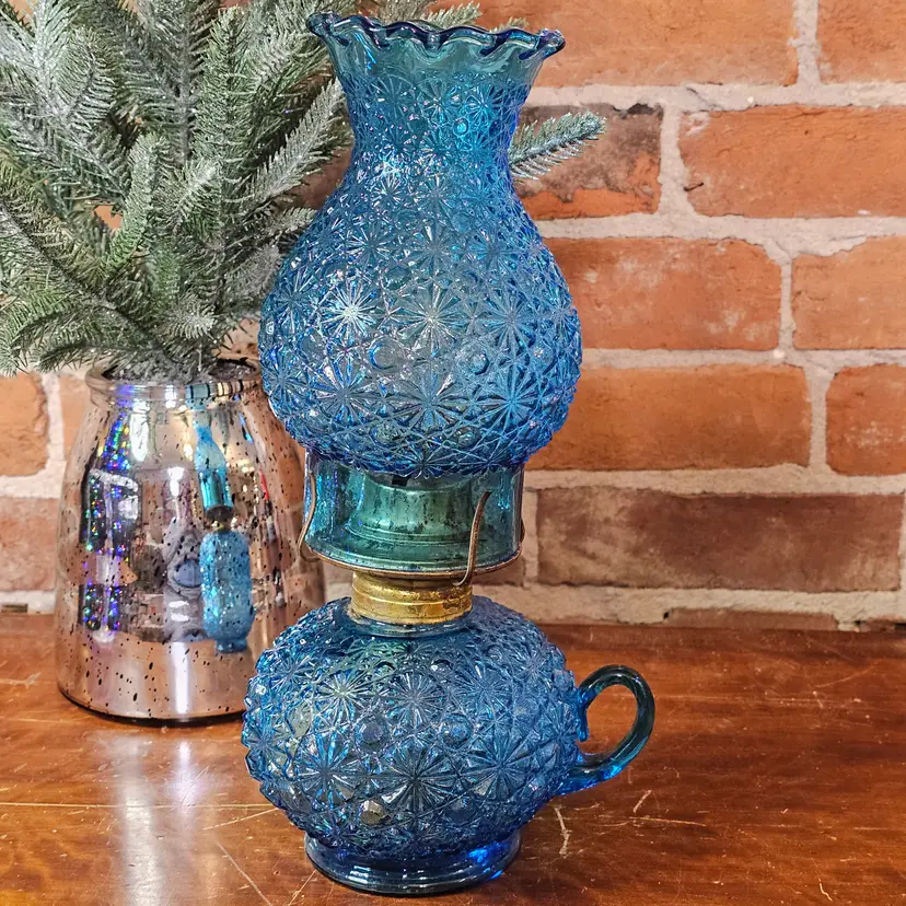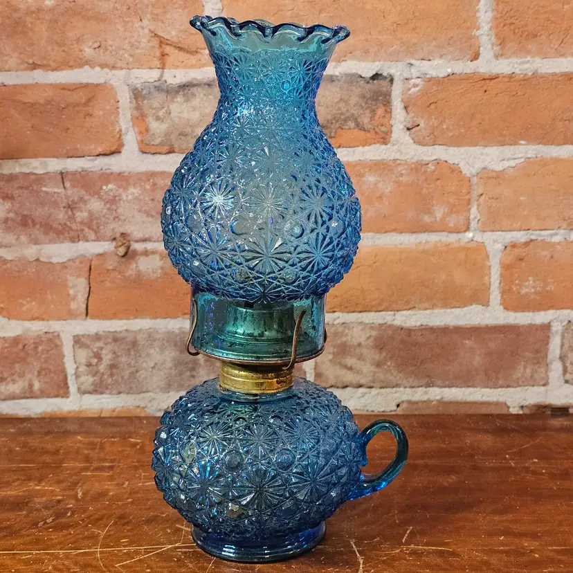 The Vintage L.E. Smith Glass Blue Daisy & Button Oil Lamp is a charming piece that stands at 12 inches tall. Made of glass with a beautiful blue color and a daisy and button pattern, this oil lamp exudes a vintage charm. The lamp features a shaded design and is an original piece from the United States.