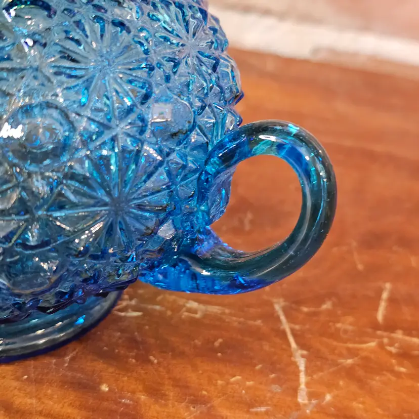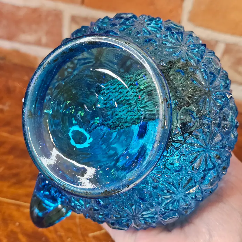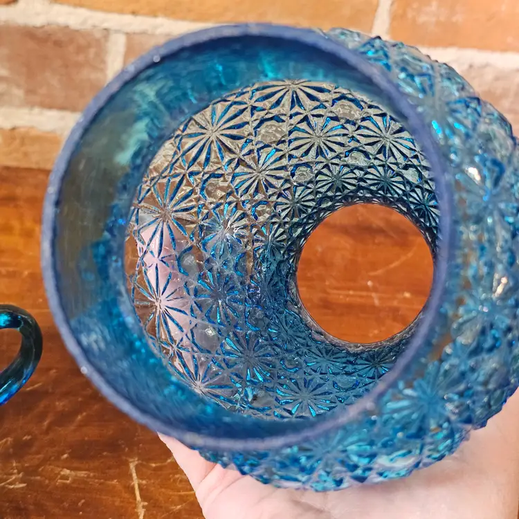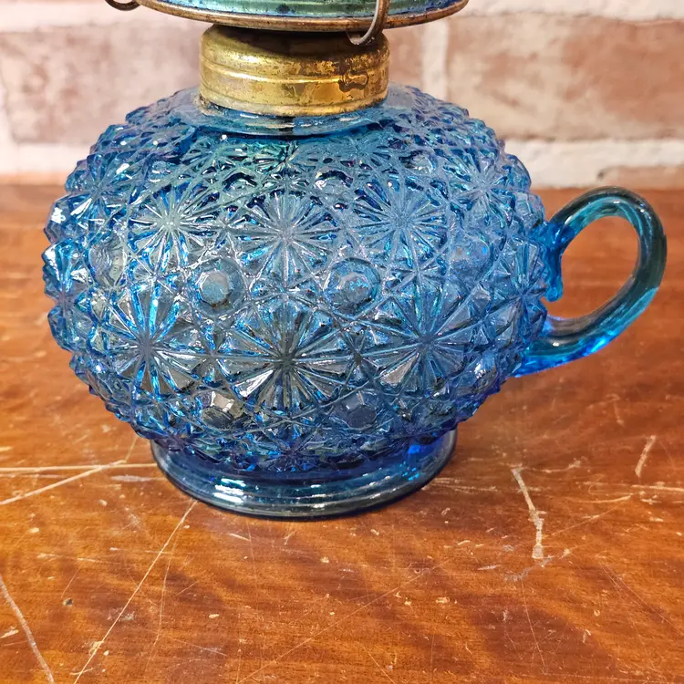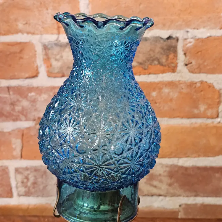 The Vintage L.E. Smith Glass Blue Daisy & Button Oil Lamp is a charming piece that stands at 12 inches tall. Made of glass with a beautiful blue color and a daisy and button pattern, this oil lamp exudes a vintage charm. The lamp features a shaded design and is an original piece from the United States.