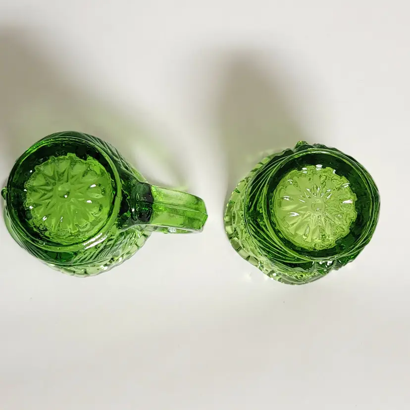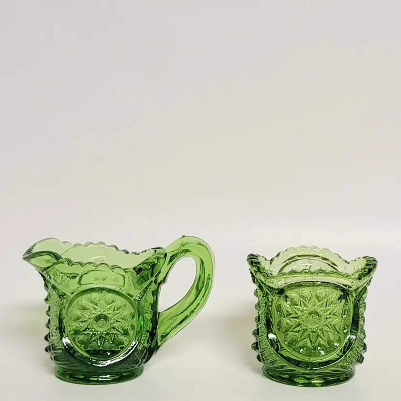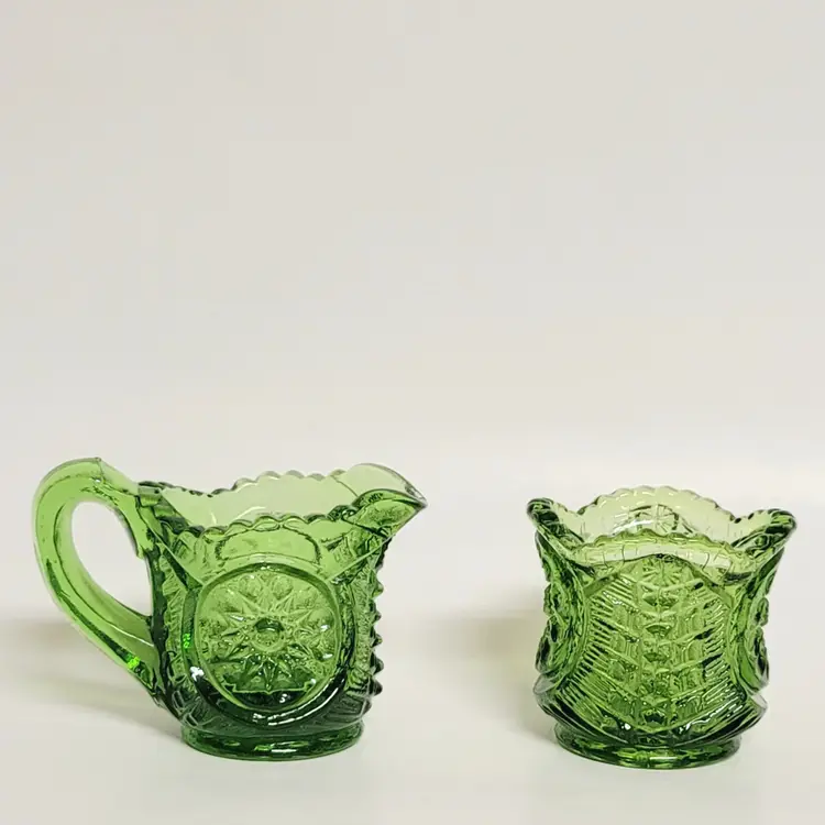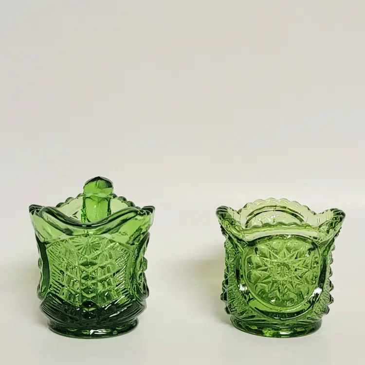 Add a touch of vintage charm to your table with this stunning green pressed glass creamer and sugar set. Perfect for collectors or anyone who loves a retro vibe. 2"x 2"