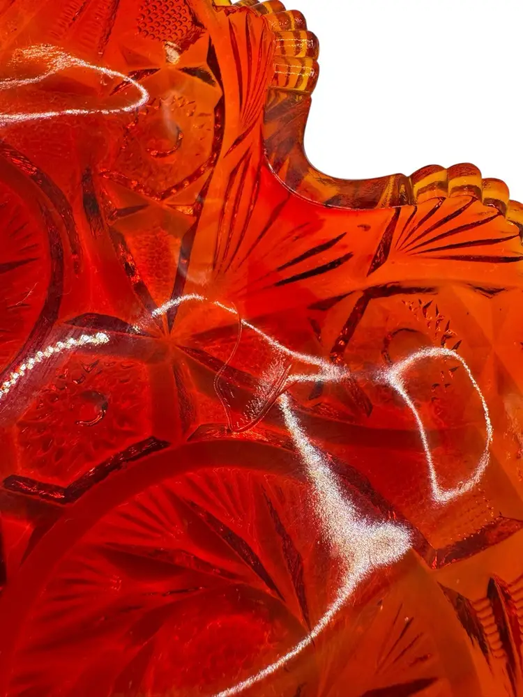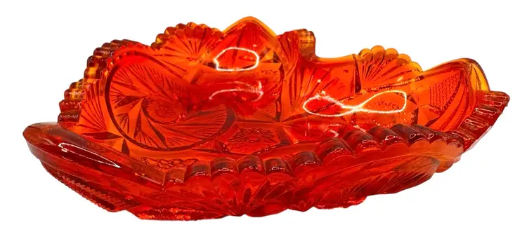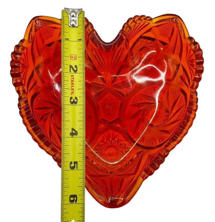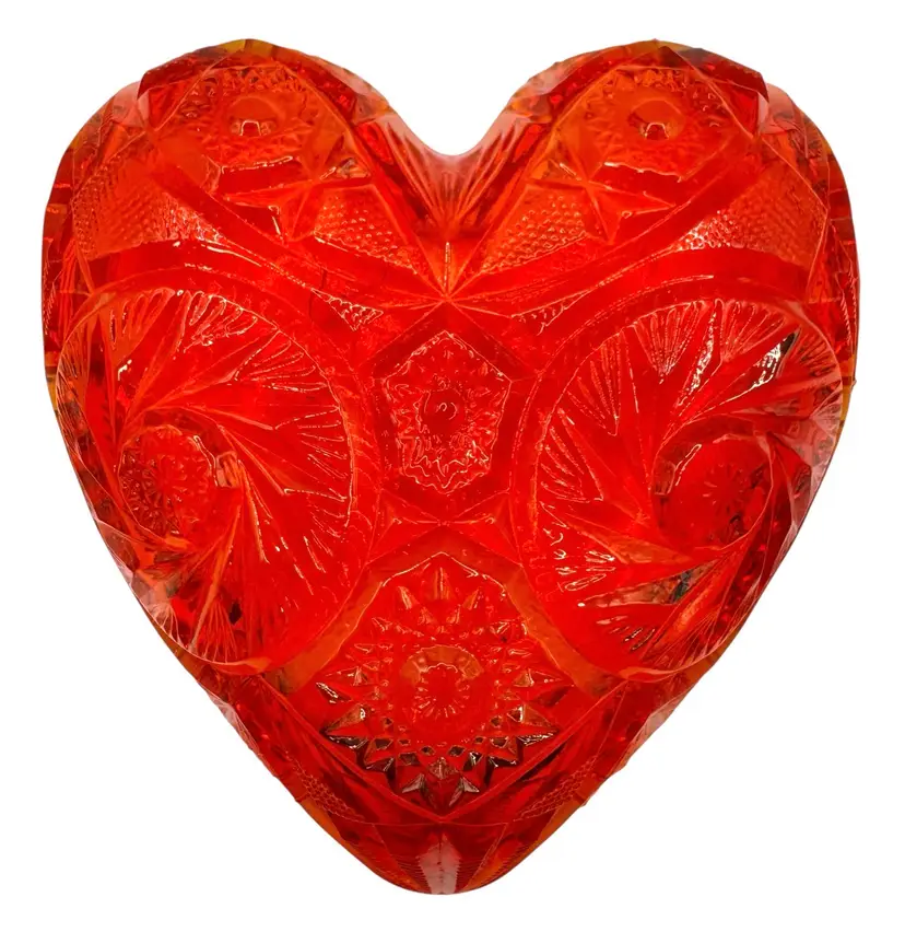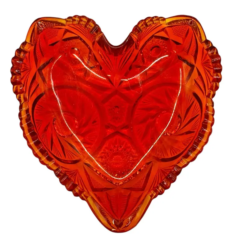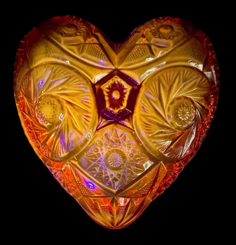 Heart shaped dish with a pressed pinwheel & star pattern. It has an orange glow on the bottom and outer edges.