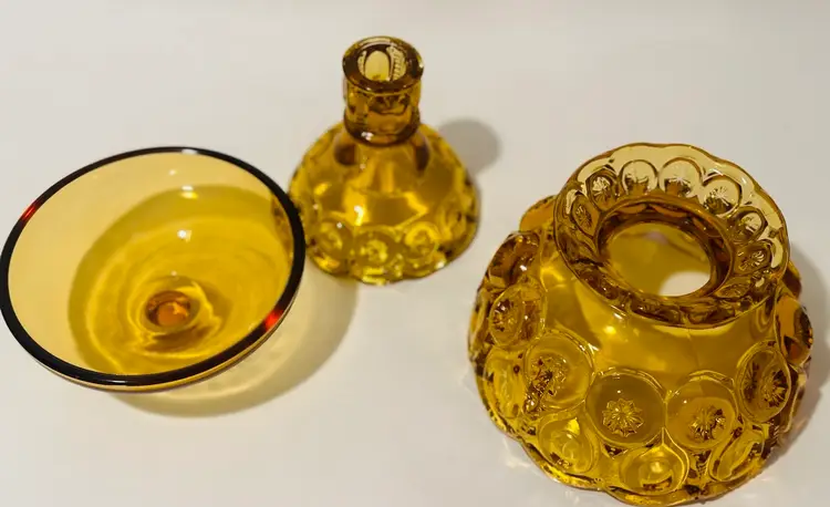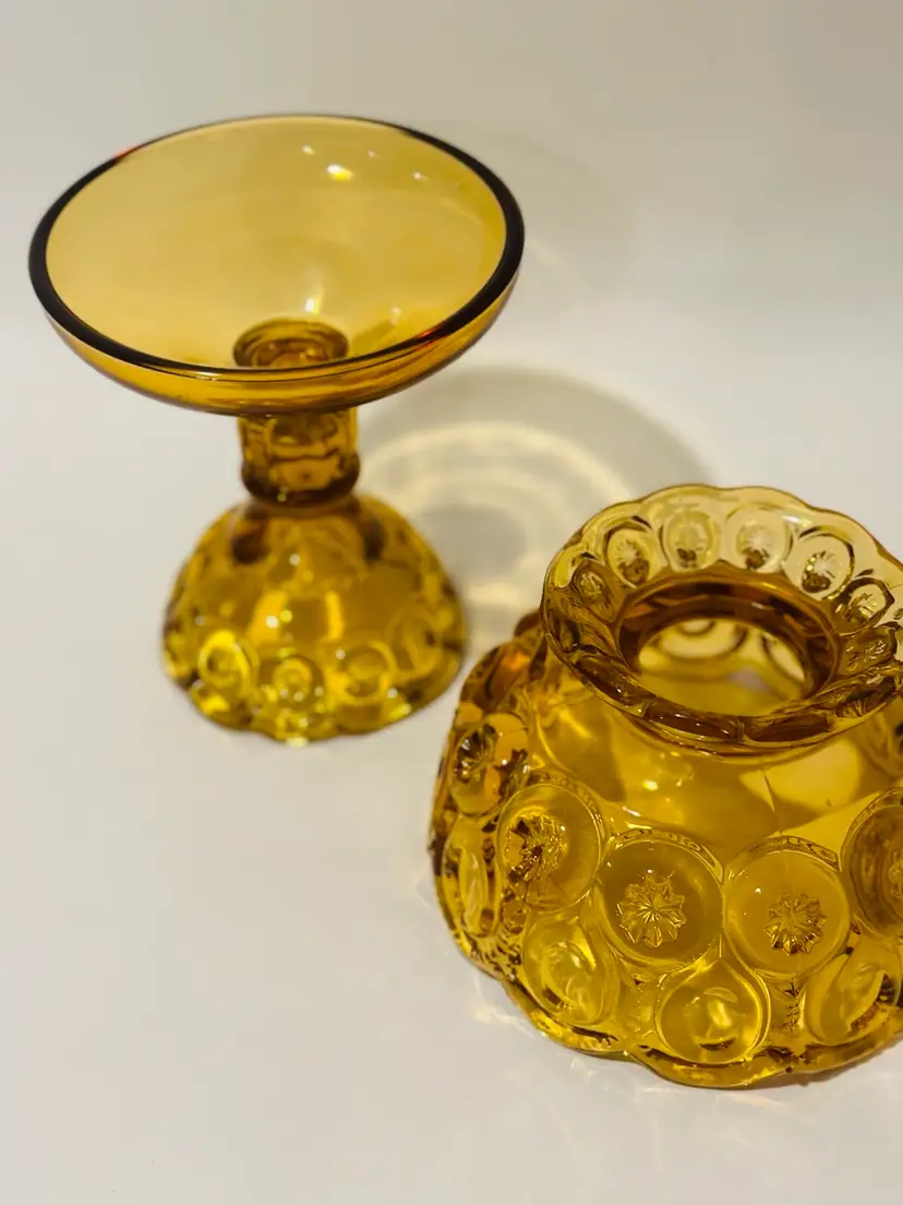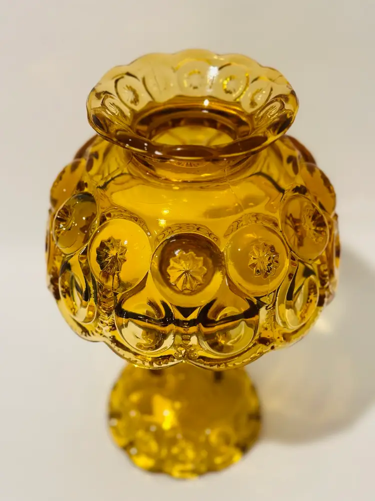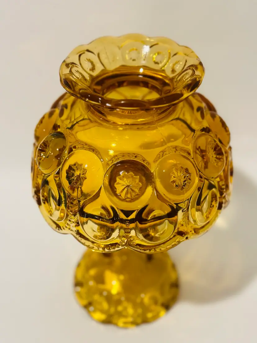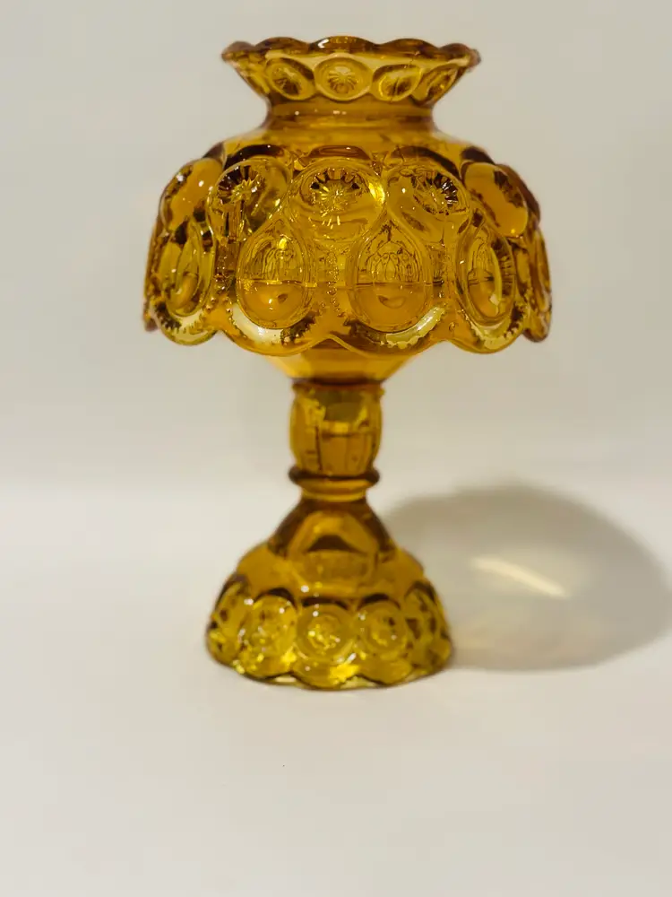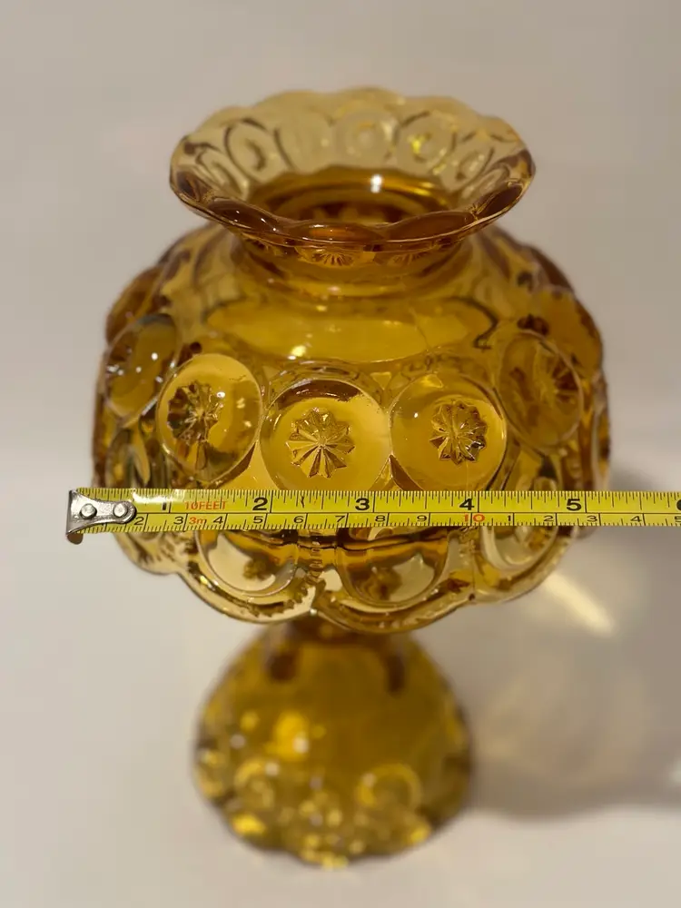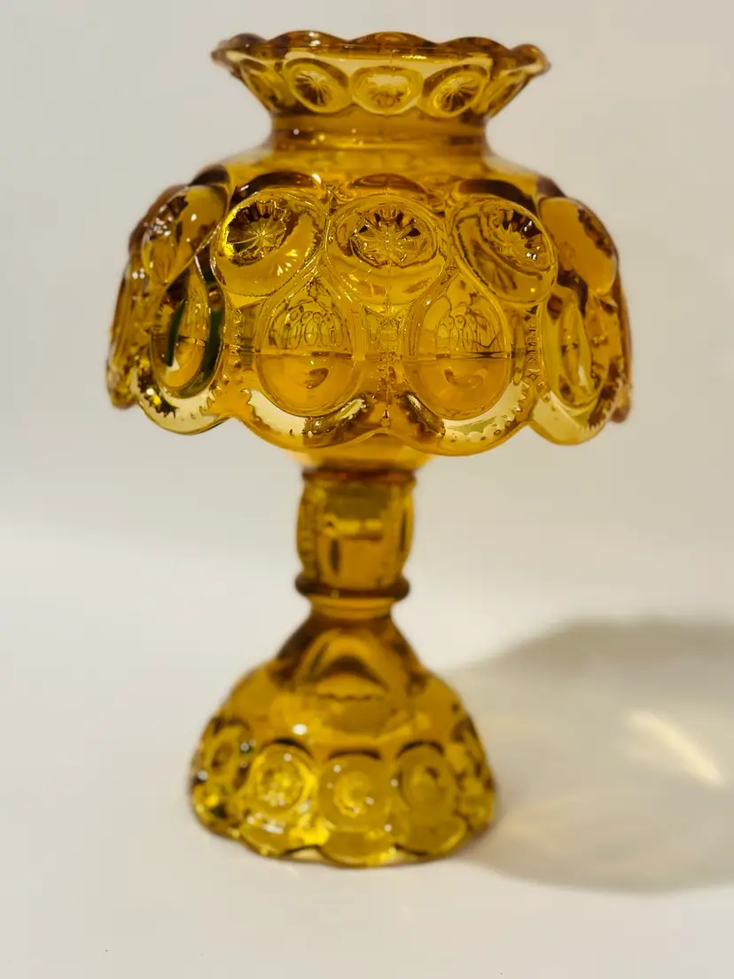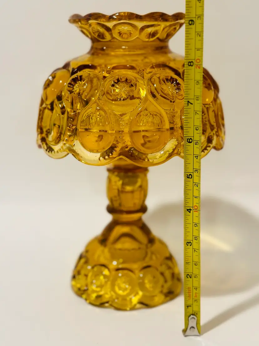 Add a touch of magic to your decor with this stunning vintage L.E. Smith Moon and Stars fairy lamp. Crafted from amber glass with a pressed glass production style, this 3-piece lamp features a beautiful moon and star pattern that will transport you to a whimsical world. Measuring 9.5 inches high and 6.25 inches wide, this lamp makes for a perfect addition to any room.