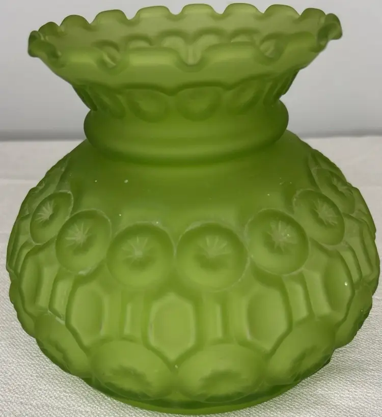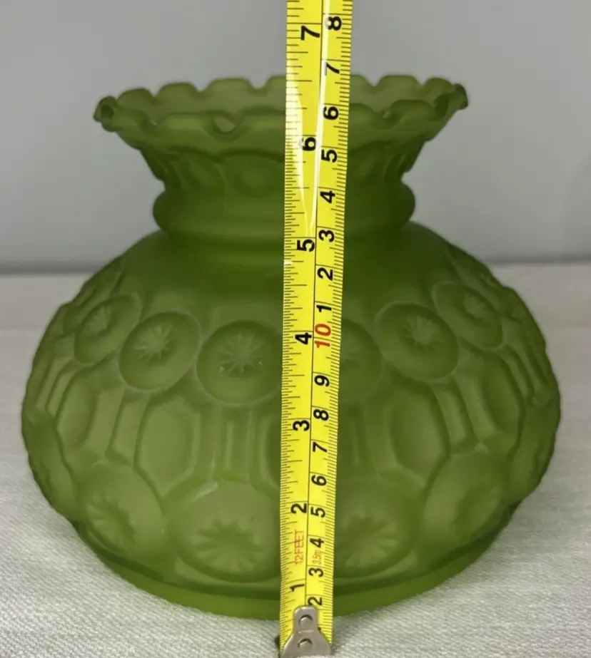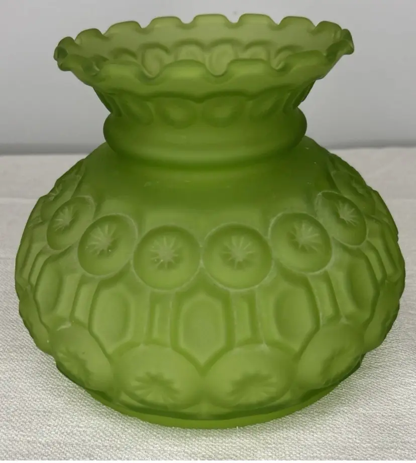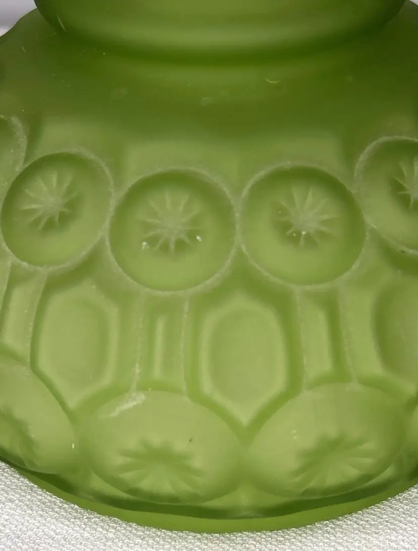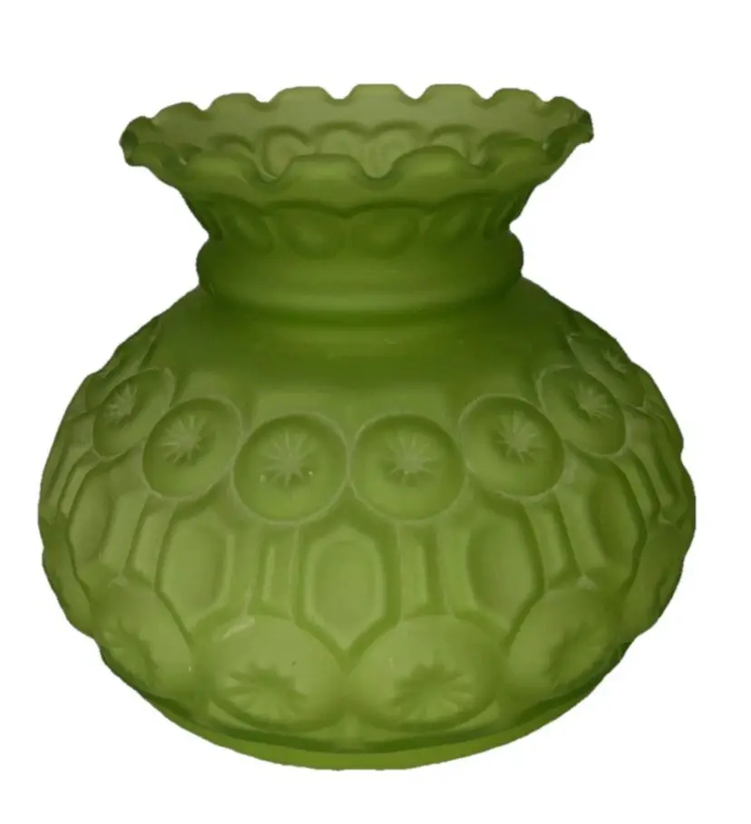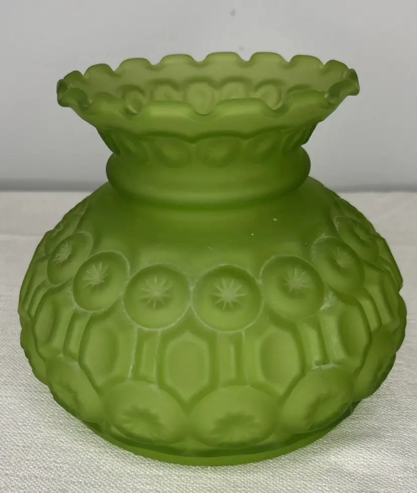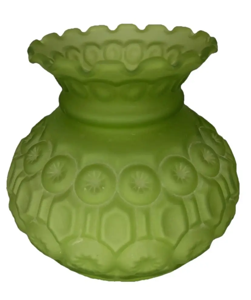 The Vintage L E SMITH Satin Green Glass Lampshade features a charming moon and stars pattern design in a satin green color. This original piece from the 1960s is made of glass, adding a touch of elegance to any lamp with its unique design. Perfect for collectors or those looking to add a retro touch to their home decor, this lamp shade is a timeless beauty that exudes charm and nostalgia. This lamp shade measures 6.5" inches tall 5" inches wide at the top rim and 7" inches wide at the bottom rim or fitter. Vintage L E SMITH Satin Green Moon & Stars Glass Lampshade 7" inch Fitter 1960's is in excellent vintage pre-owned condition, with No chips, cracks or repairs. However, it does have tiny "flea bites" on the bottom rim which is consistent with its vintage pre-owned condition. This is a hard to find item!