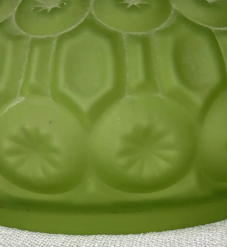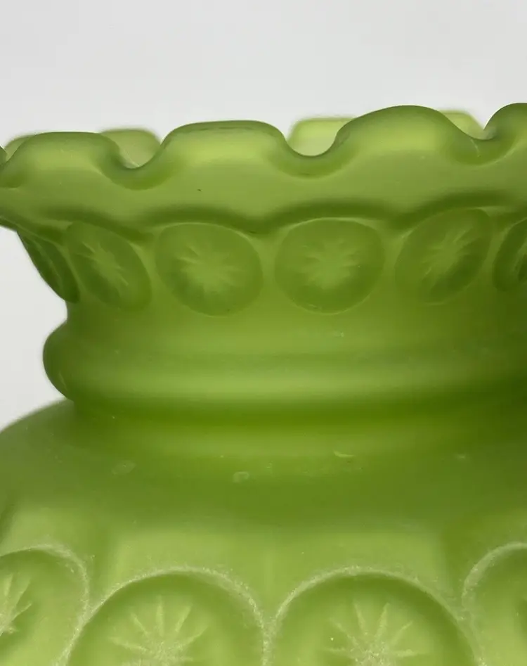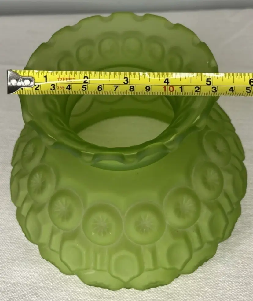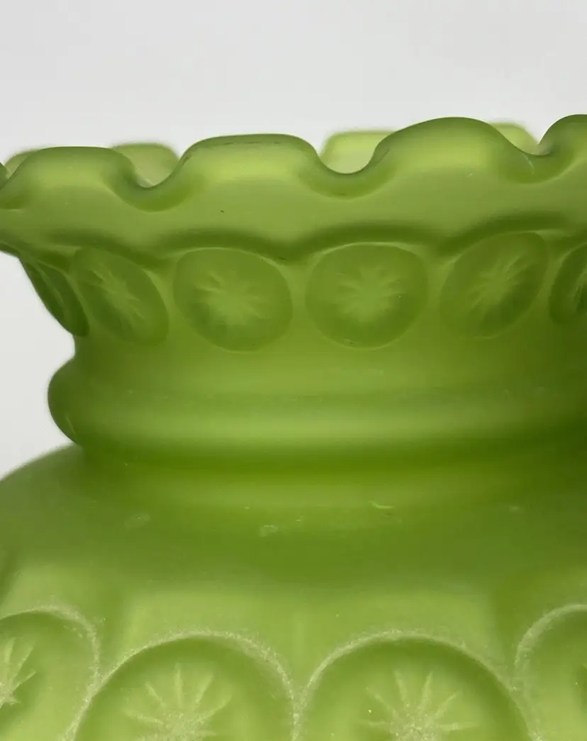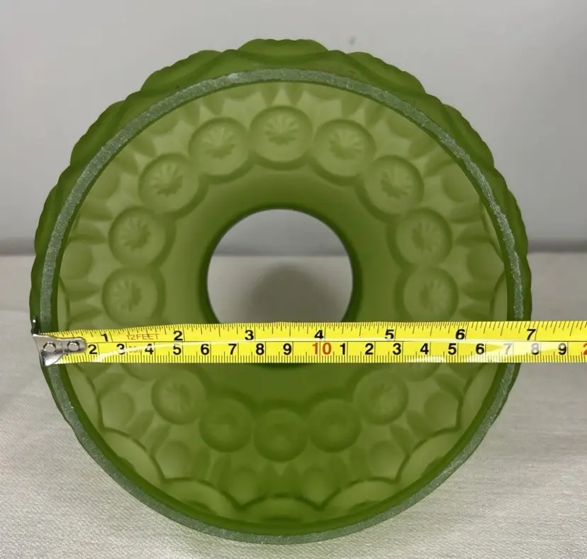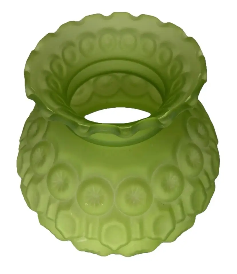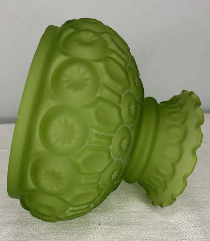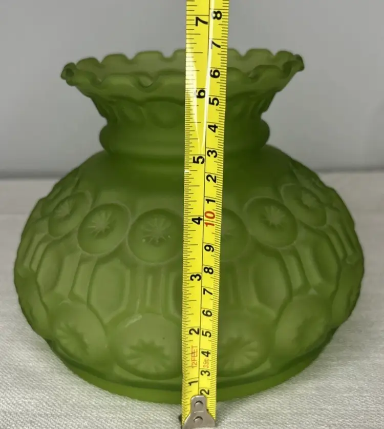 The Vintage L E SMITH Satin Green Glass Lampshade features a charming moon and stars pattern design in a satin green color. This original piece from the 1960s is made of glass, adding a touch of elegance to any lamp with its unique design. Perfect for collectors or those looking to add a retro touch to their home decor, this lamp shade is a timeless beauty that exudes charm and nostalgia. This lamp shade measures 6.5" inches tall 5" inches wide at the top rim and 7" inches wide at the bottom rim or fitter. Vintage L E SMITH Satin Green Moon & Stars Glass Lampshade 7" inch Fitter 1960's is in excellent vintage pre-owned condition, with No chips, cracks or repairs. However, it does have tiny "flea bites" on the bottom rim which is consistent with its vintage pre-owned condition. This is a hard to find item!
