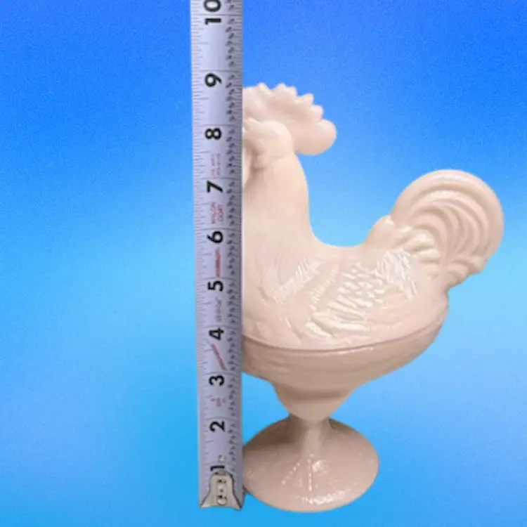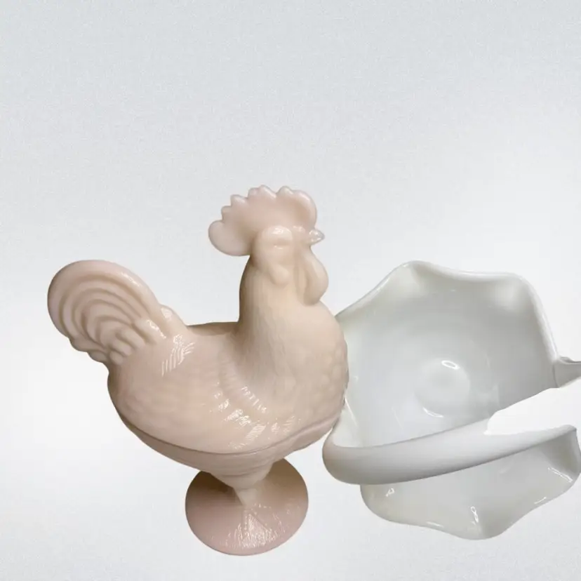 Hard to find LE Smith pink Milk Glass Standing Rooster Candy/Trinket Dish with lid. The pink doesn’t show well in the pictures, the white basket is for color reference, it is not included in the sale.