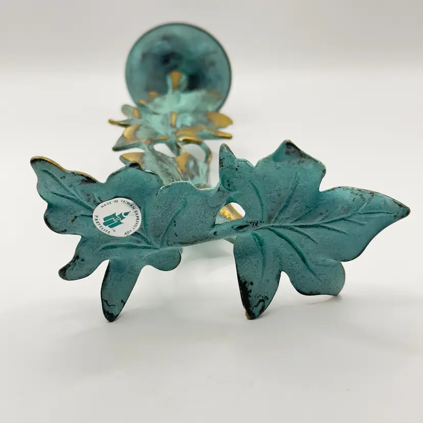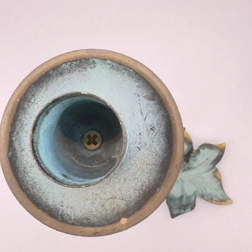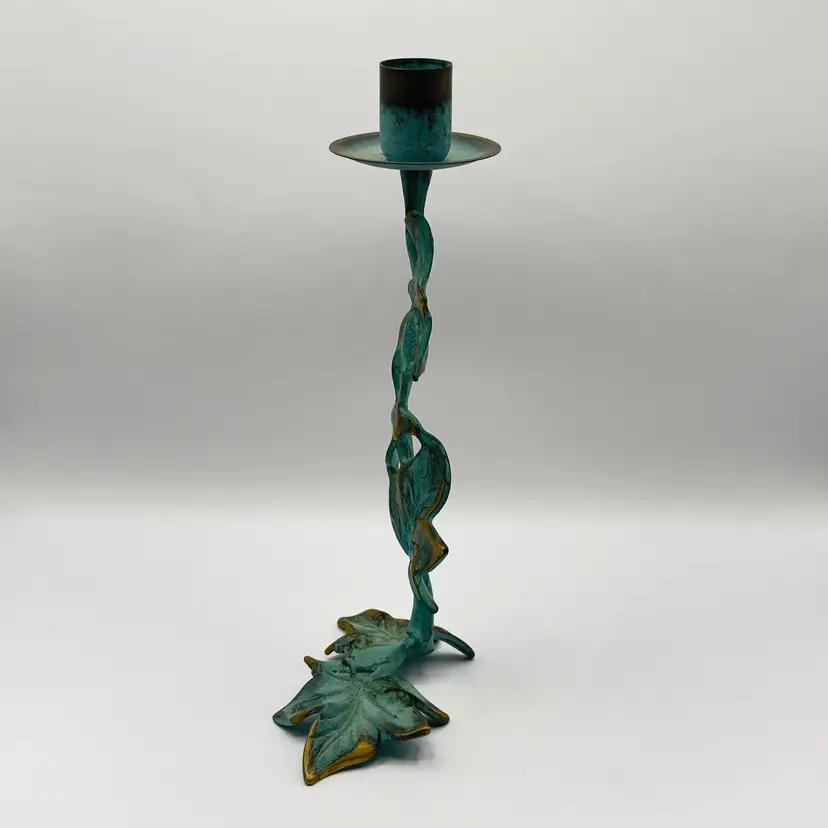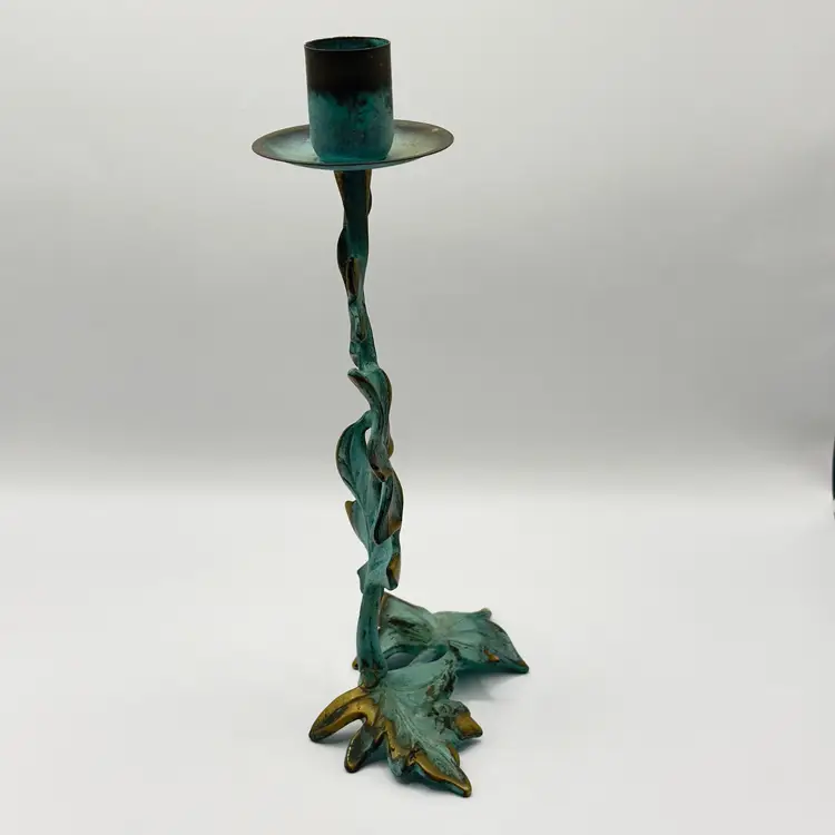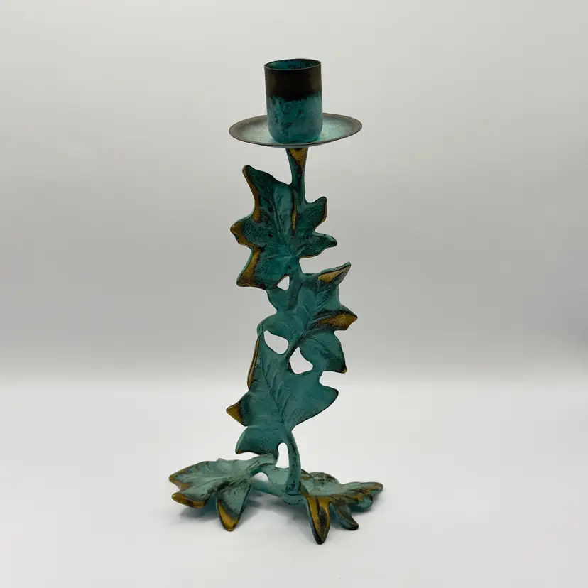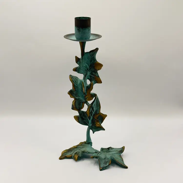 Add a touch of nature to your space with this vintage metal candle holder featuring a charming leaf motif. Its rustic design and patina finish make it a unique accent piece for any room. Perfect for creating a cozy atmosphere or as a thoughtful gift. Excellent condition. Measures 4.5x9.x1. Weighs 1lb.