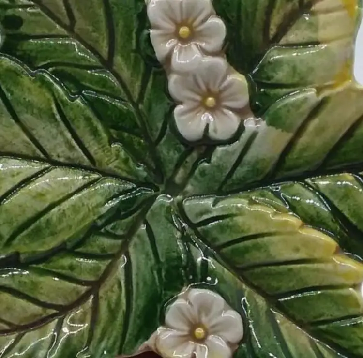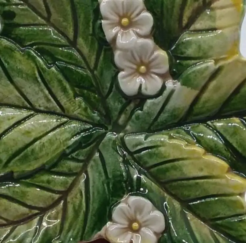 This charming vintage ceramic dish is shaped like a leaf and adorned with delicate white flowers. Perfect for adding a touch of nature to your home decor, it can be used as a trinket dish, candy dish, or simply as a decorative piece. In excellent vintage condition with no chips or cracks.