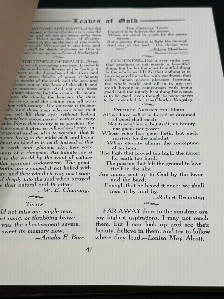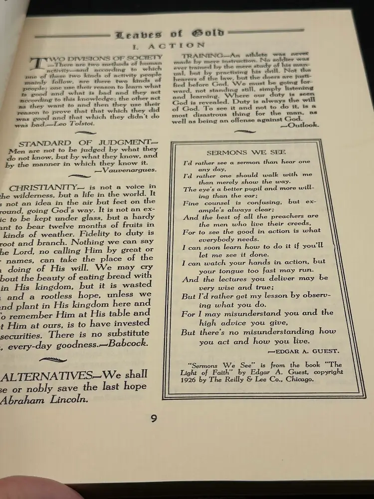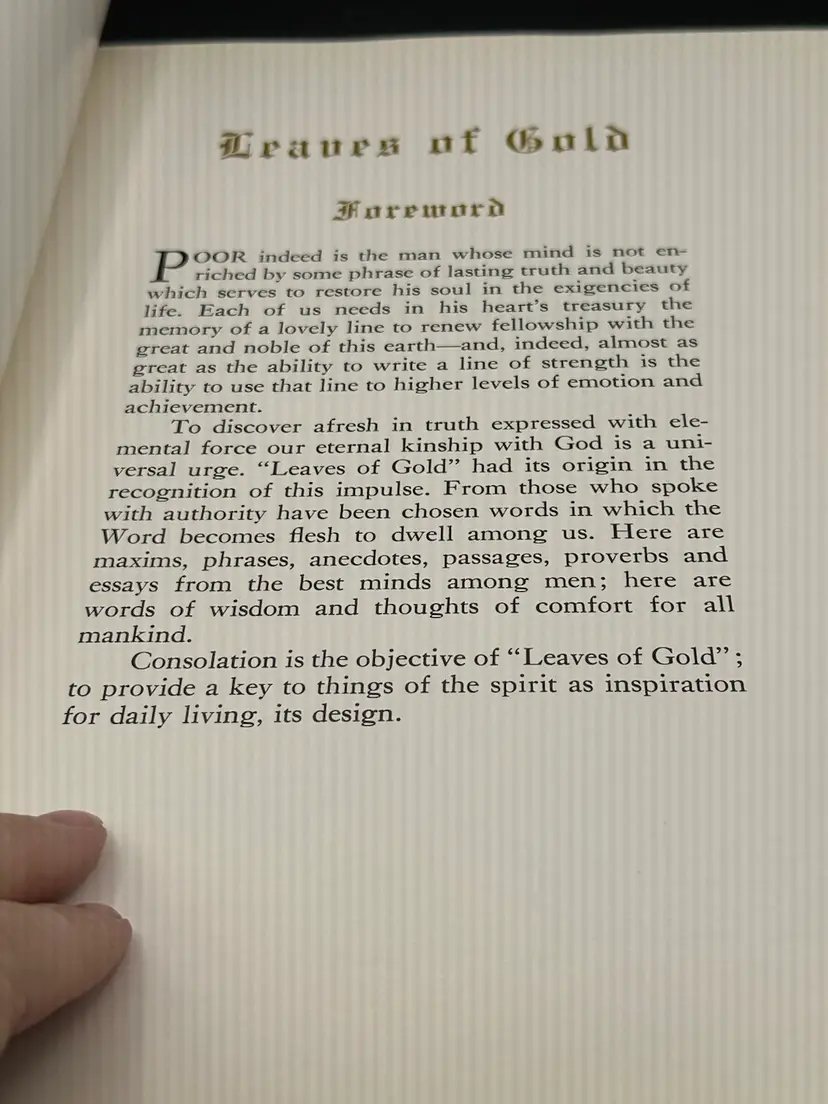 This 1948 book titled "Leaves Of Gold" is a beautiful anthology of prayers, memorable phrases, and verse and prose written by Clyde Francis Lytle. The hardcover binding and large print make it a special addition to any collection. The book was published by Coslett Publishing Company and is an original piece. The topic of this book is anthologies and the subject is history. It is written in English and is a great addition to any book collection