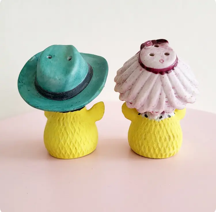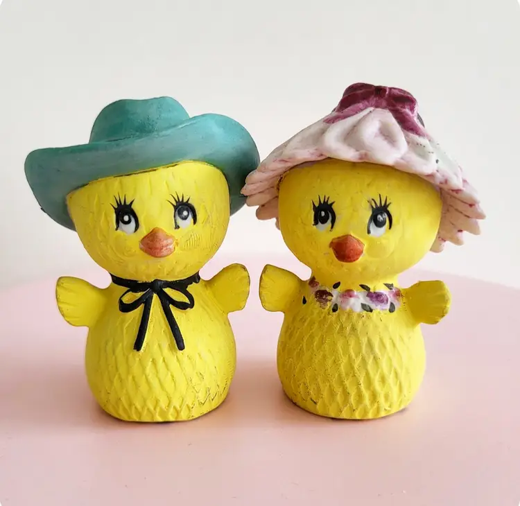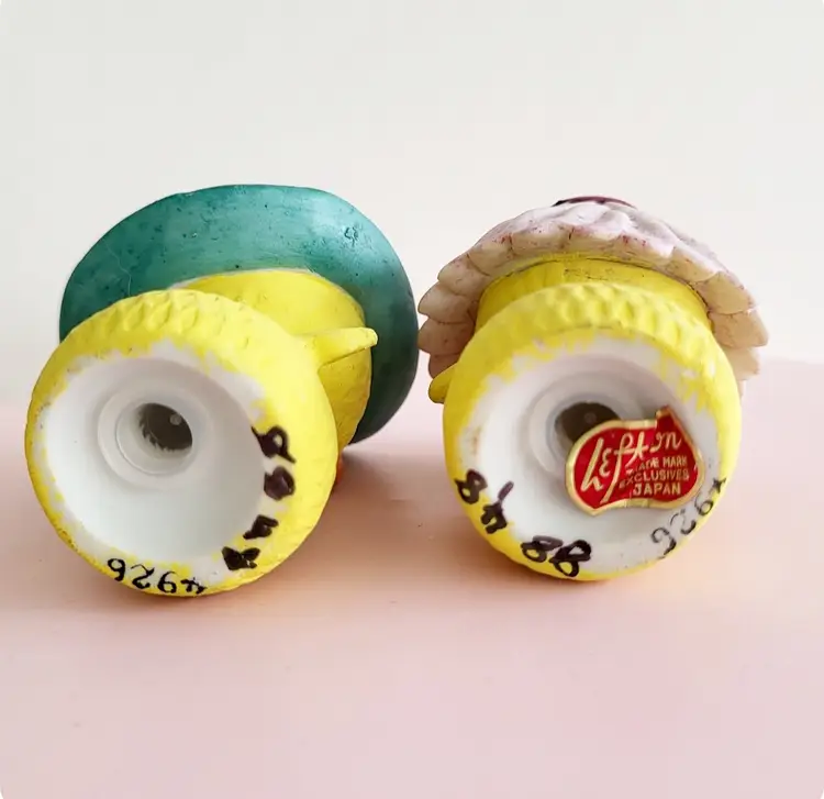 Vintage Lefton Japan bisque ceramic shakers are a harder to find set! Girl bird has a flower hat, boy is sporting a cowboy hat. No chips, both have stoppers, foil sticker present. These came from a lady's collection that had over 14,000 shakers, she numbered each set for her records- these have 8848 in sharpie on the bottom. They measure 2.5 in tall x 2 in wide.