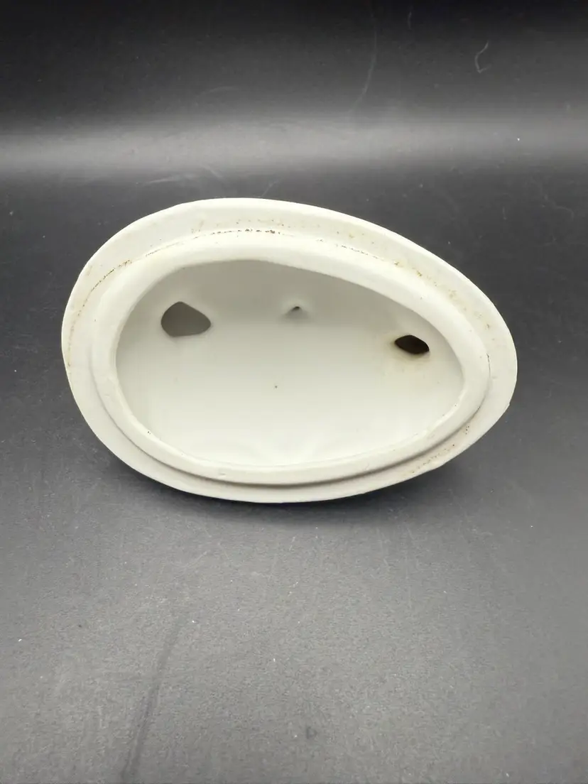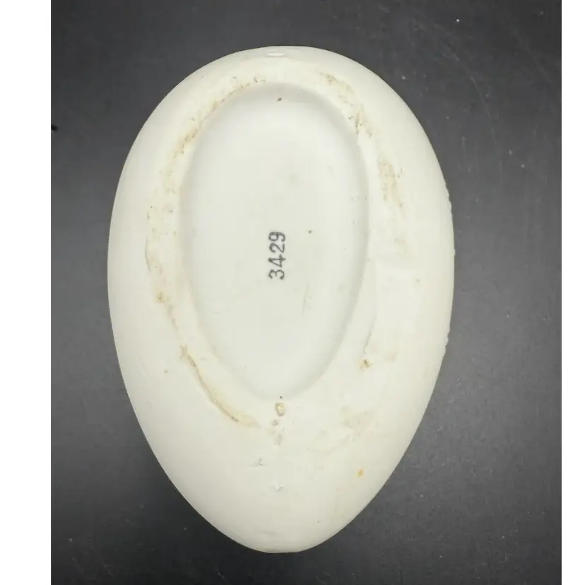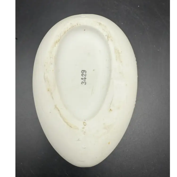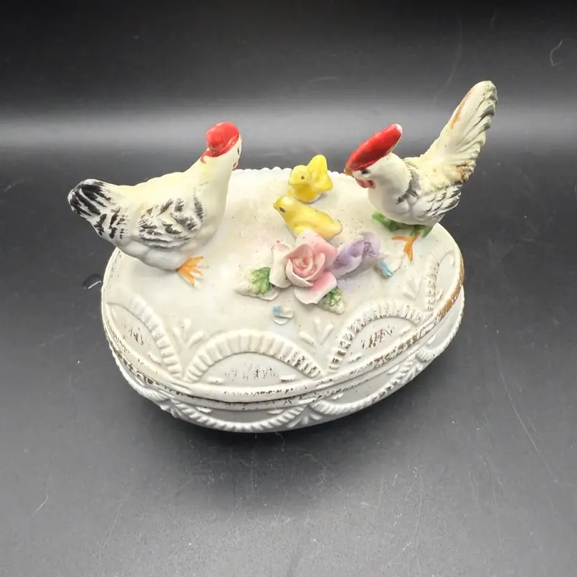 Lovely bisque egg-shaped trinket box with a rooster, chicken and their chicks on top. Measures 4 in high and 4 in long.