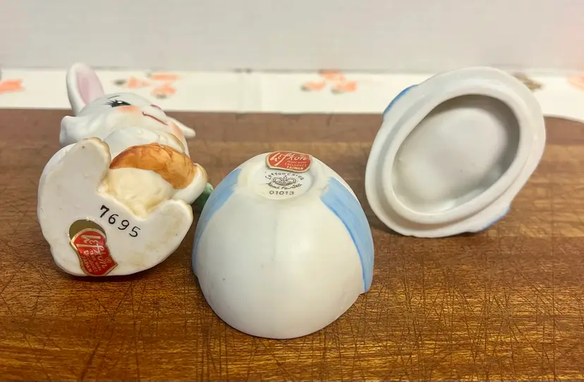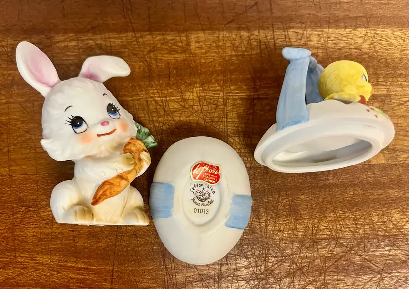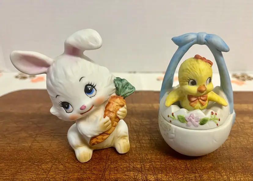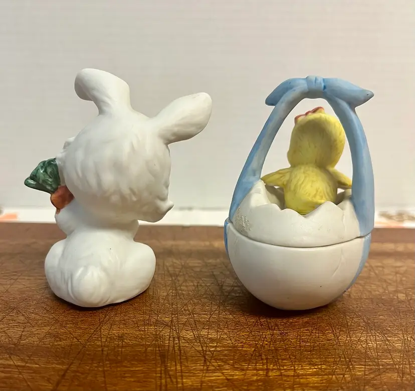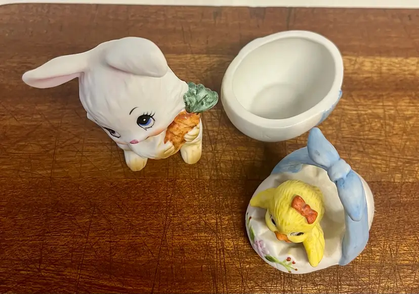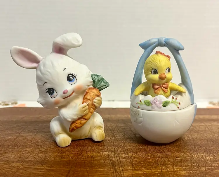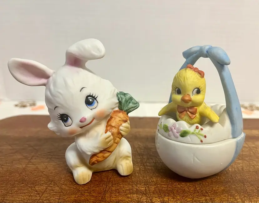Vintage porcelain figurines Lefton Easter collectibles, featuring a bunny holding a carrot and a chick hatching from an egg basket trinket box. The chick in the egg is a hand painted two-piece covered dish, often used for small trinkets. They are popular for spring and Easter decorative displays. In good condition with minor surface wear or scratches and no chips or cracks.