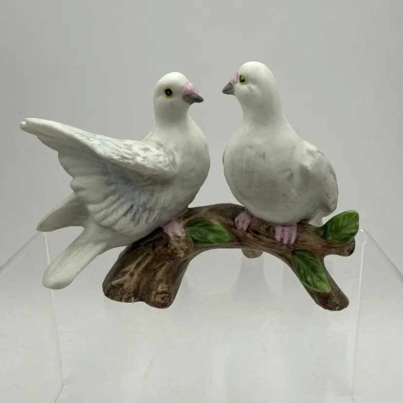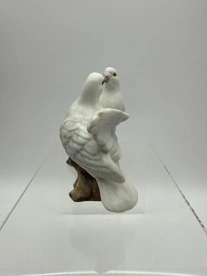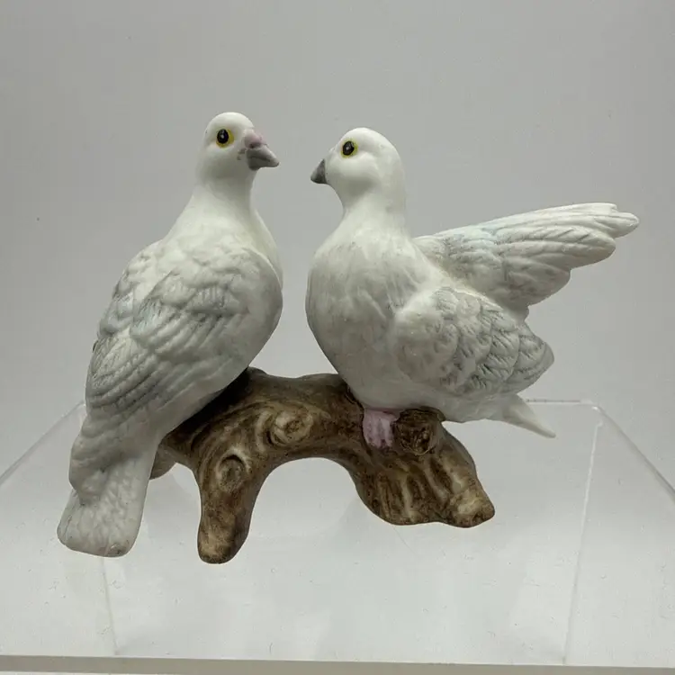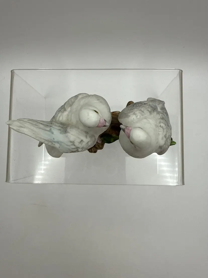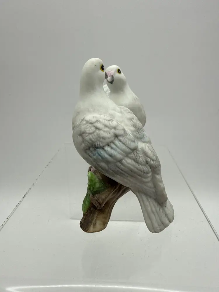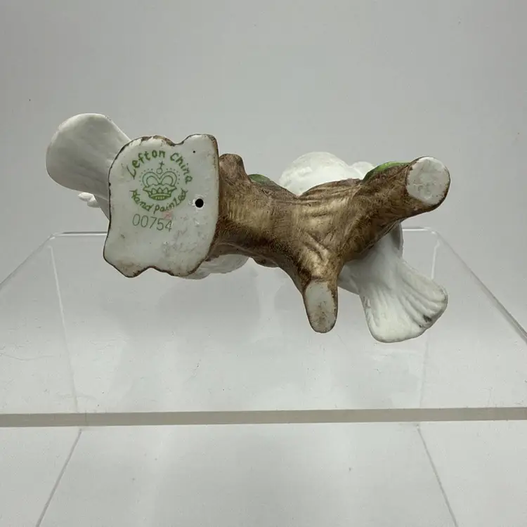 Collectible porcelain figurine from Lefton's "Love Birds" collection, often symbolizing love or used as a gift for weddings and anniversaries. Manufactured around 1987