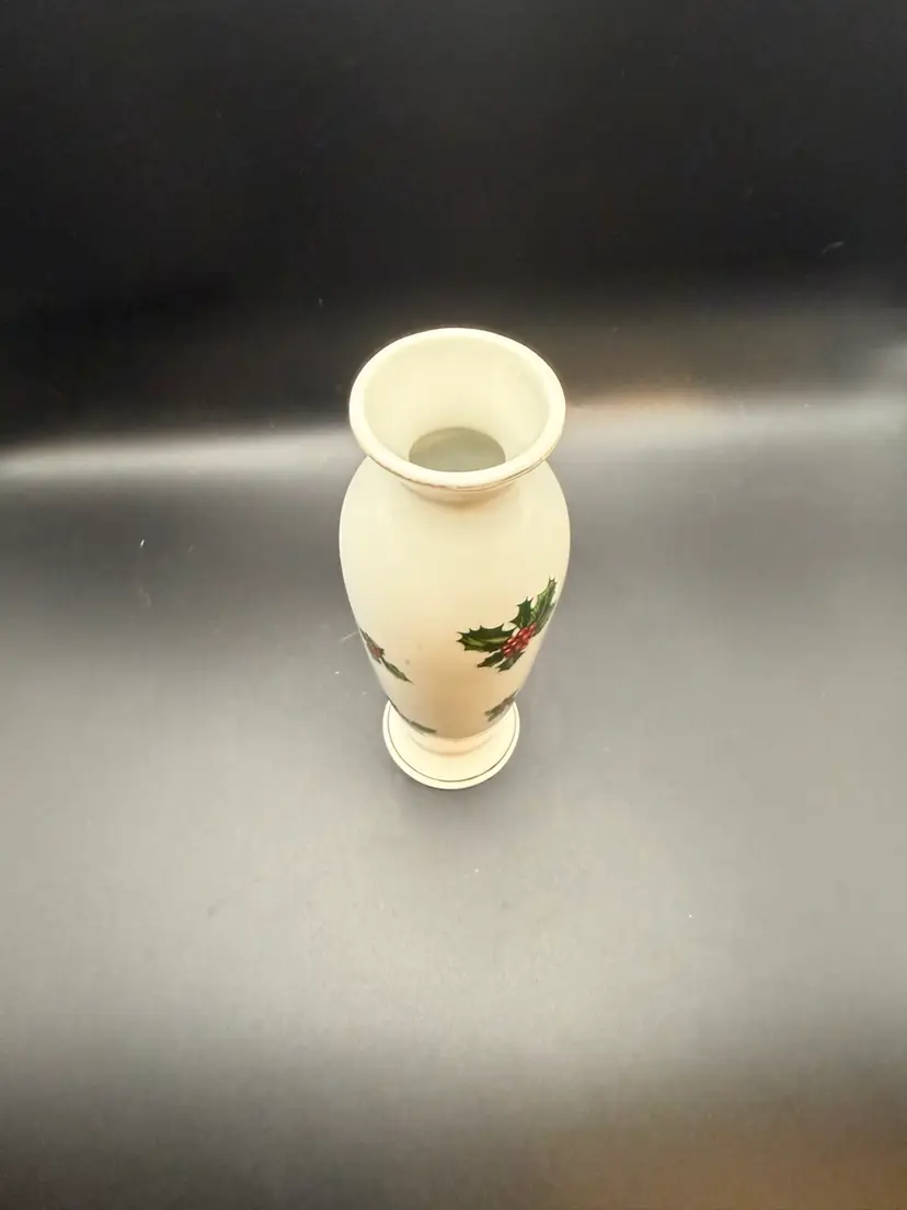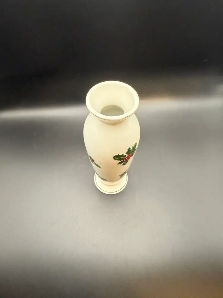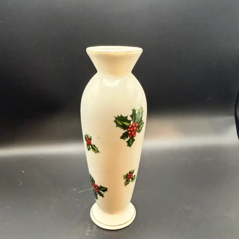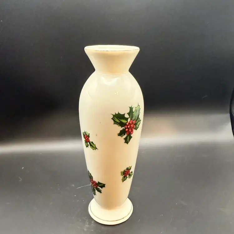 Elegant bud vase designed by Lefton made of porcelain with gold trim, and Holly berries on creamy white. Numbered on bottom.