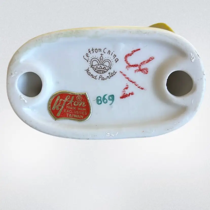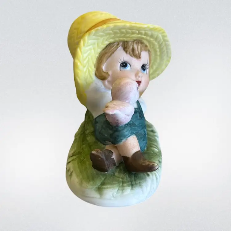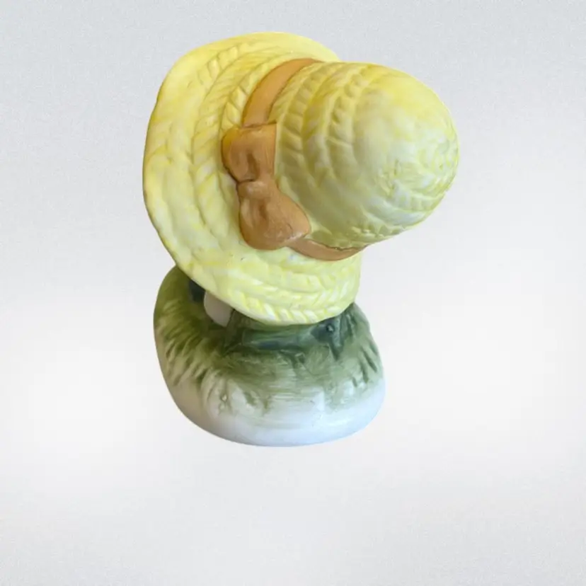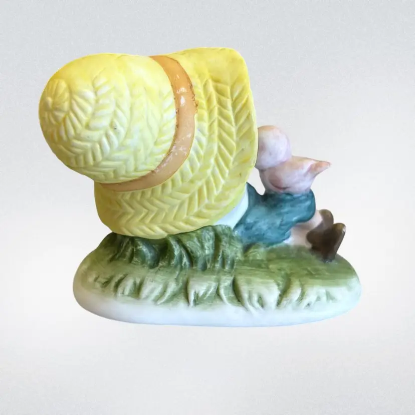 Vintage Lefton porcelain figurine featuring a child in a straw hat with a pink bird perched on their knee.