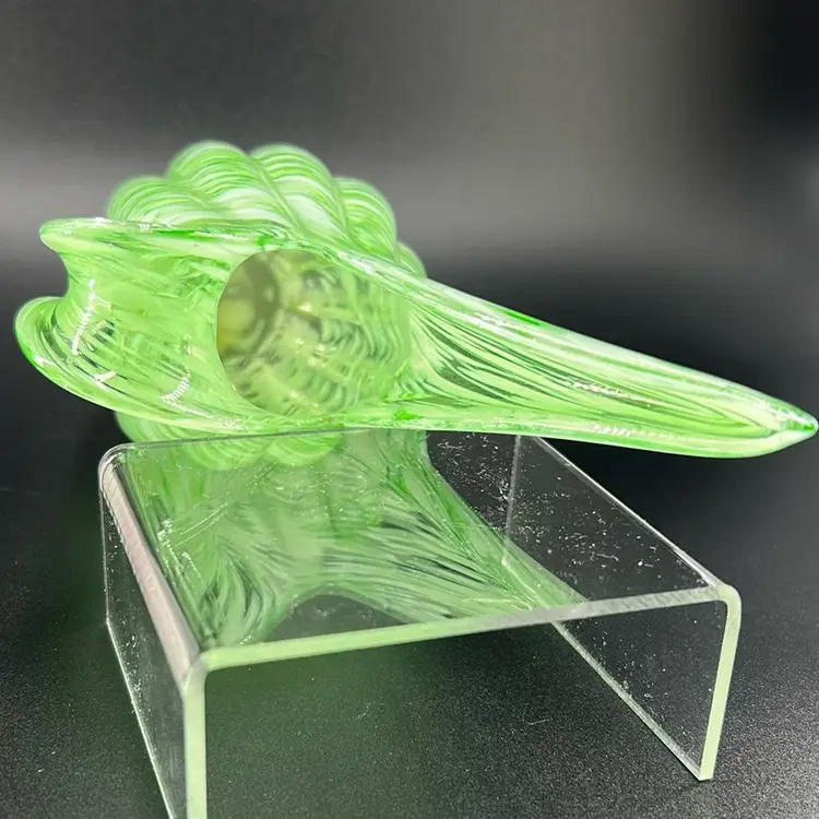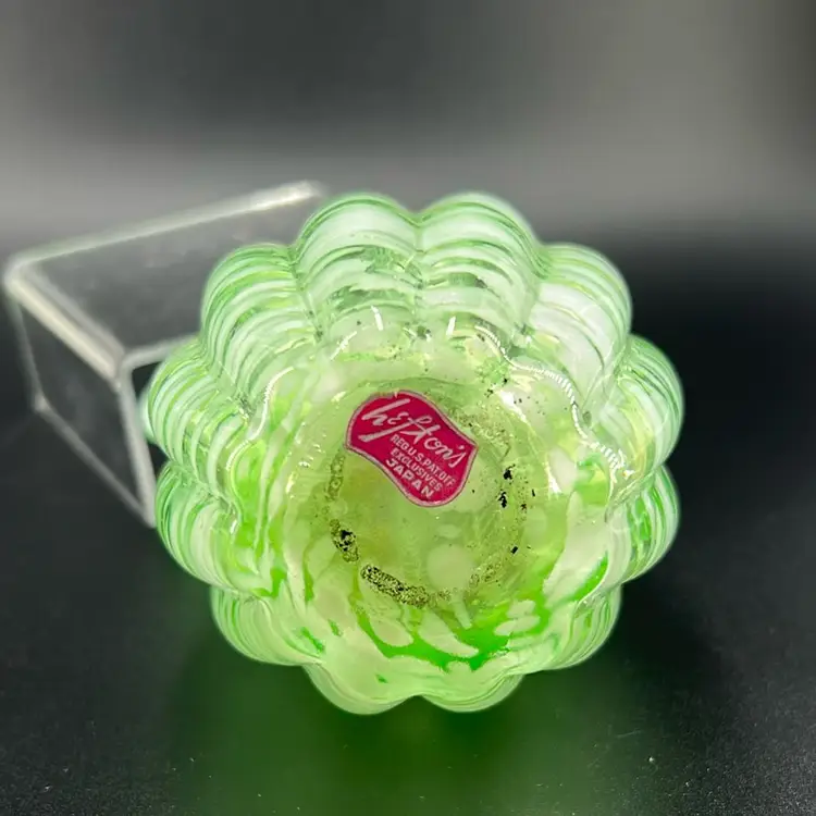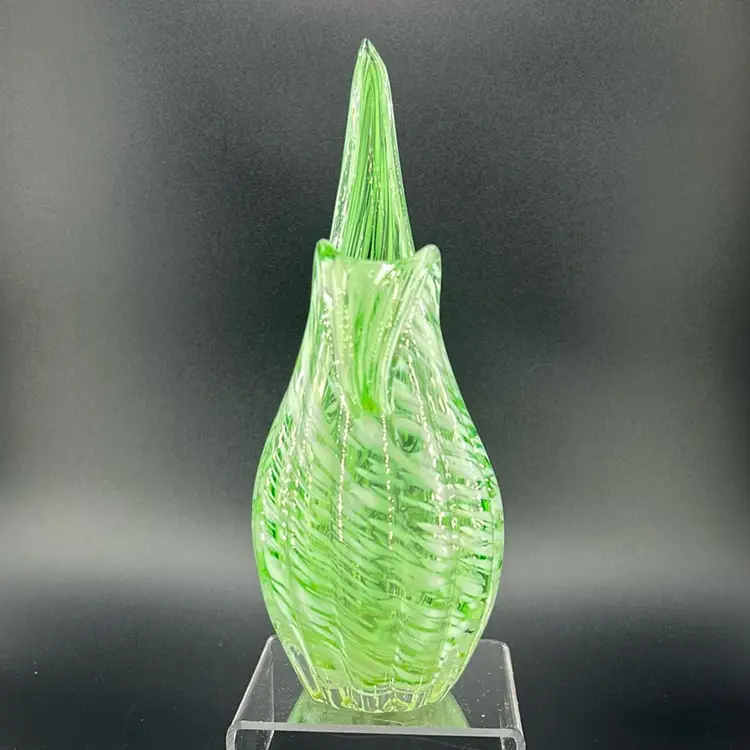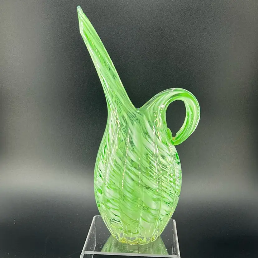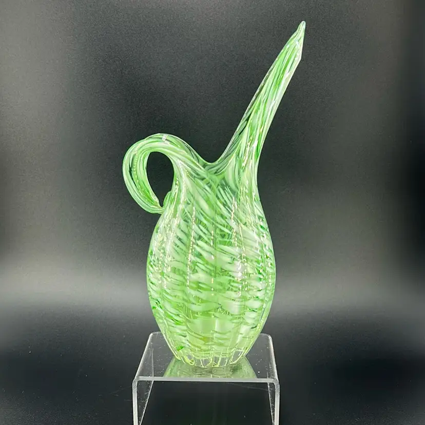 This piece is a vintage art glass pitcher or vase with a distinct green and white swirl pattern. It was produced by a Lefton in Japan it features a long spout and is often compared to Murano style glassware. It stands approximately 8 inches to the spout and about 3 1/2 inches across. There are no chips or cracks.