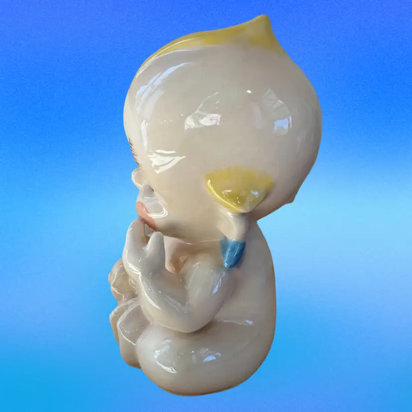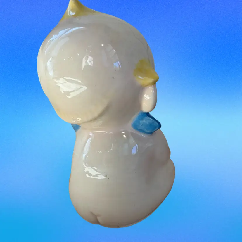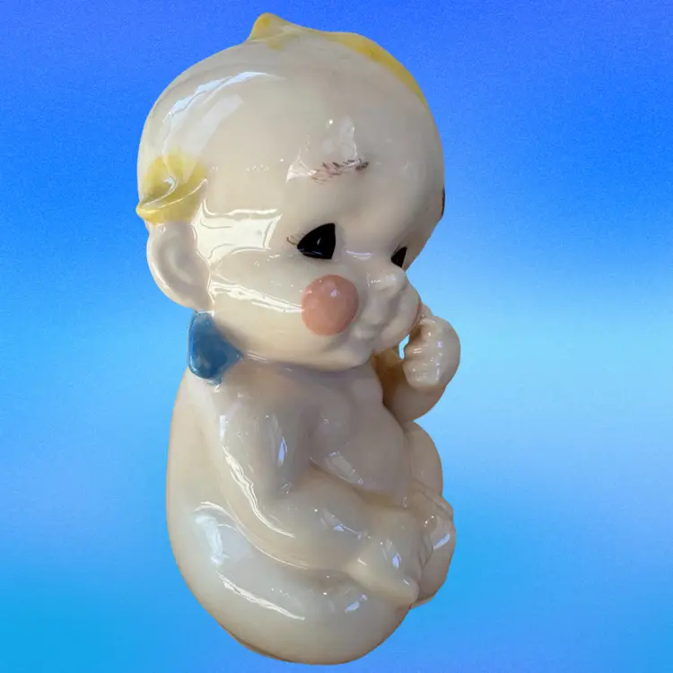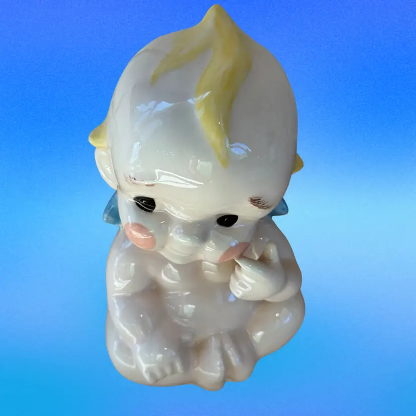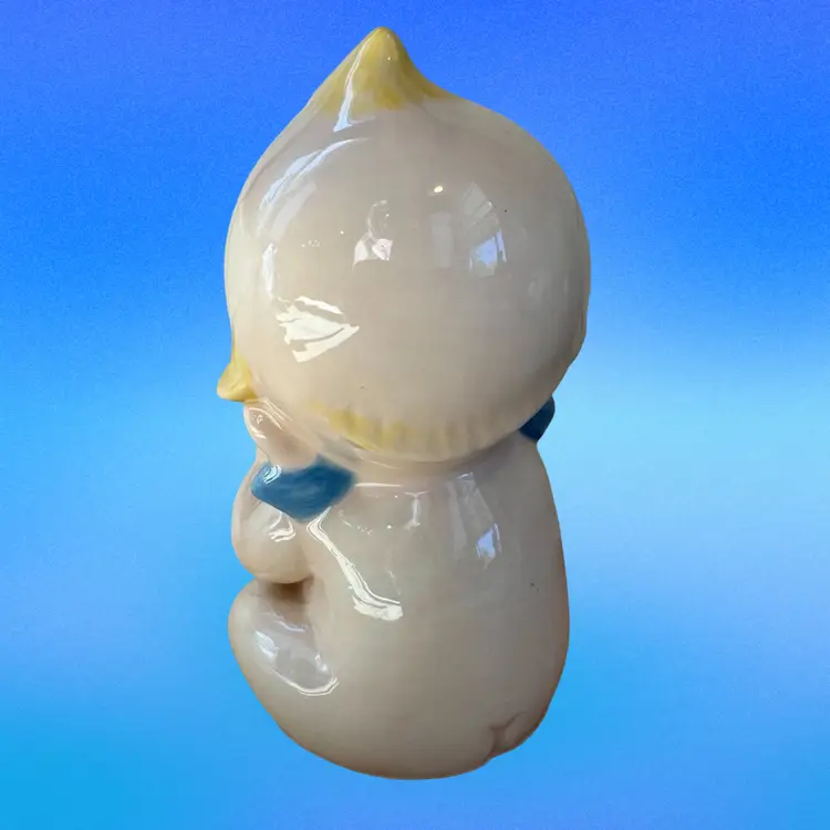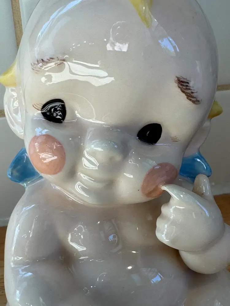 This is an adorable vintage Lefton Kewpie bank (145N) with blue wings. It measures 7" tall to the tip of his curlie cue hair! See pictures of actual item. Excellent condition.