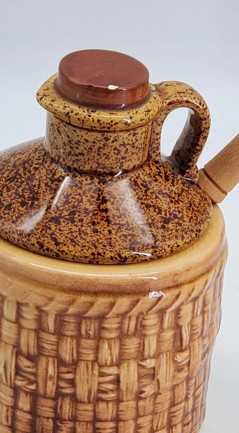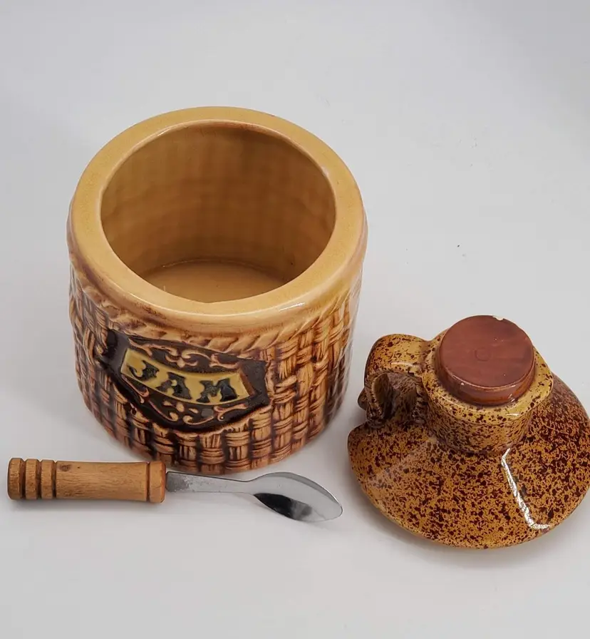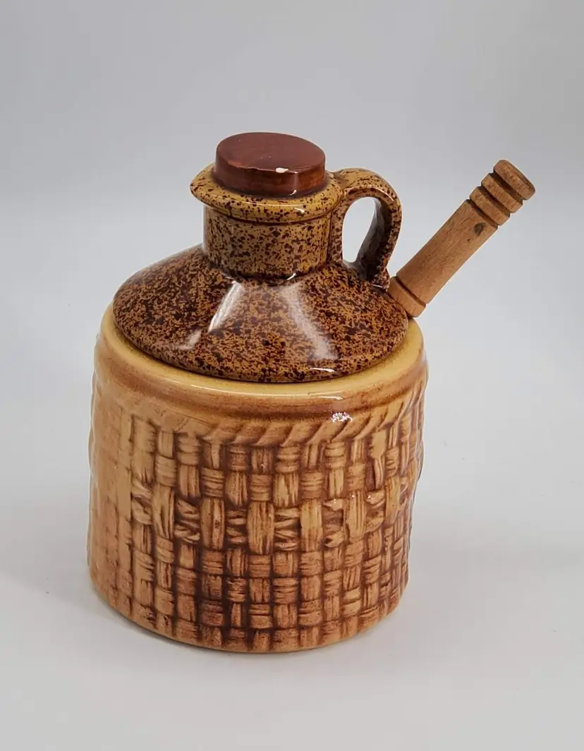Made in Japan with a glossy, brown ceramic finish and basket weave pattern, it includes the original spoon and lid.