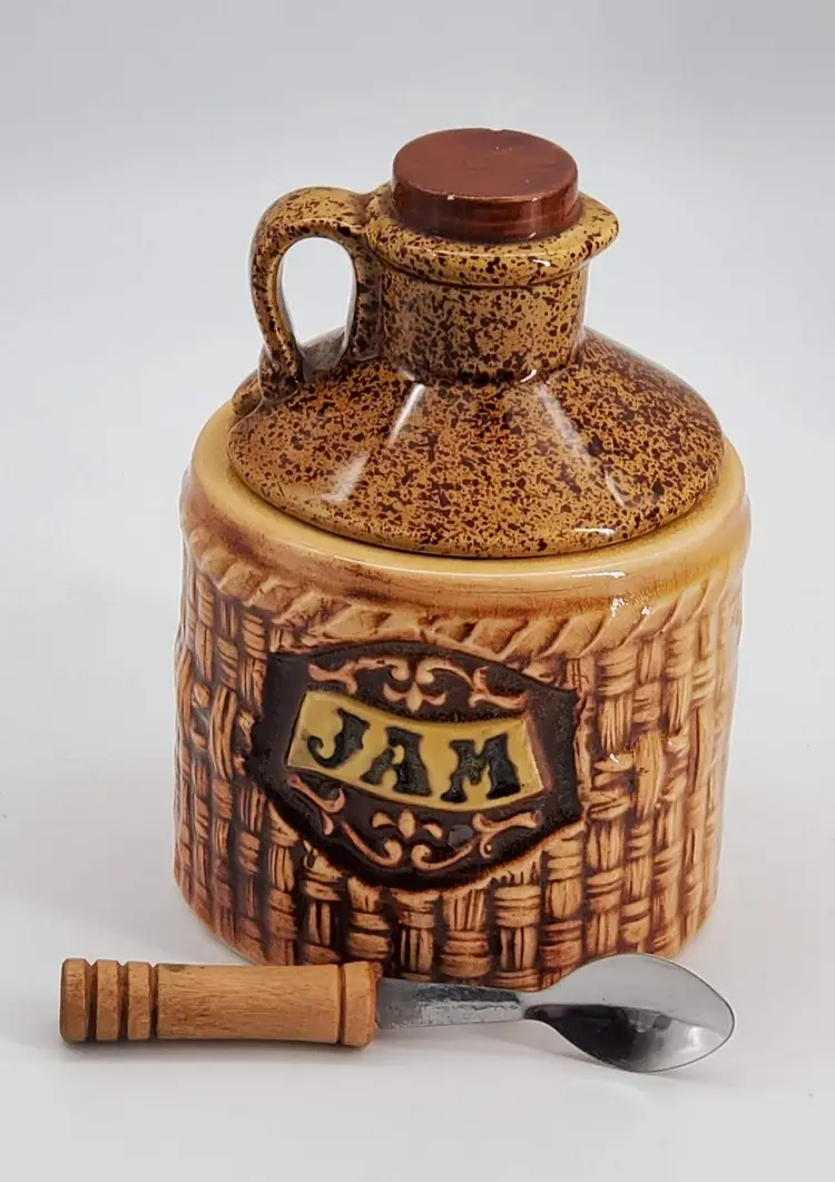 This beautiful vintage Lefton jam/jelly jar jug with an original spoon is a must-have for any lover of Lefton Kitsch.
