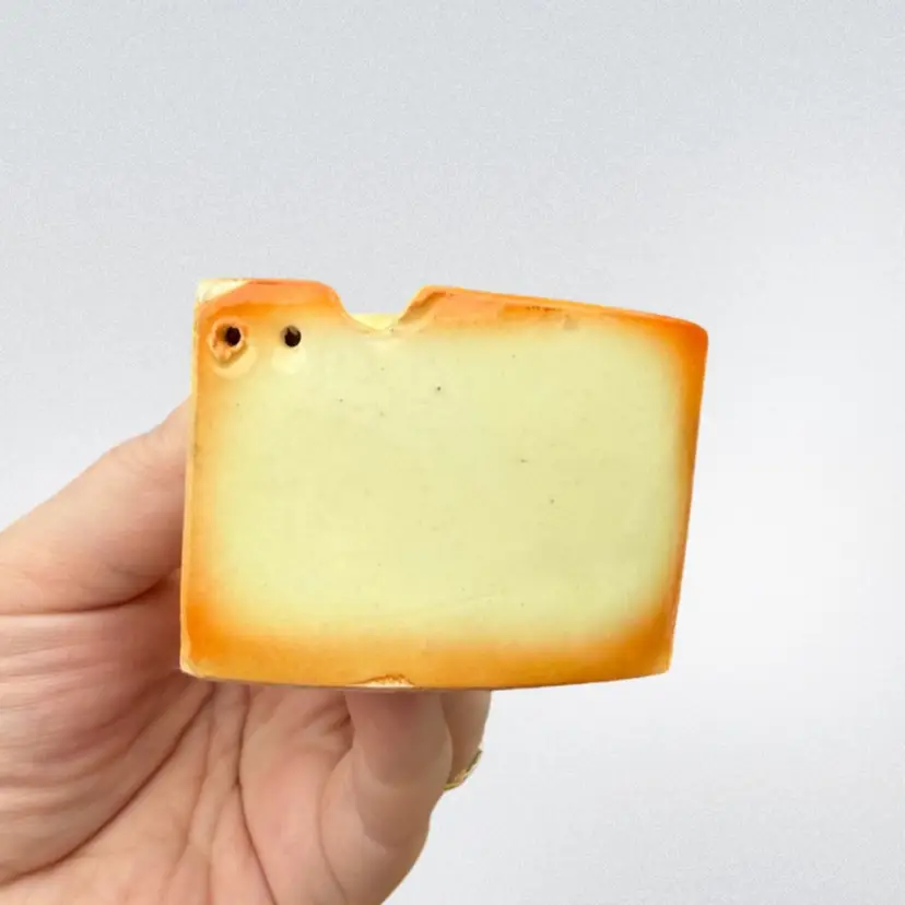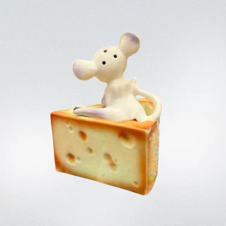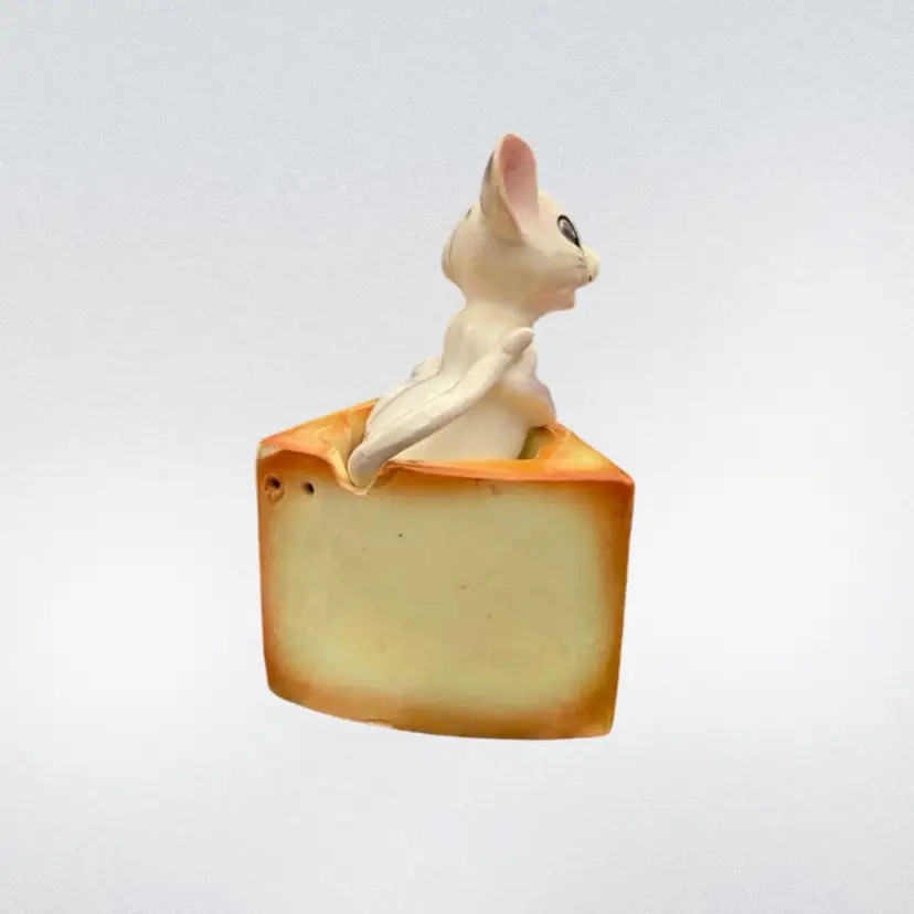 Lefton salt and pepper shakers, made in Japan. Good vintage condition- very minimal paint loss on the cheese wedge, no chips or cracks. The mouse nests into the cheese but could also be displayed separately. About 4in tall when they’re together.