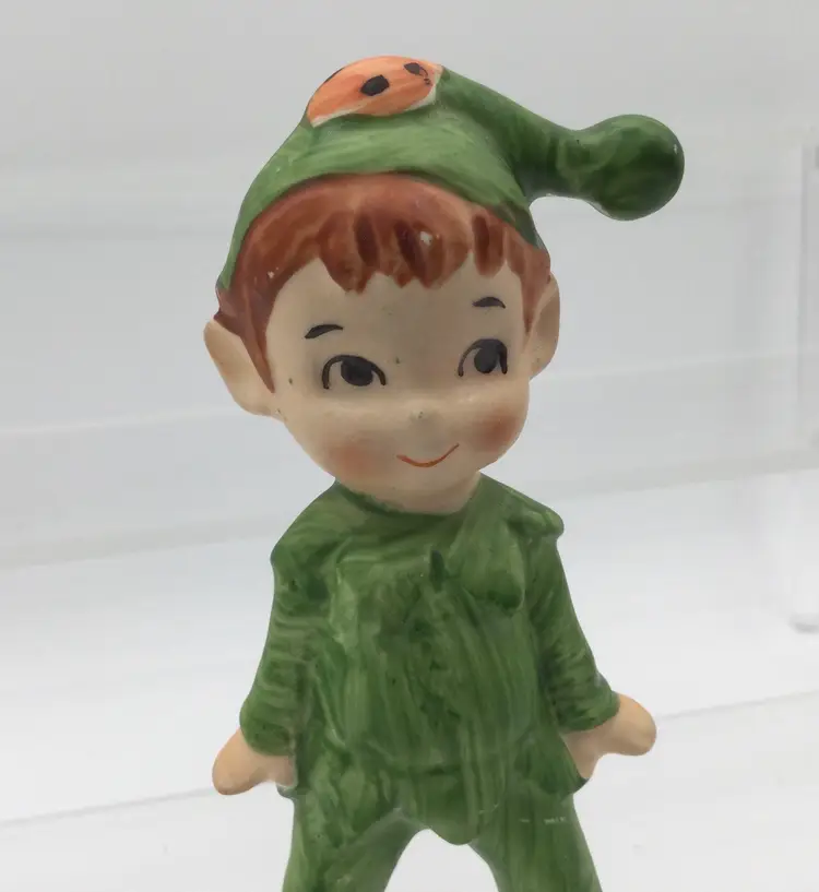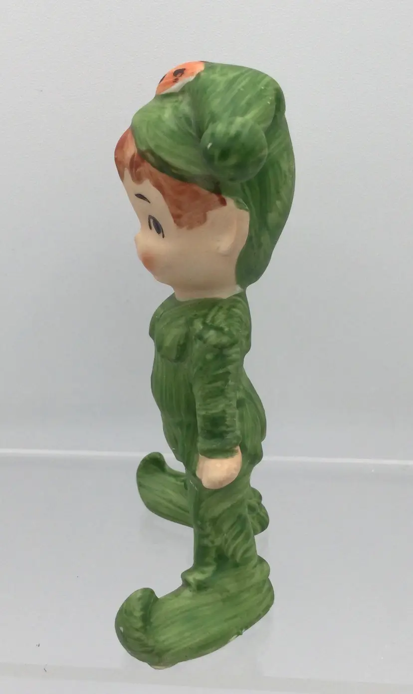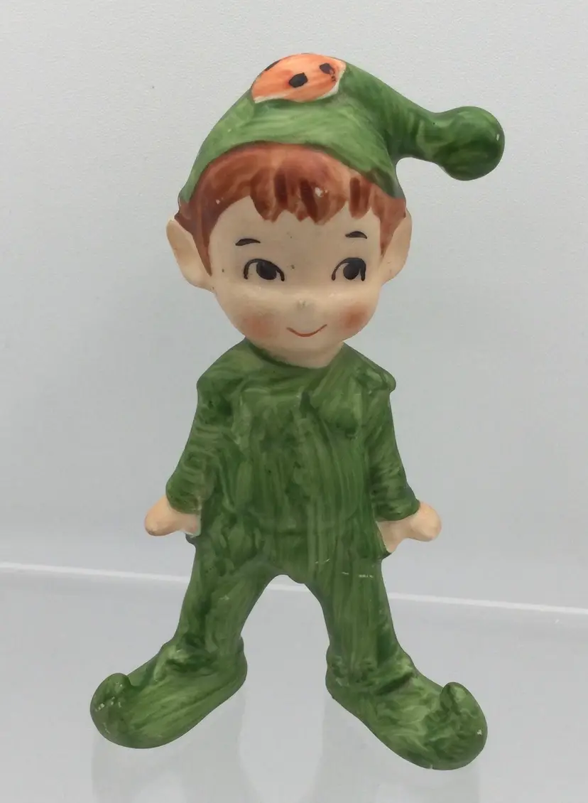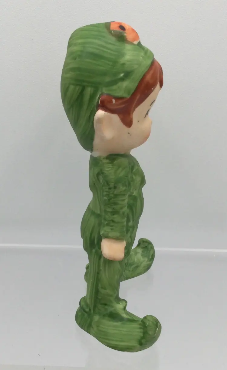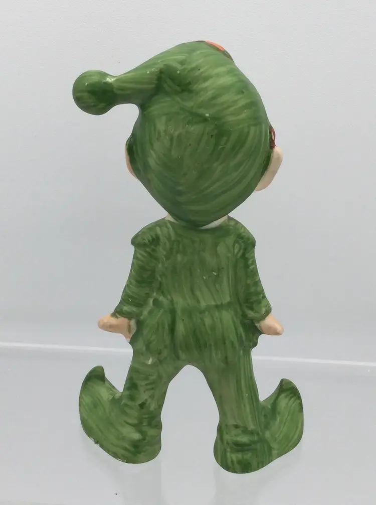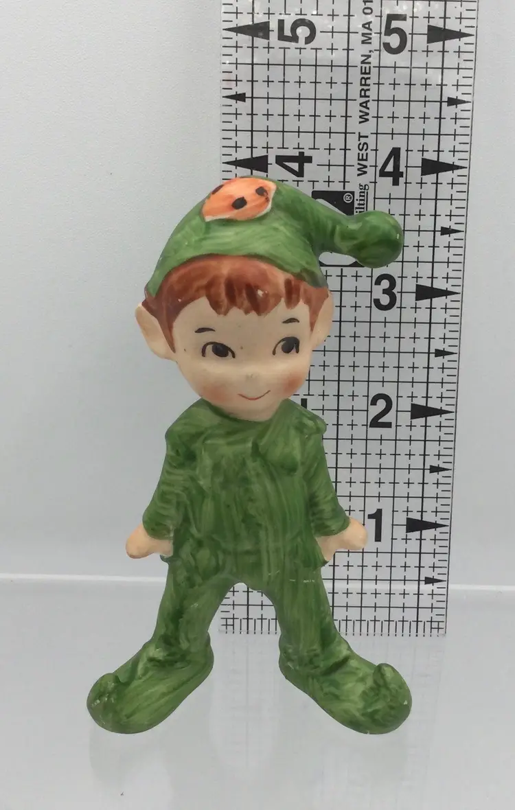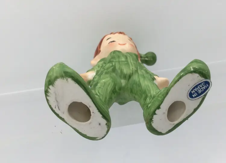 4”H x 2 1/2”W ceramic pixie with green paint. Made in Japan sticker on bottom of foot. A few green paint flecks on face and a few missing paint spots overall. No chips or cracks. Please see images.