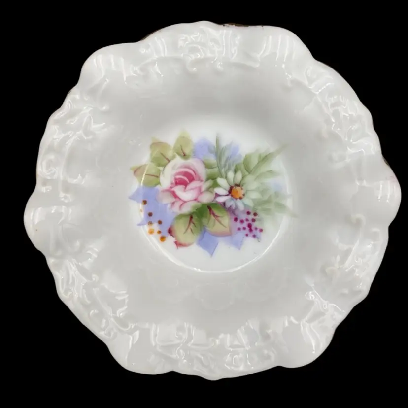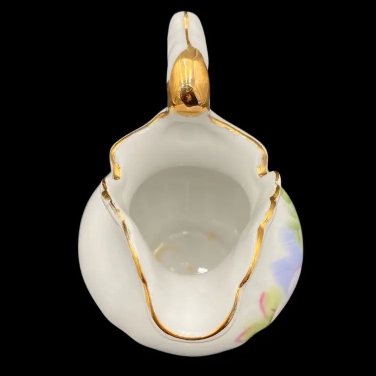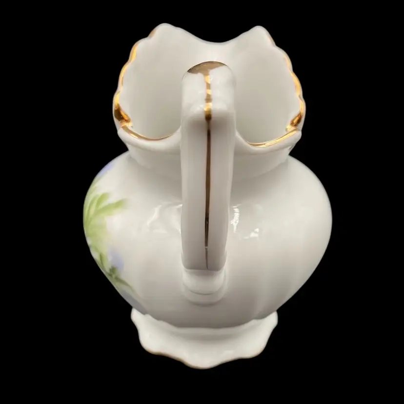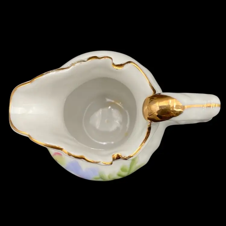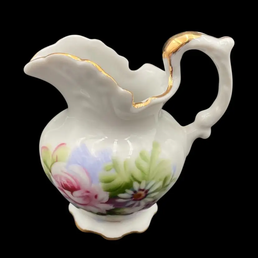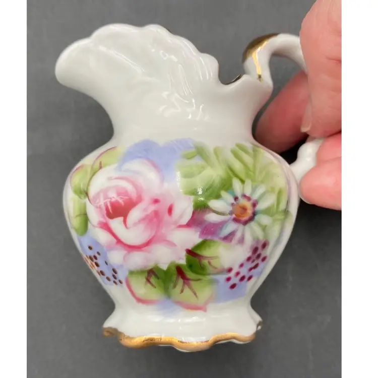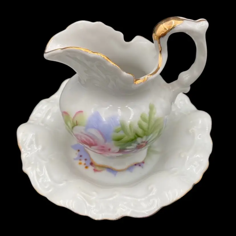 This vintage Lefton porcelain miniature pitcher and bowl set exudes elegance with its Victorian style hand-painted rose and daisy floral arrangement. The white glossy finish, gold edging, embossed design on the plate, and delicate details make it a perfect addition to any collection. Made in Japan and weighing only 7.9 ounces, this handmade set is perfect for display or as a charming addition to a tea party.