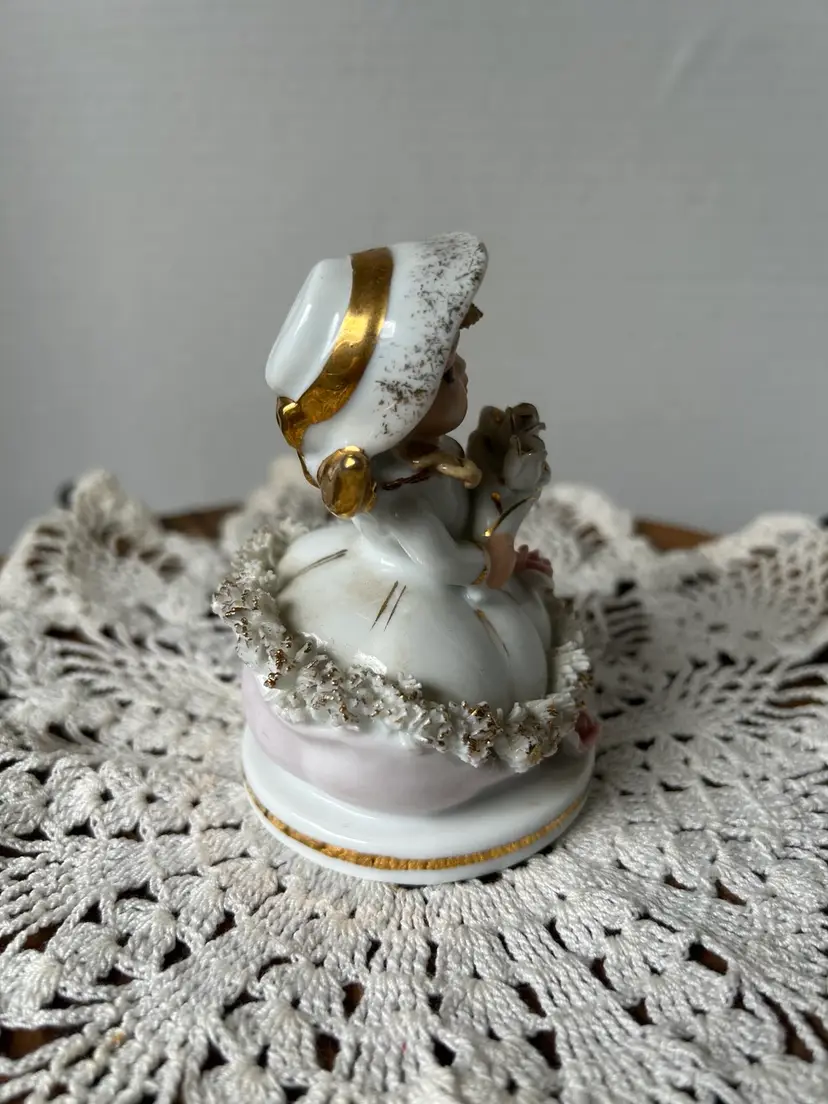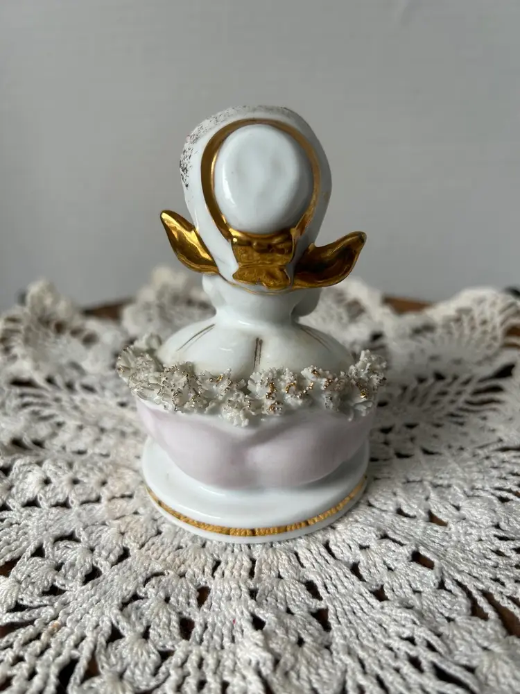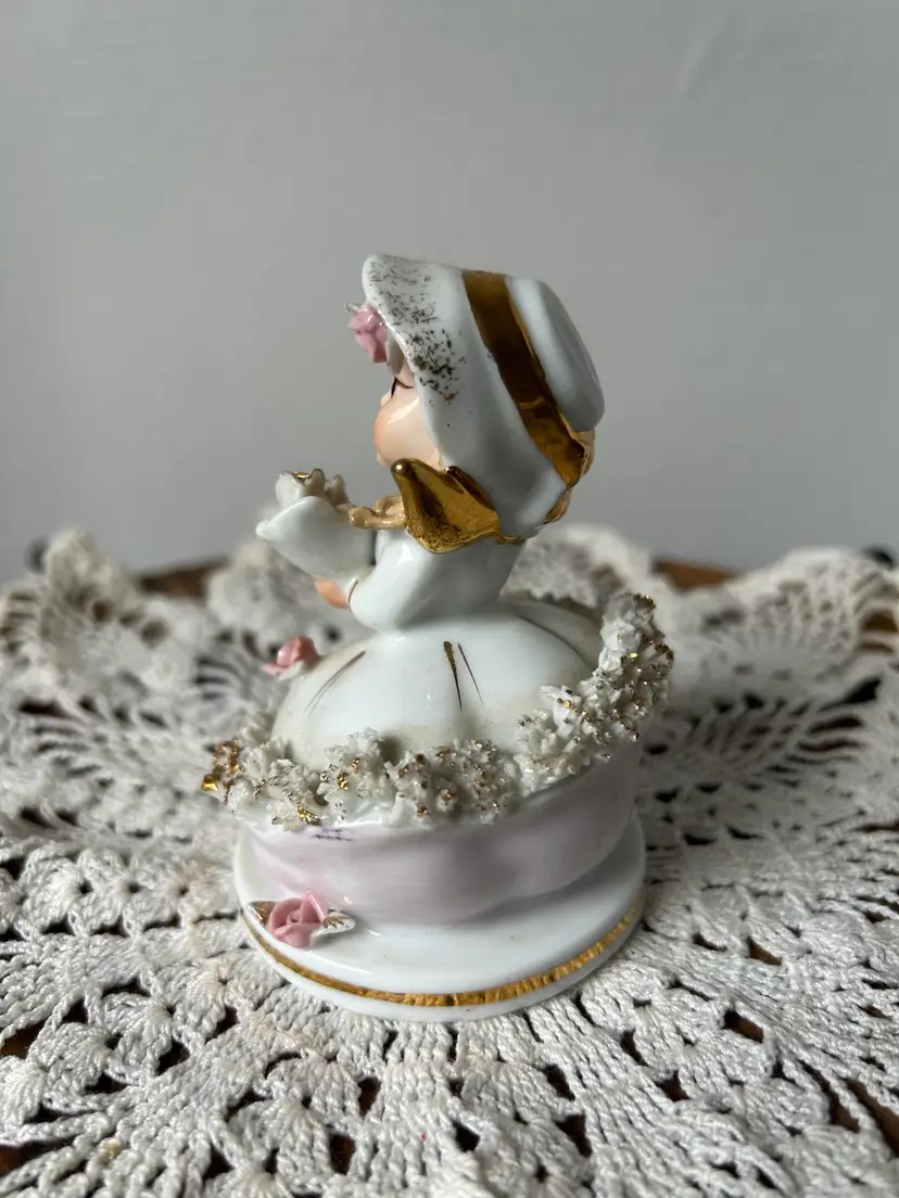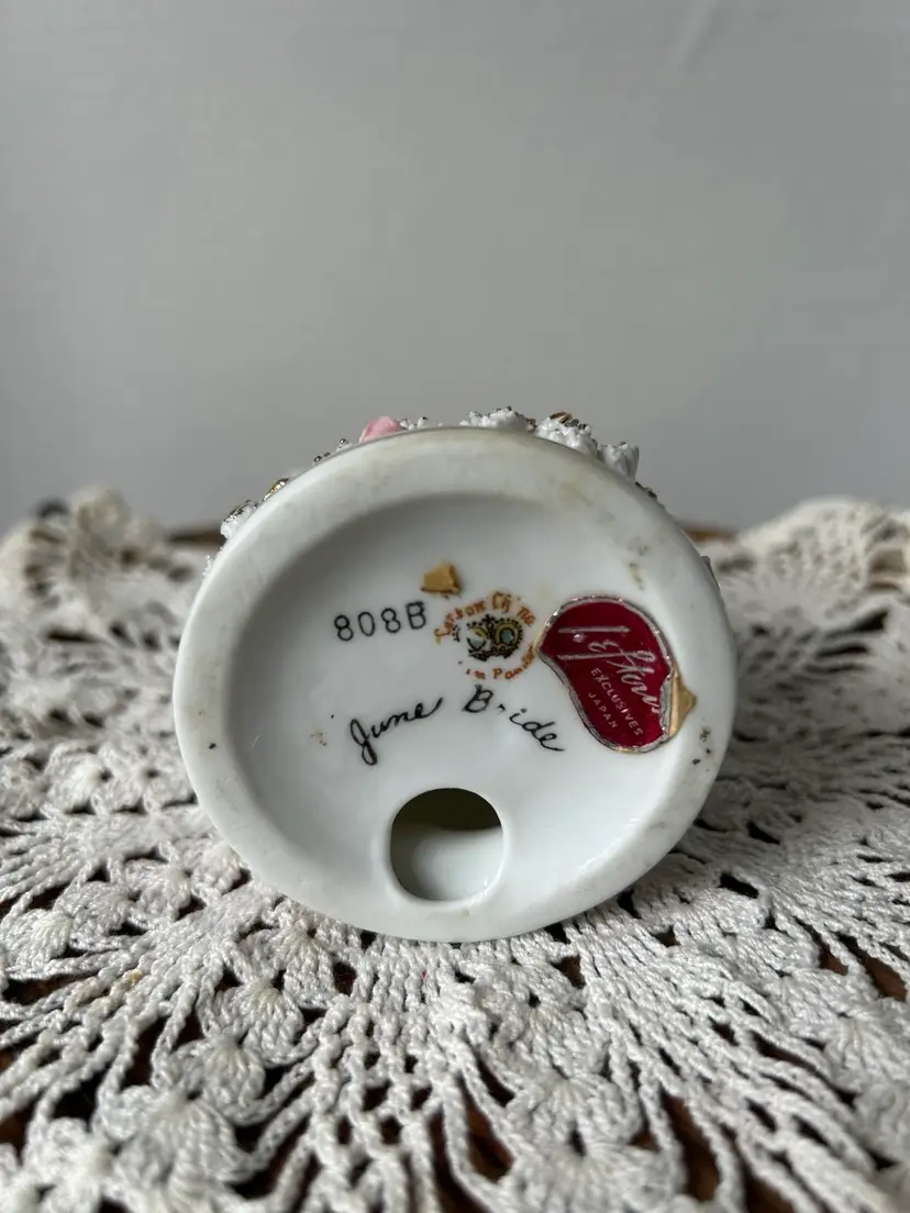 Made of of ceramic between 1946-50 by the sticker and back stamp. She’s the June Bride and part of the original Storybook Collection and is In very good condition. I do see the leaf from the rose on the dress is missing and also a piece of the “spaghetti” trim in the front. Measures 4” tall by 2.5” across the base