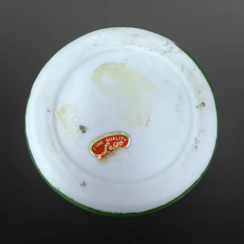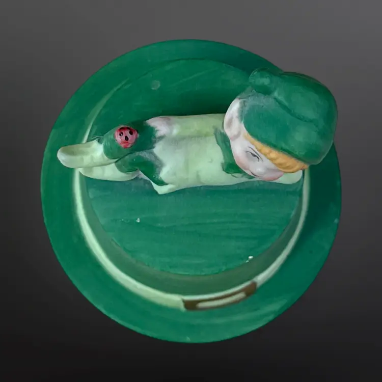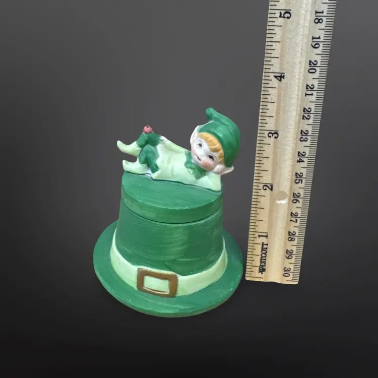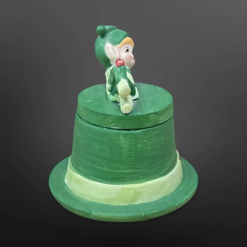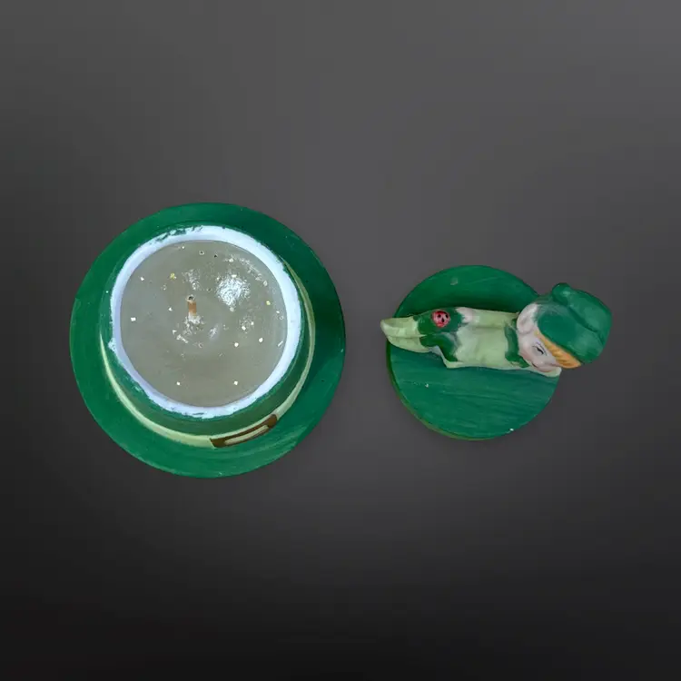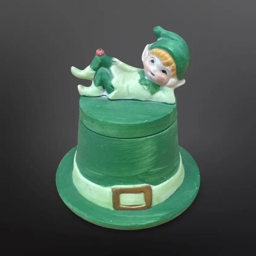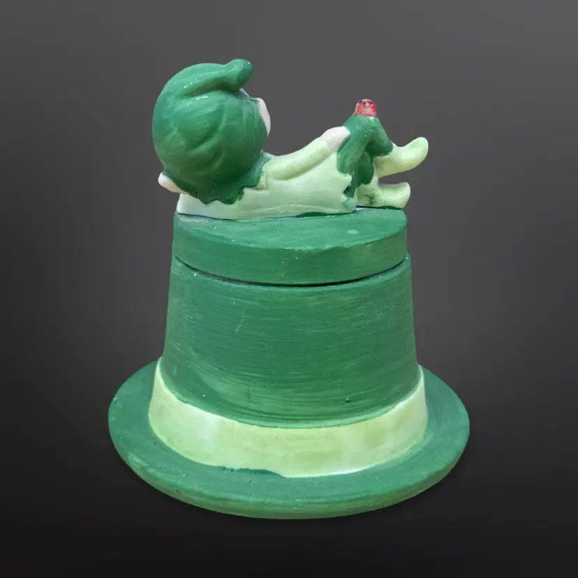 Adorable Lego matte ceramic pixie elf with ladybug on its knee laying on a green top hat with an unused candle inside. Great condition; no chips or cracks. Measures approximately 3.5” tall.
