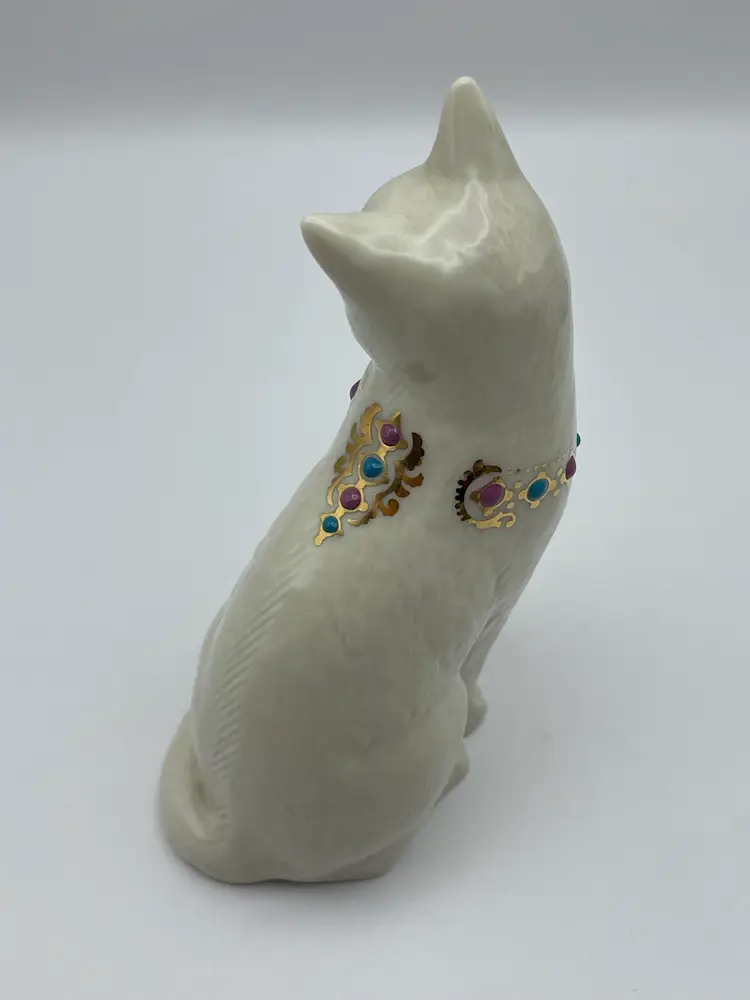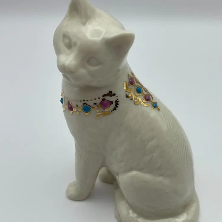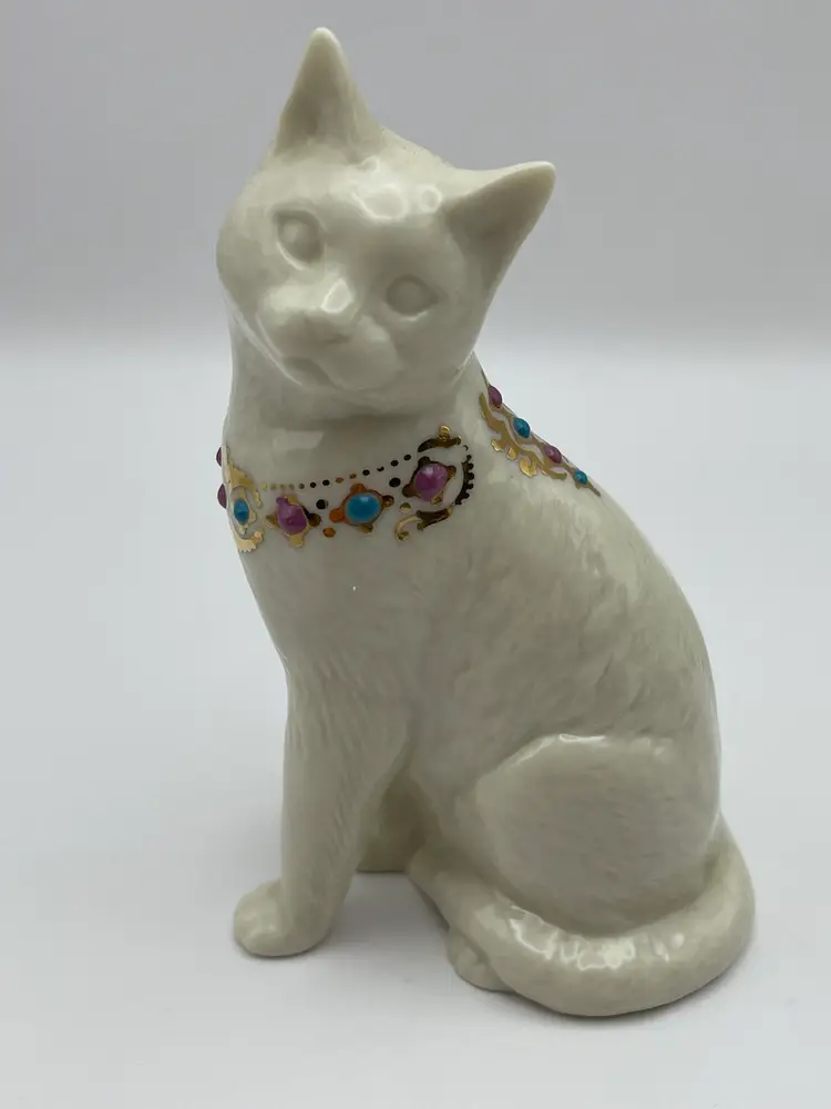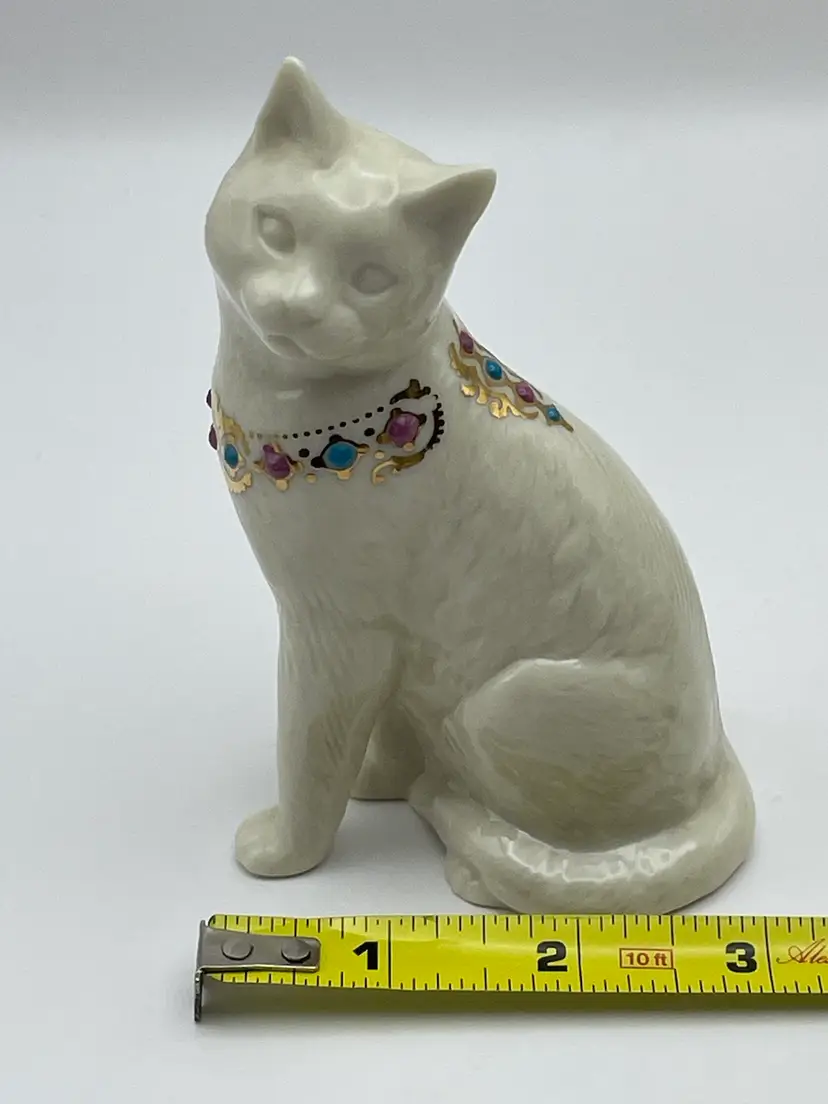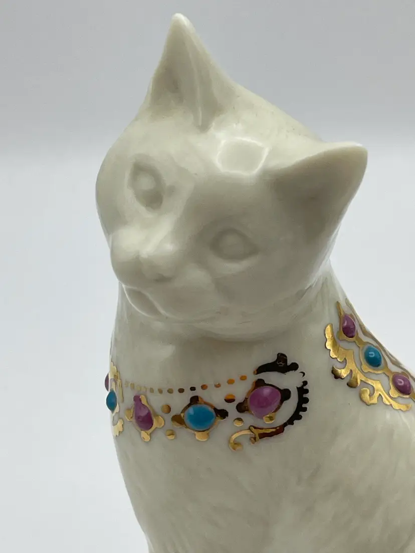 Vintage Lenox China, “Jewel Collection”, White Cat/Kitty, Pink/Blue/Gold, Made in USA. This specific gold backstamp was introduced in 1953 and was used until 1989. (One little bubble pop on front of cat, circled on last picture) Please see pictures for measurements.