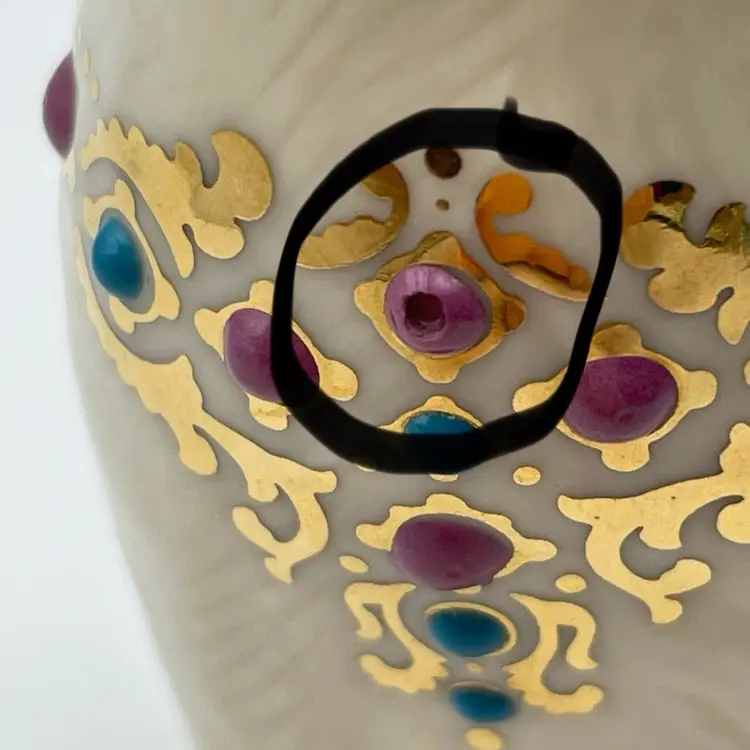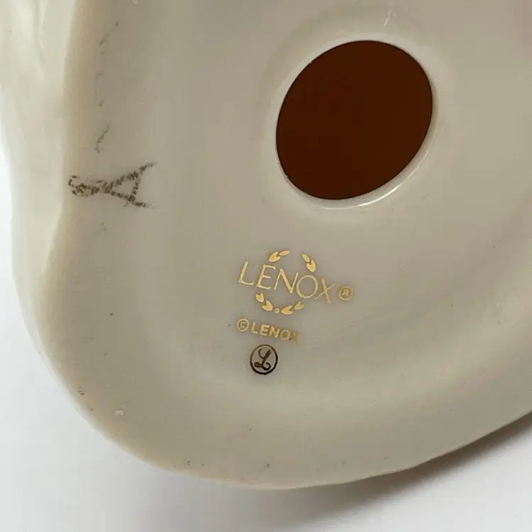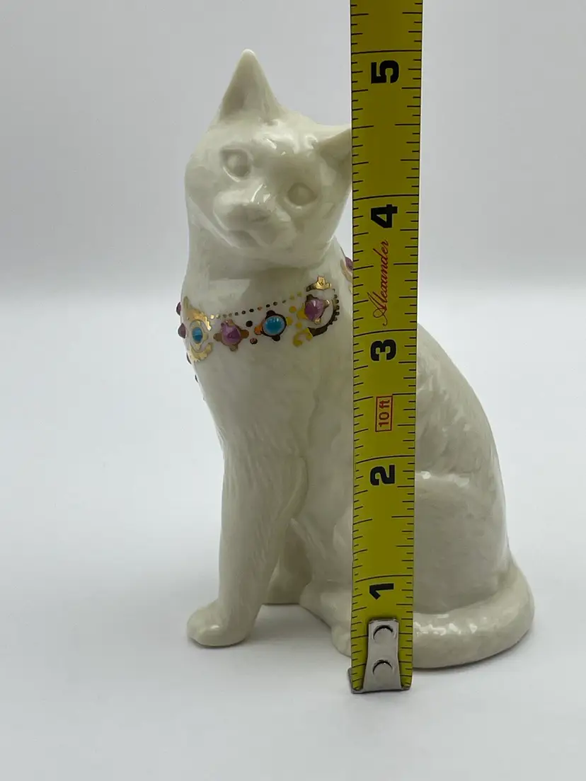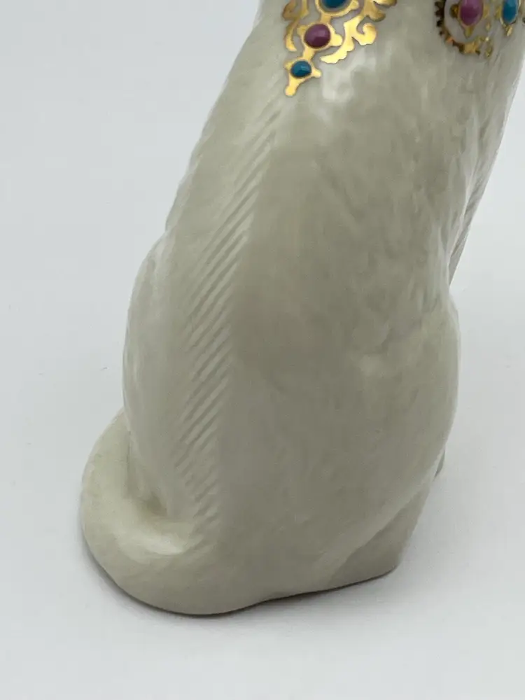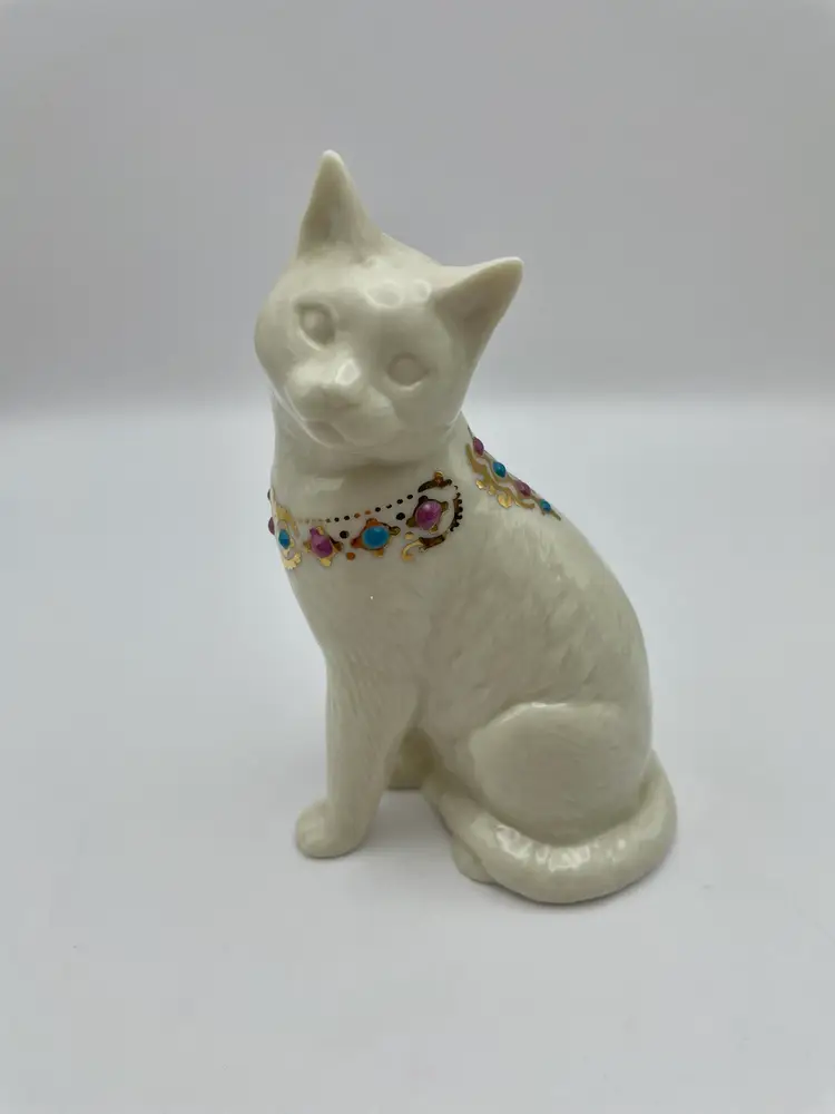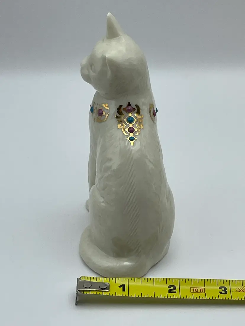 Vintage Lenox China, “Jewel Collection”, White Cat/Kitty, Pink/Blue/Gold, Made in USA. This specific gold backstamp was introduced in 1953 and was used until 1989. (One little bubble pop on front of cat, circled on last picture) Please see pictures for measurements.