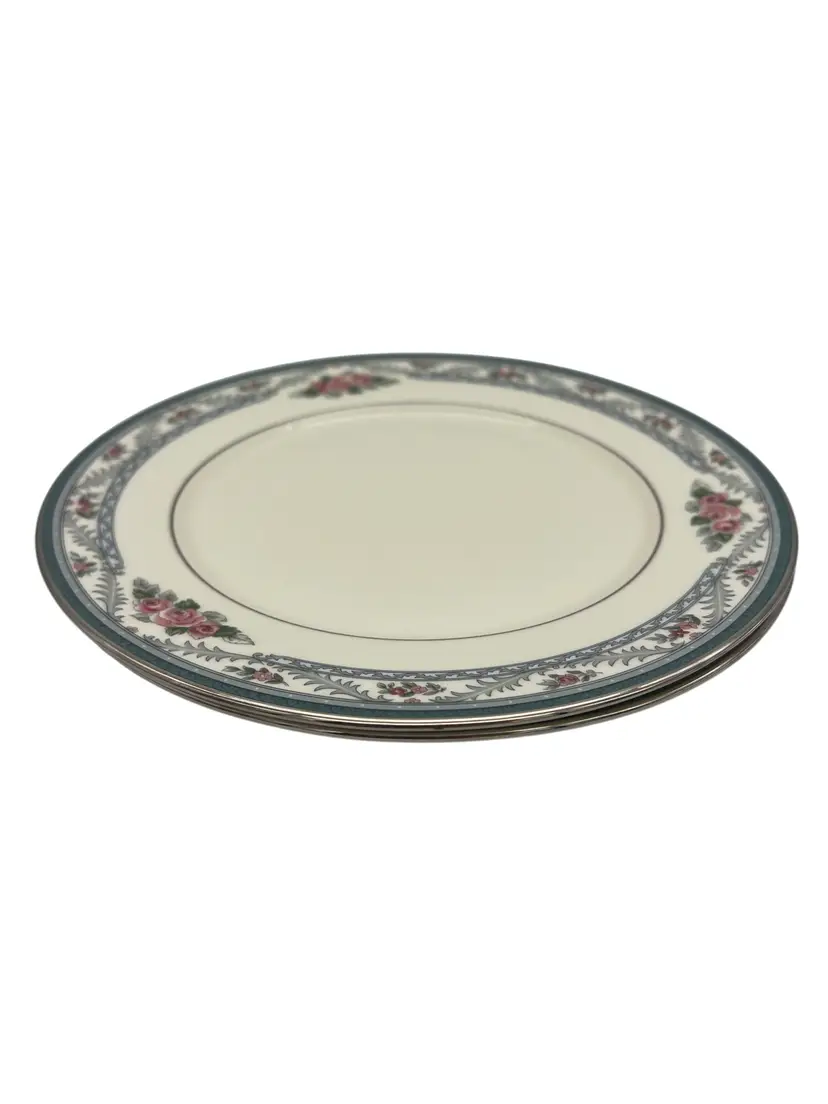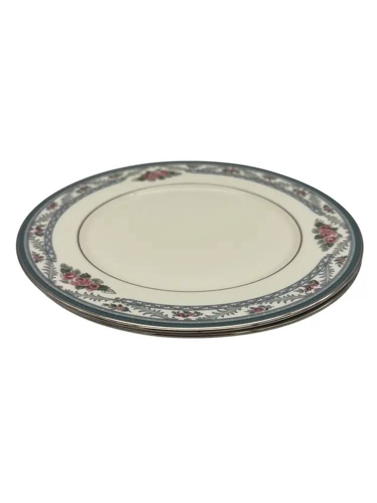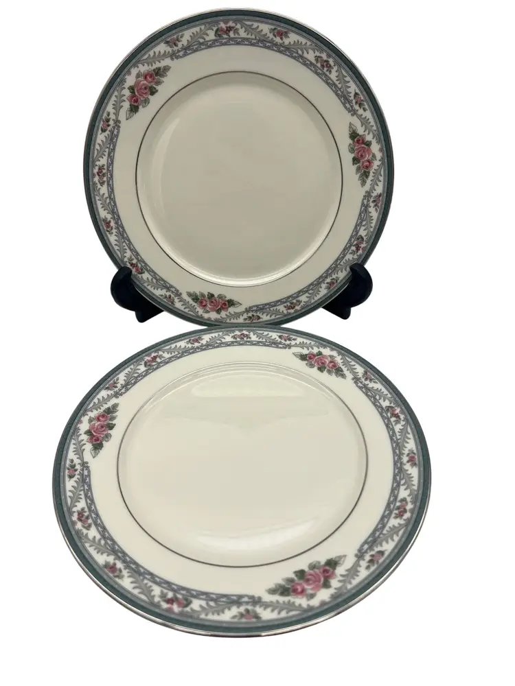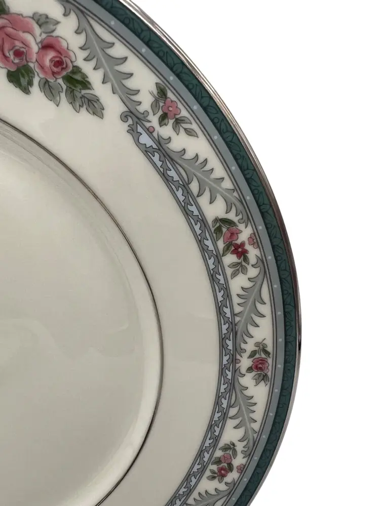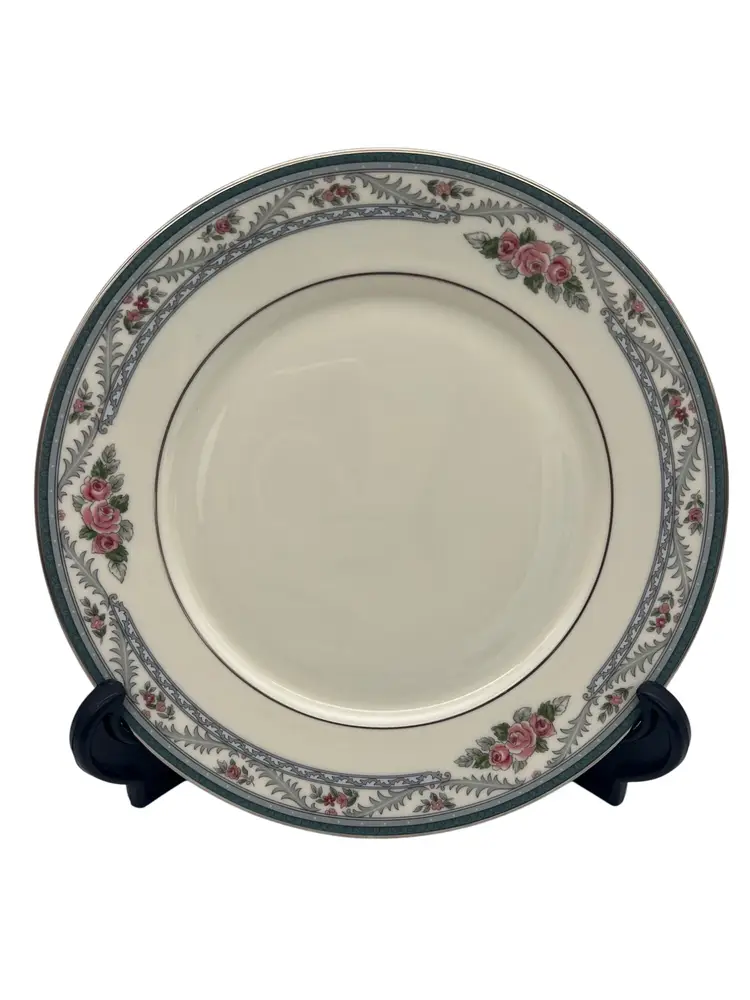 Features: • Type: Salad Plate • Maker: Lenox • Pattern: Country Romance • Pattern Description: Green Bands, Pink Roses, Gray Leaves, Platinum Trim • Size: 8" • Made in USA • Weight: 10.9oz each • Years Made: 1992 - 2000 • Current Status: Discontinued