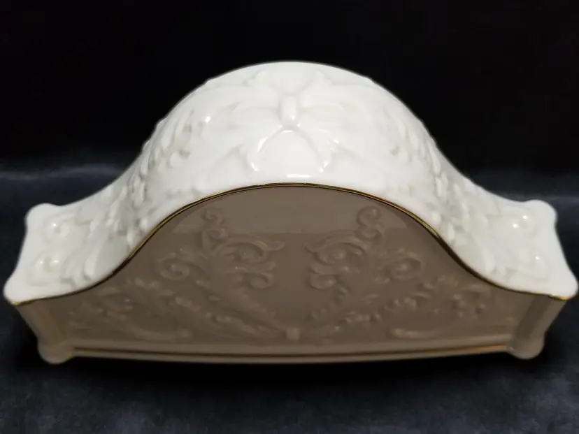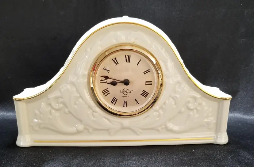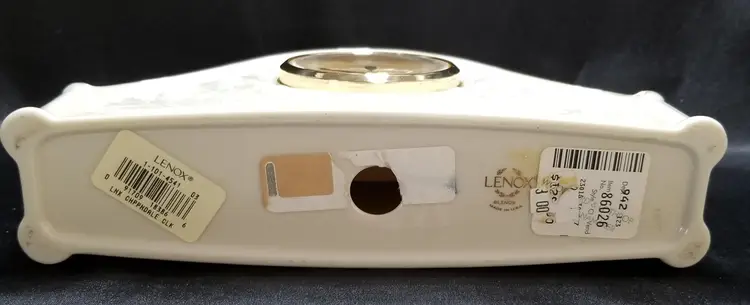 Vintage Lenox Porcelain Chippendale Mantle Clock is 8 3/4" wide x 5" tall. This beautiful pattern was first introduced in 1992 and features an embossed leaf and bow design. This Mantle Clock is still being produced. Made in USA. I installed a new battery, and it is keeping time perfectly. No chips, cracks, or repairs. Please view the pictures and feel free to ask questions. Thank you for visiting my shop.