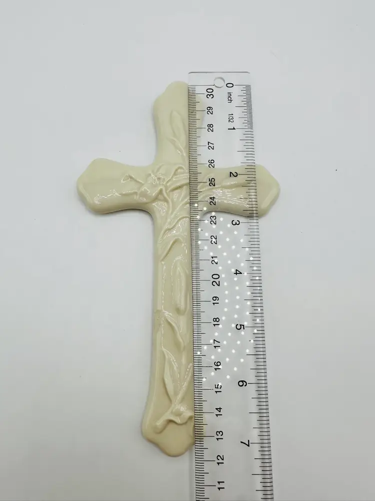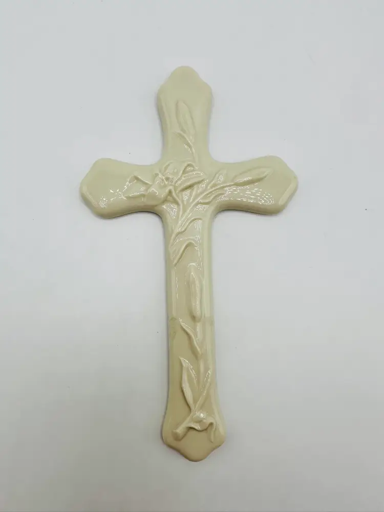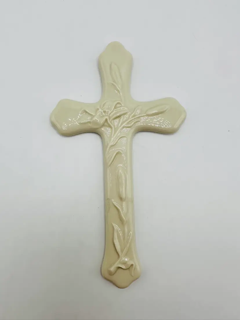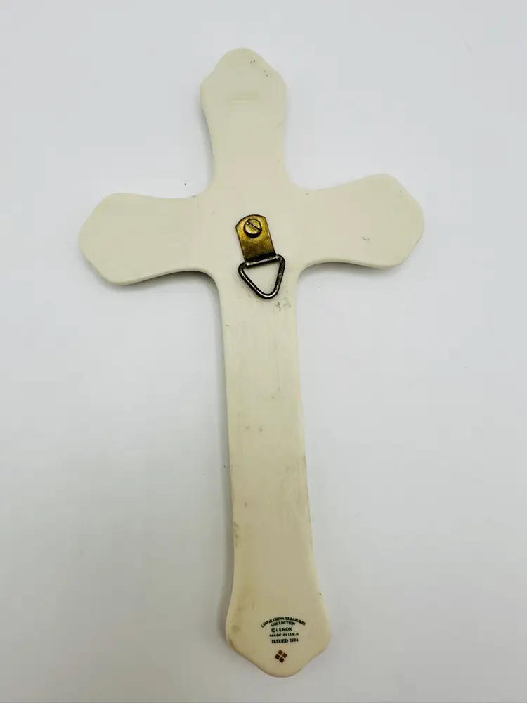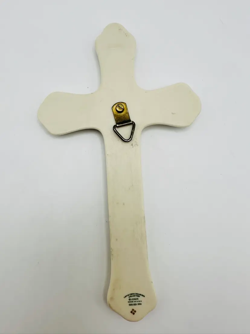 This is a Lenox China Treasures Collection porcelain lily wall cross in ivory. The cross features a raised, detailed lily motif. It measures approximately 7.5 inches by 4.25 inches. The piece is a vintage item, with some listings dating it to 1994. It is made in the U.S.A.