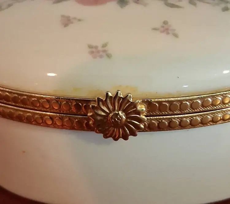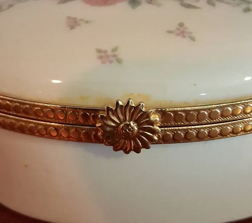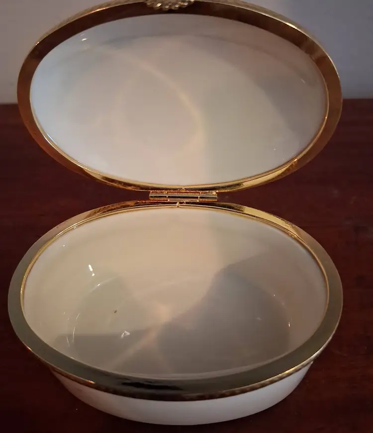 The lid is domed and the hinge works perfectly. There are no chips, cracks or crazing in this little gem. It make an elegant statement in any room to hold your jewelry or change. It's small enough to not take up a huge amount of counter or dresser space, but pretty enough to be out in plain sight and on display anywhere.