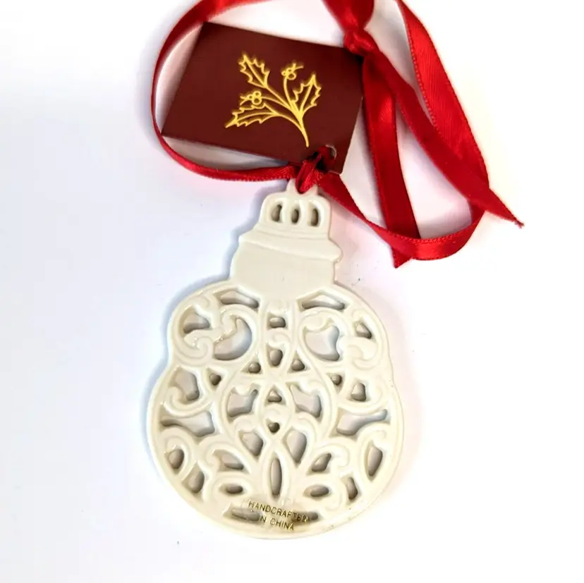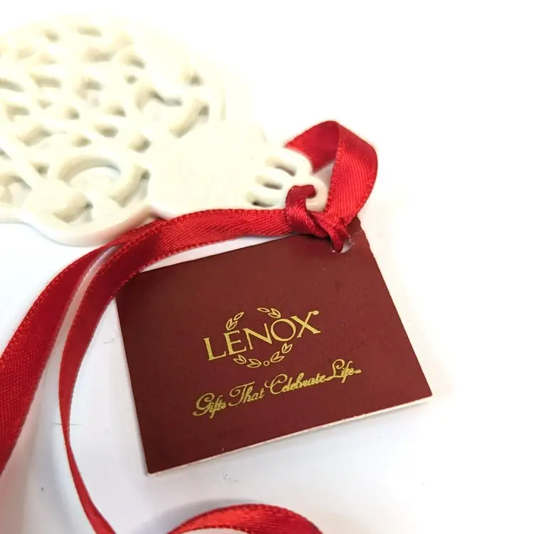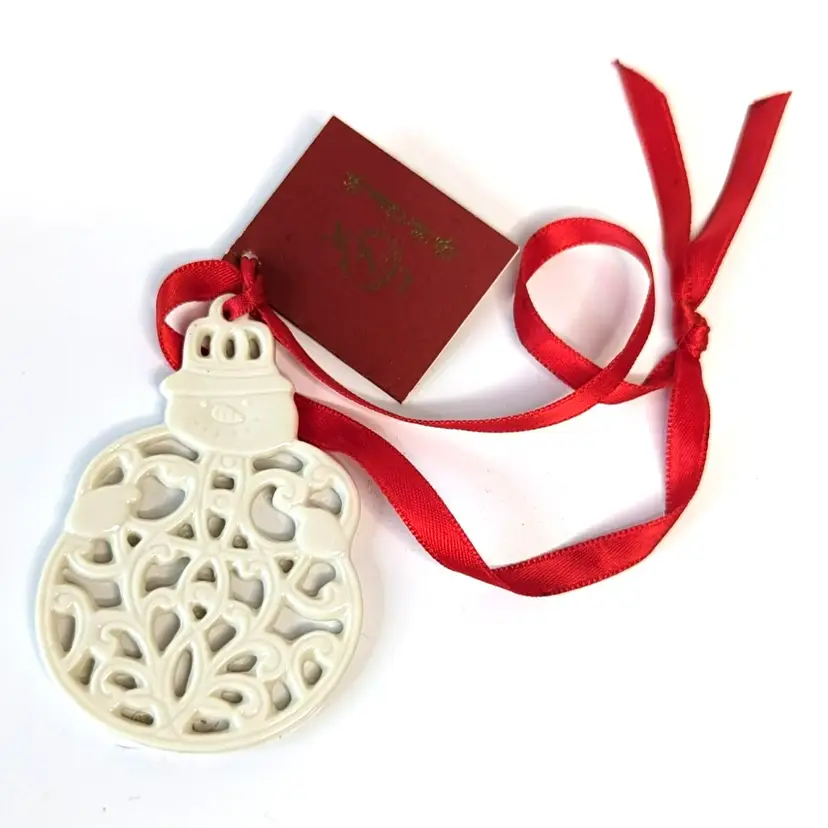 Vintage Lenox Snowman Charms Christmas Ornament. Condition is preowned. The attached card is blank. It is 2 inches wide by 3 inches high in a filigree cutout design.