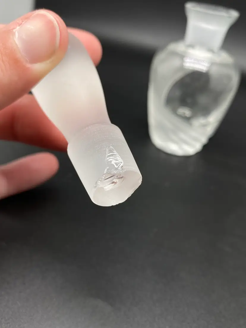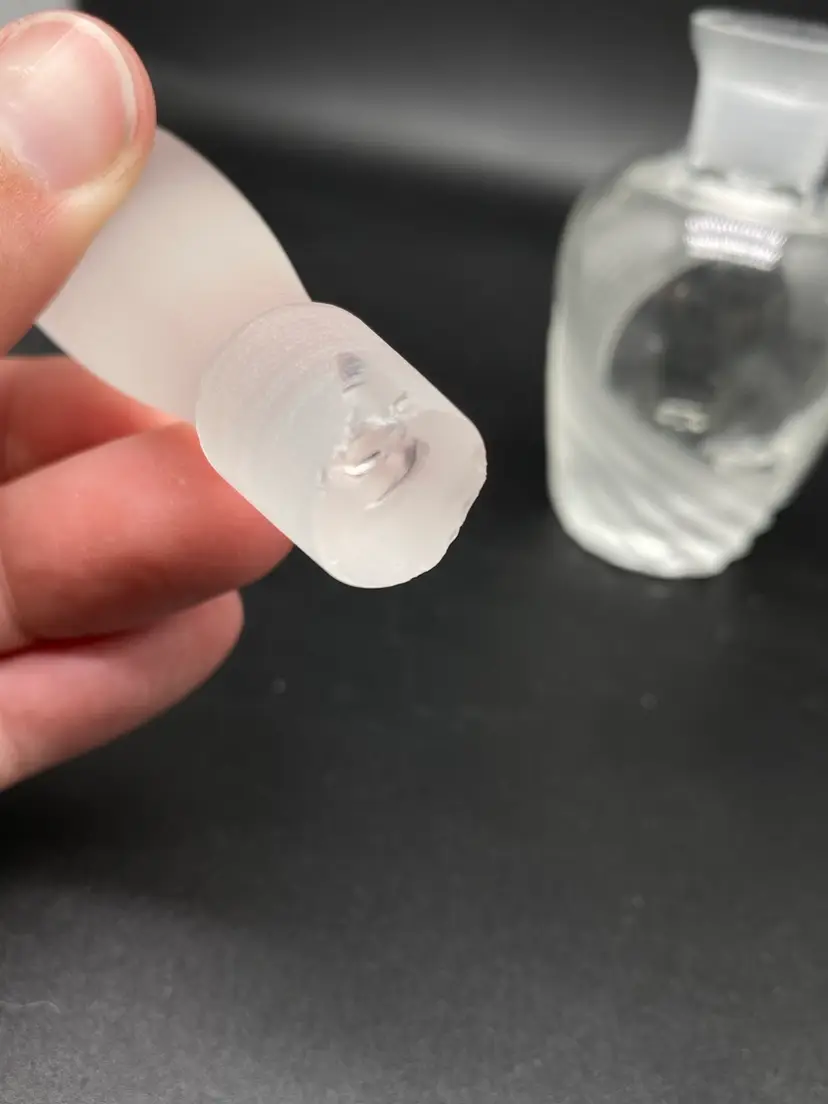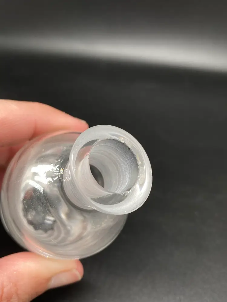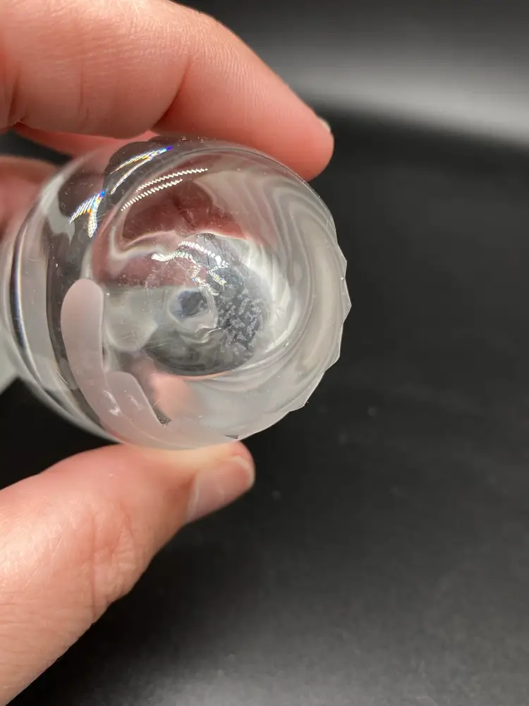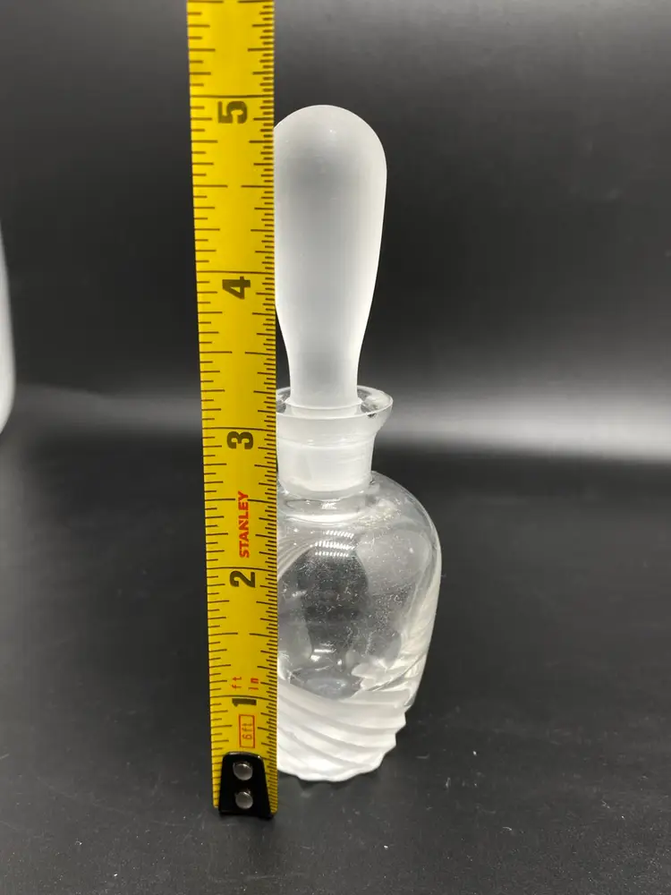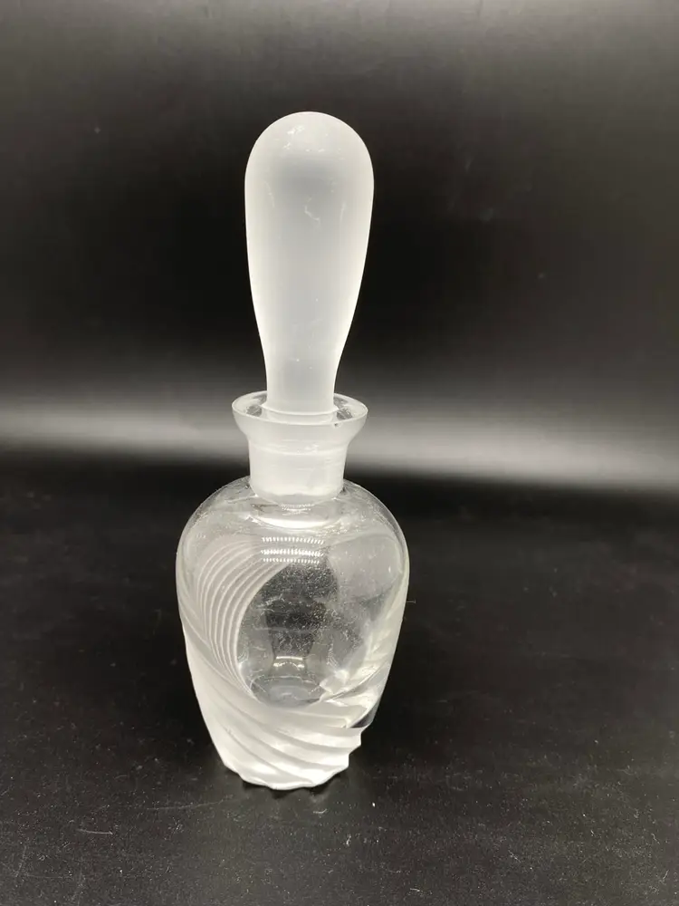 Clear glasss perfume bottle by Lenox. Stamped on bottom. Has a some chipping on stopper. See photo. Some flea bites on inner rim of bottle. Full lead crystal glass.
