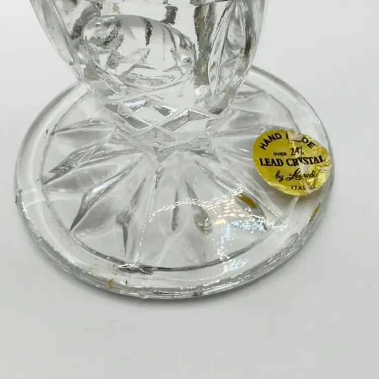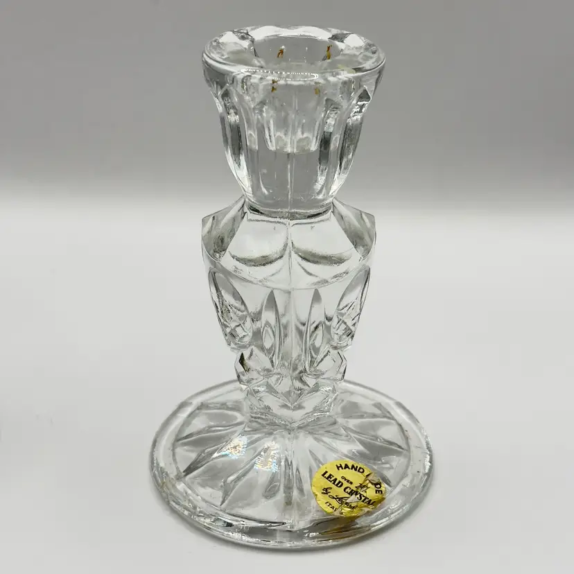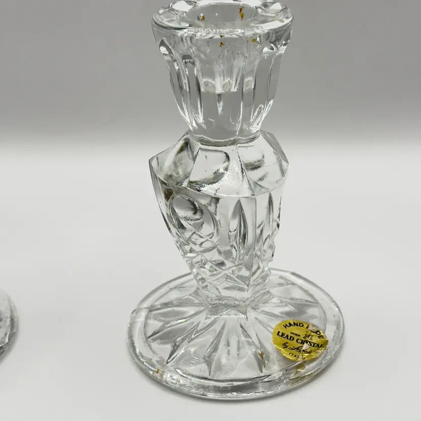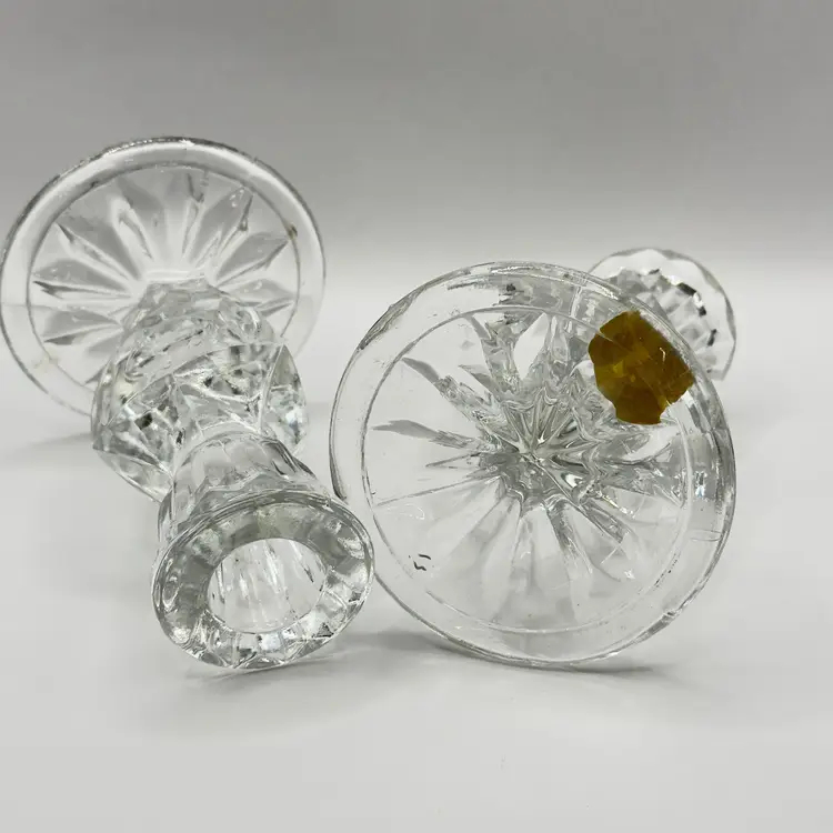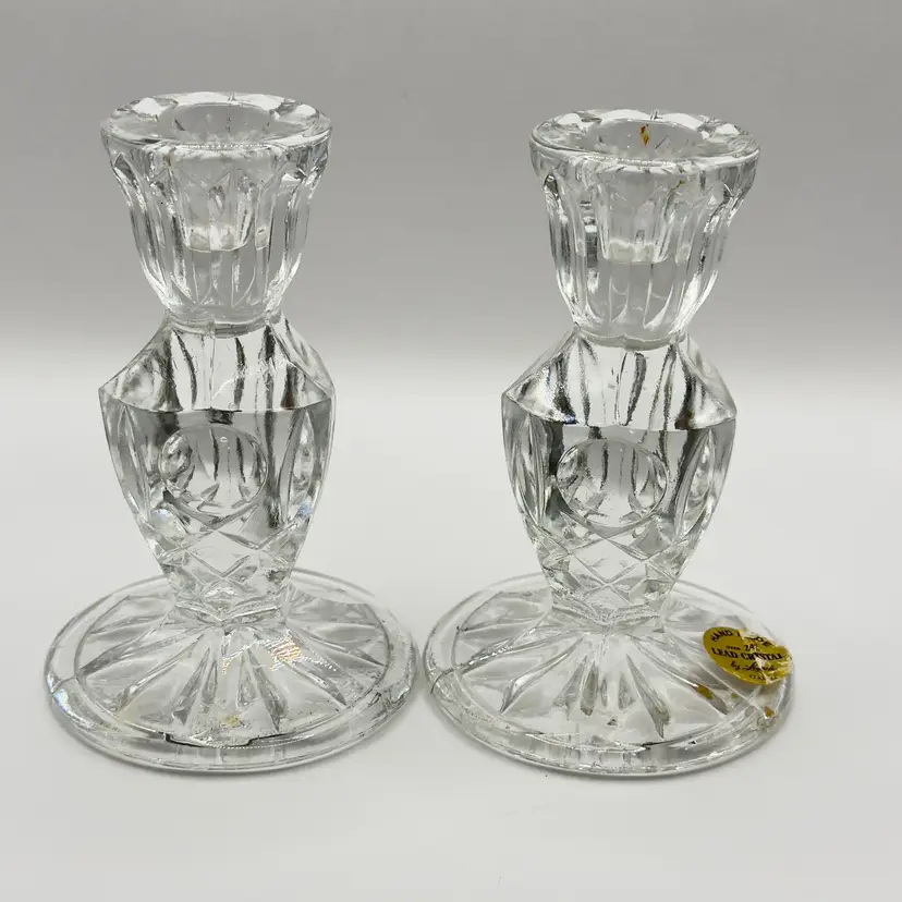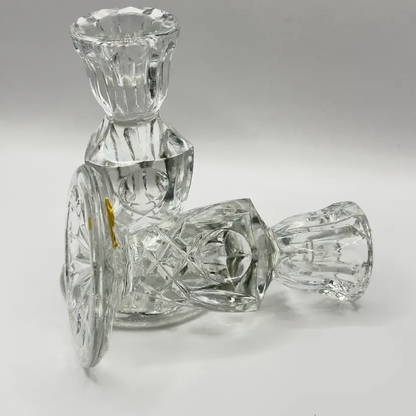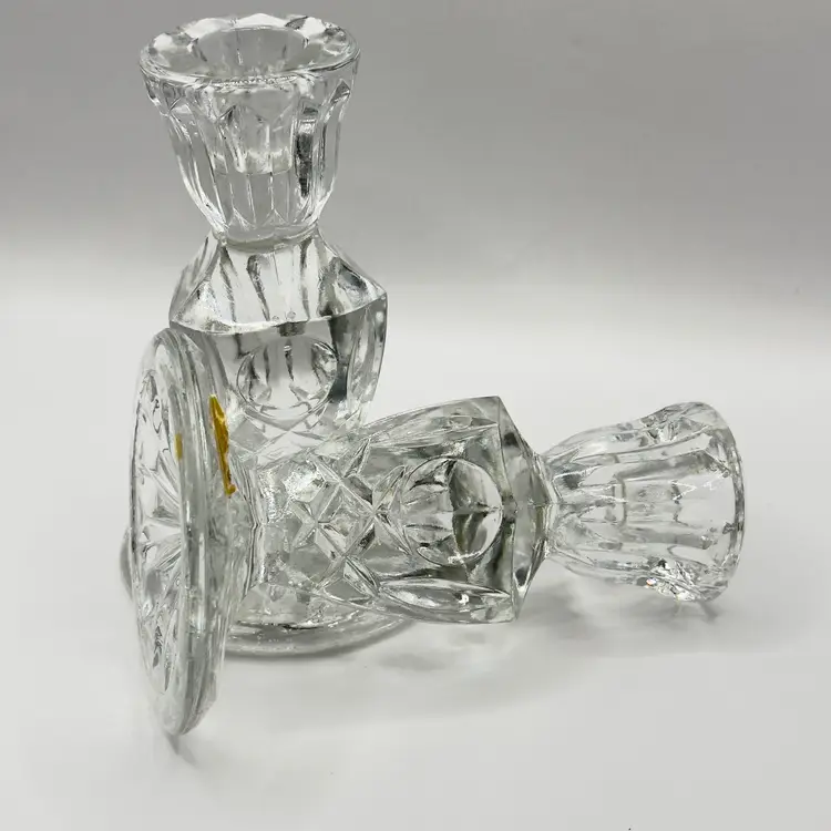 Enhance your home with this stunning pair of vintage crystal candle holders. Their elegant design and sparkling clarity make them perfect for any occasion, adding a touch of sophistication to your decor. Excellent condition with no chips or cracks. Ideal for collectors or as a thoughtful gift. Measures 3x3x5 inches. Weighs 3lbs.