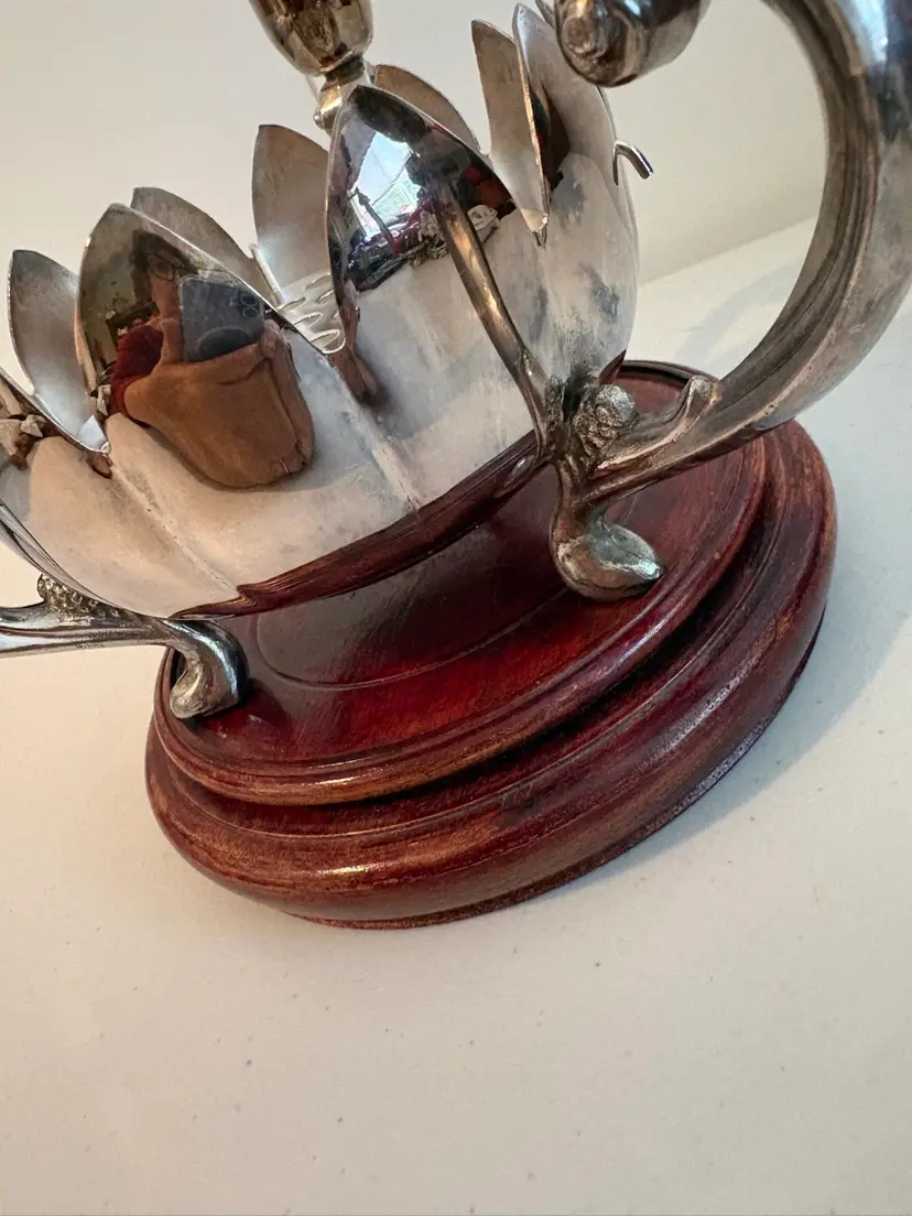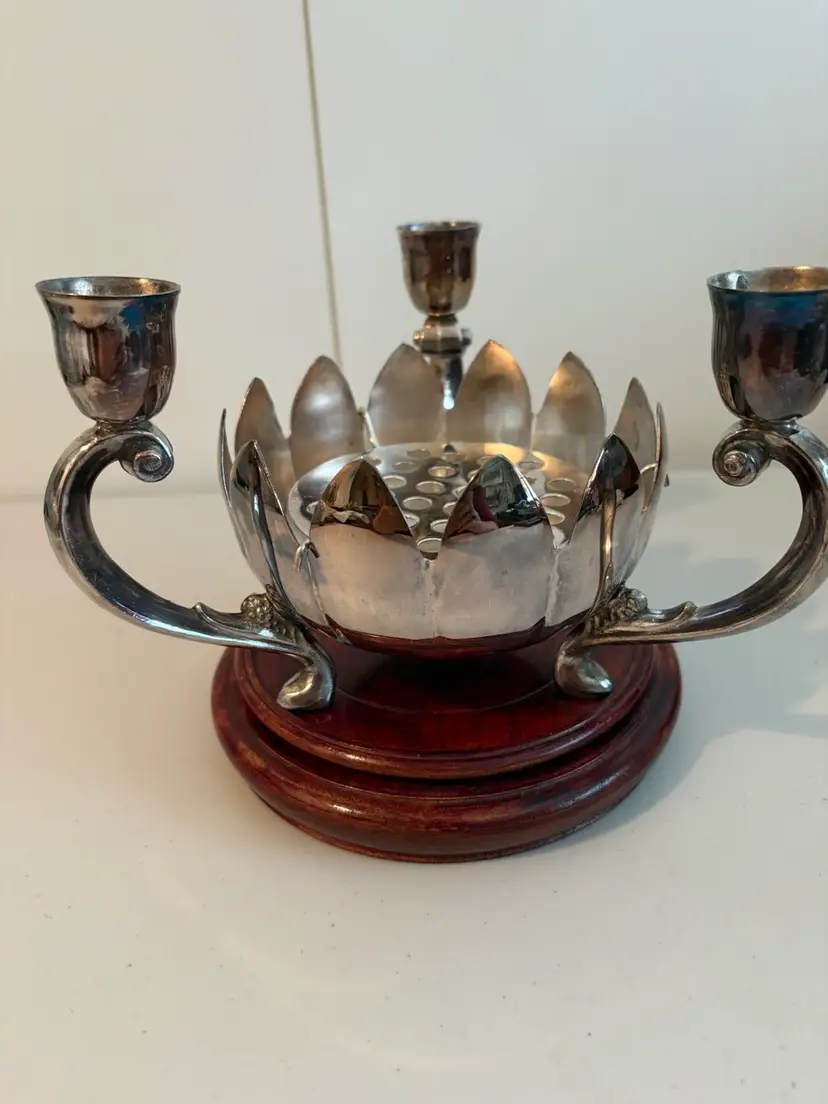 Vintage Leonard Silver Plate Lotus Flower Bowl with a three-candle holder candelabra. The piece includes a "flower frog" which can be placed in the center bowl to hold flower arrangements. This type of item was produced around the 1970s. It is a silver-plated centerpiece.
