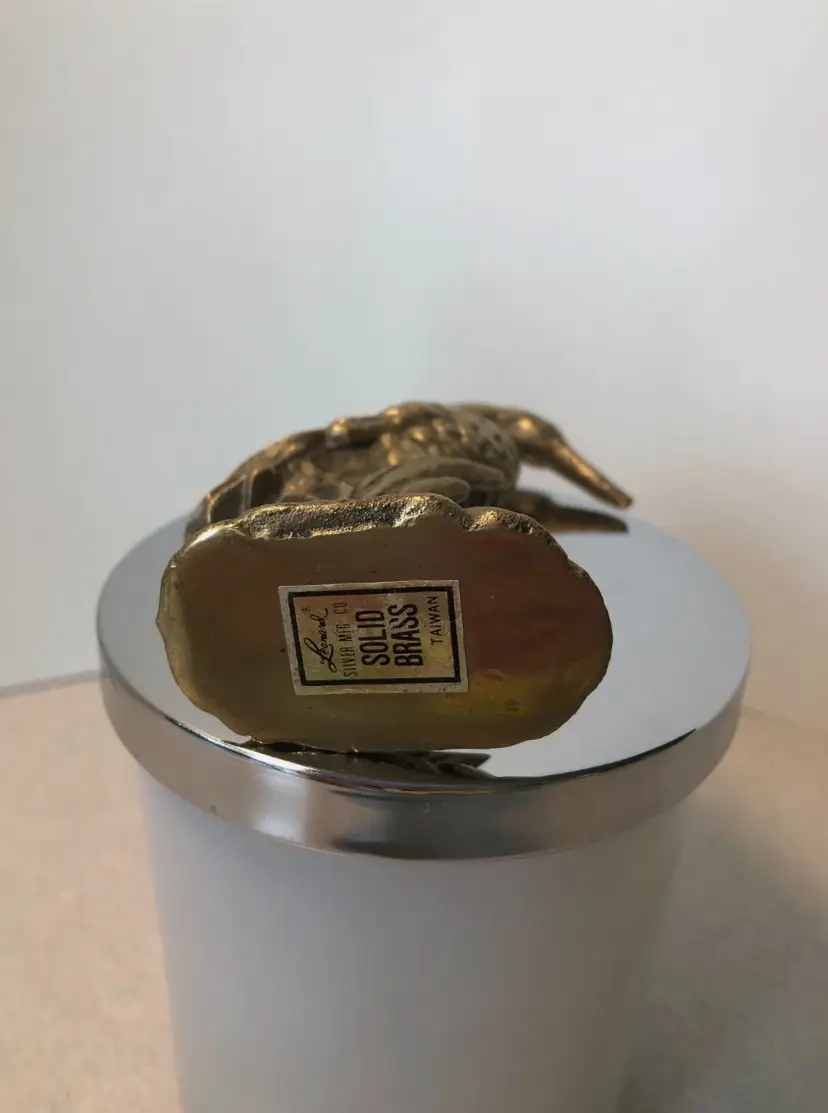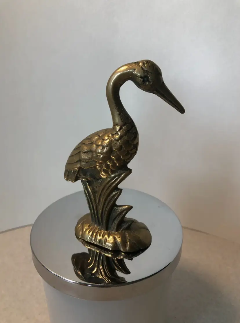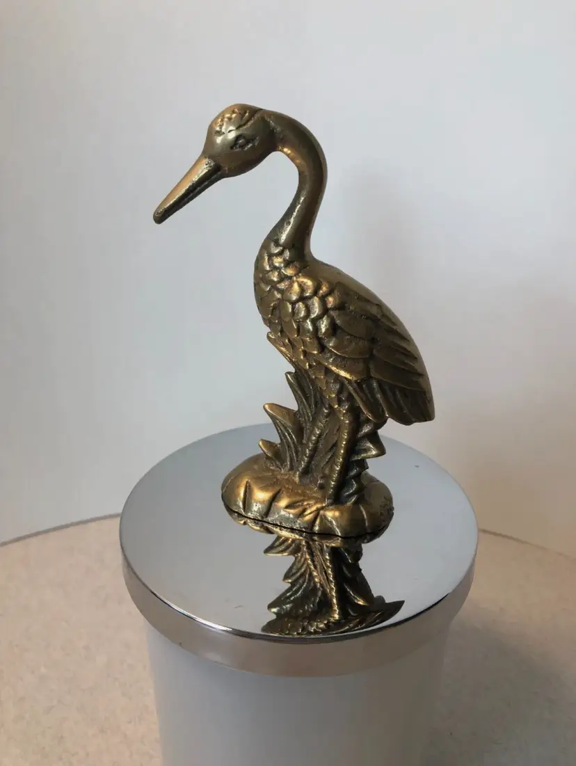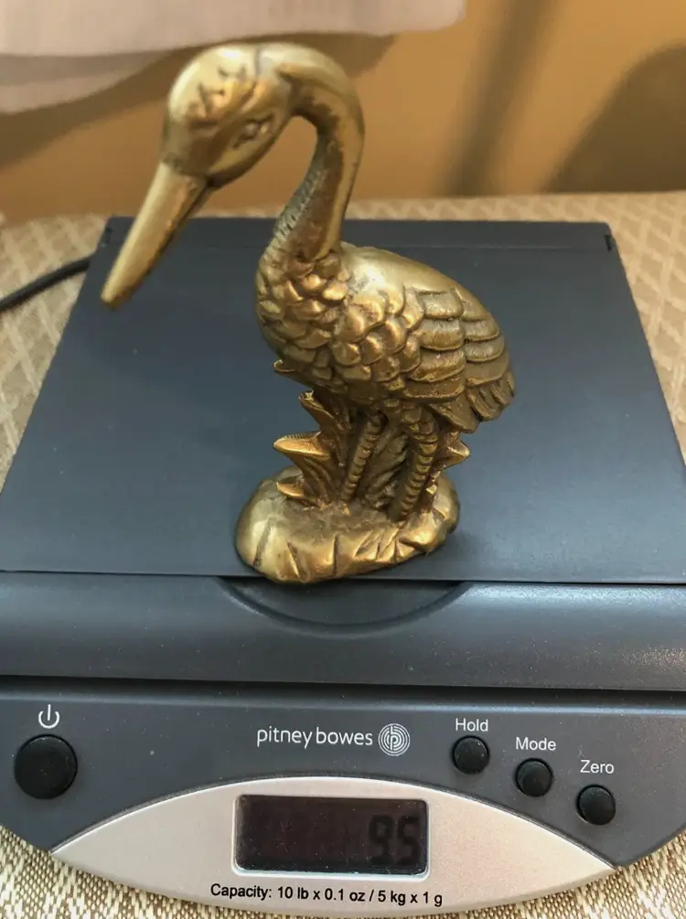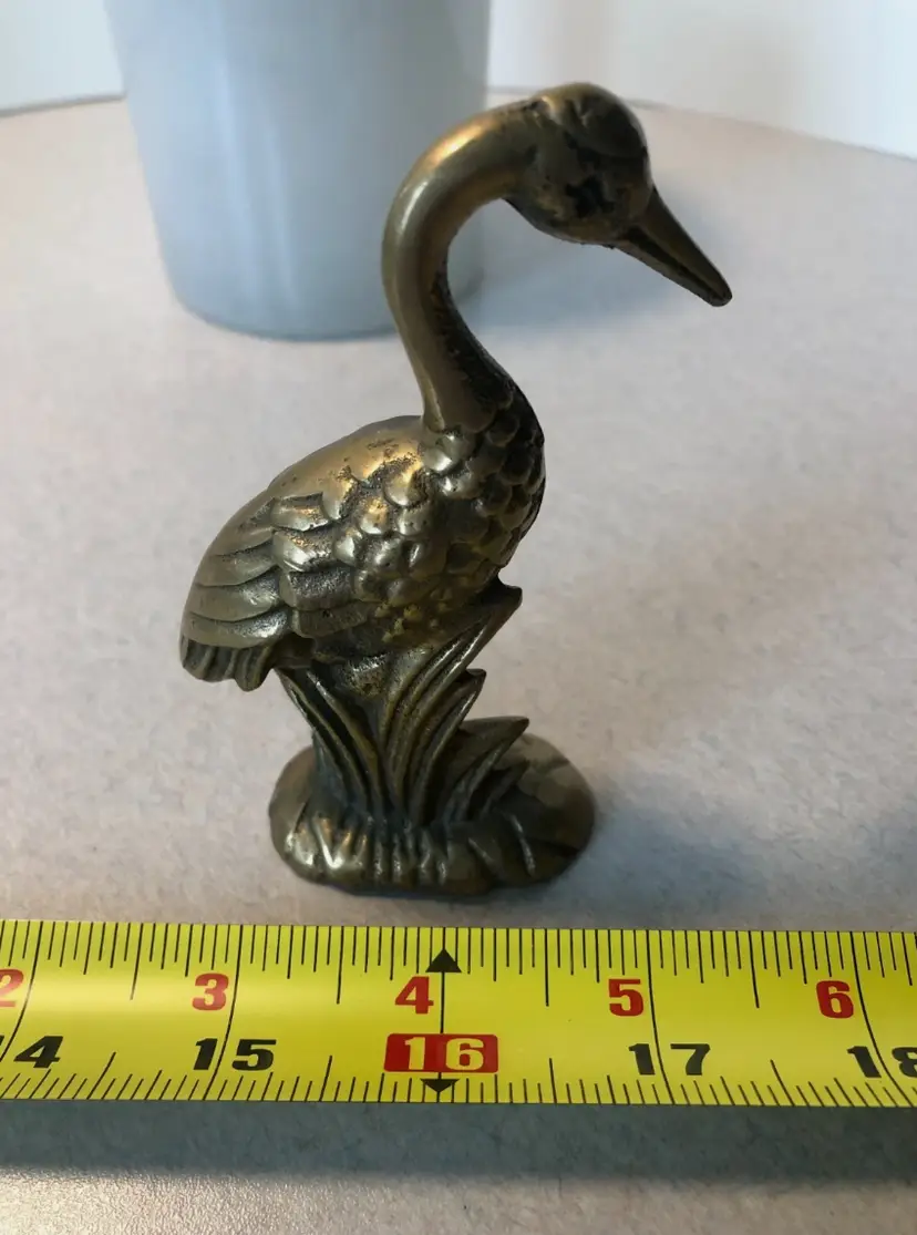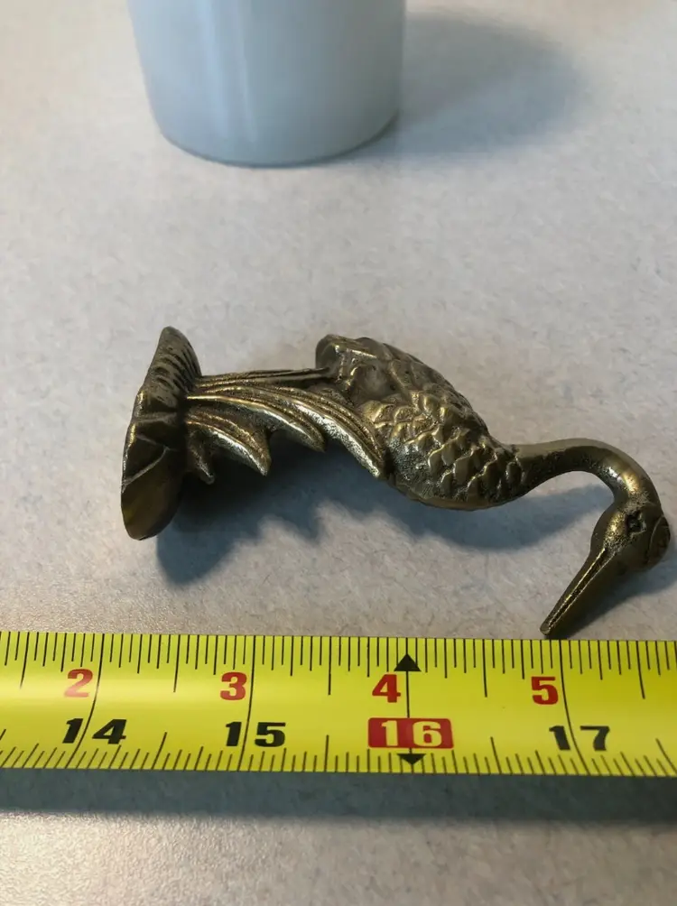 A majestic bird, and whether it's an egret or a heron, that's up to you, because they are closely related. It's always exciting to see a large bird like this wading by the side of a pond or flying overhead. You can see the look in his eye, warning the fish, "I'm gonna get one of you!" This pretty, solid brass treasure is actually from my own grandmother's collection.