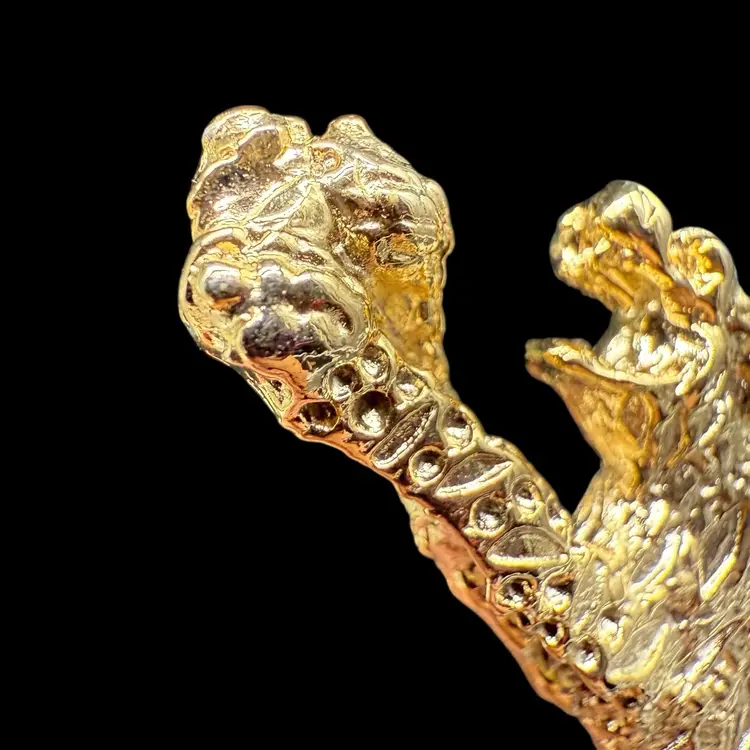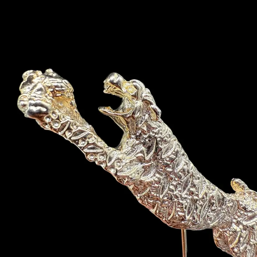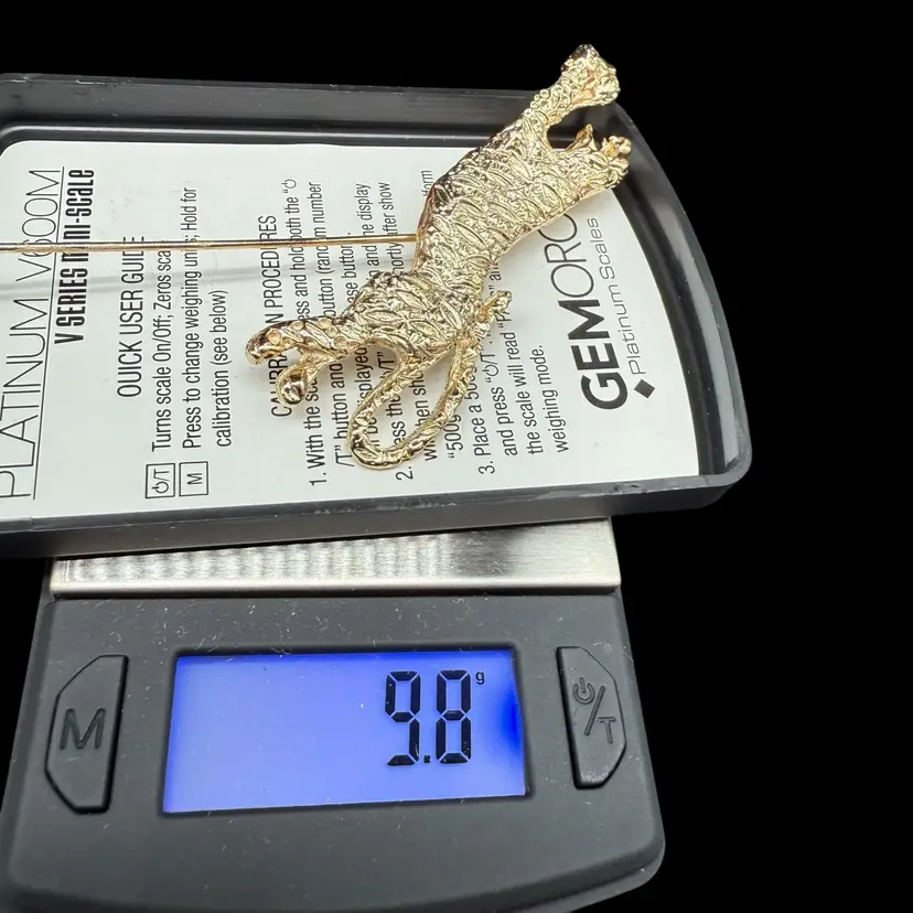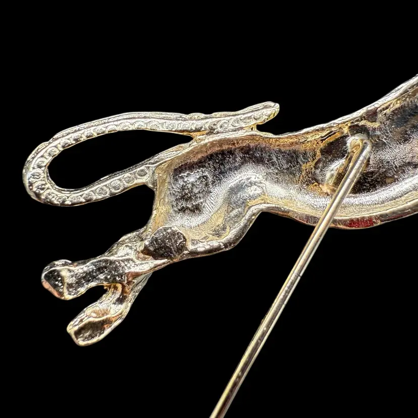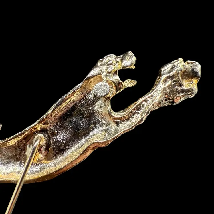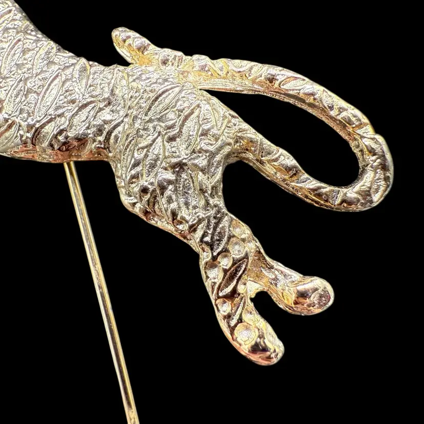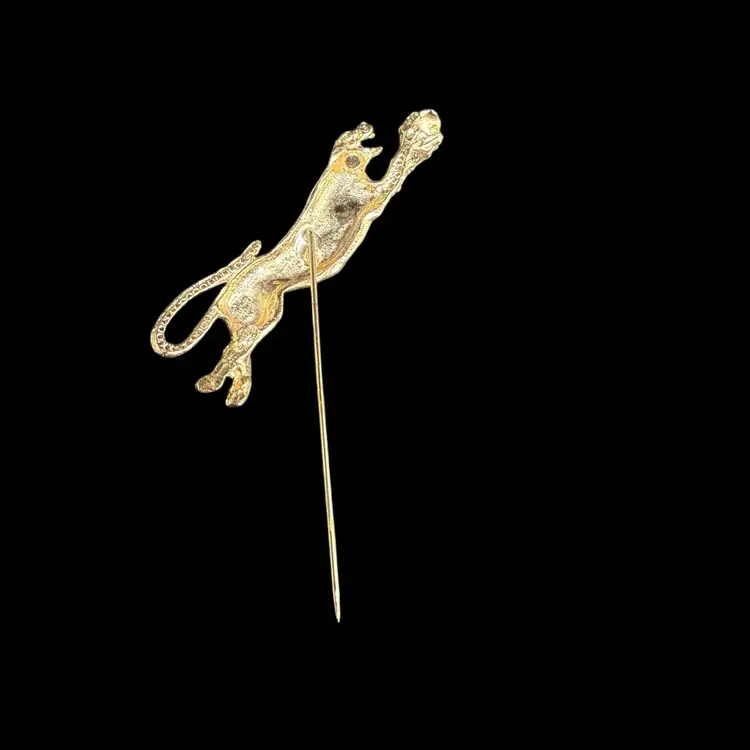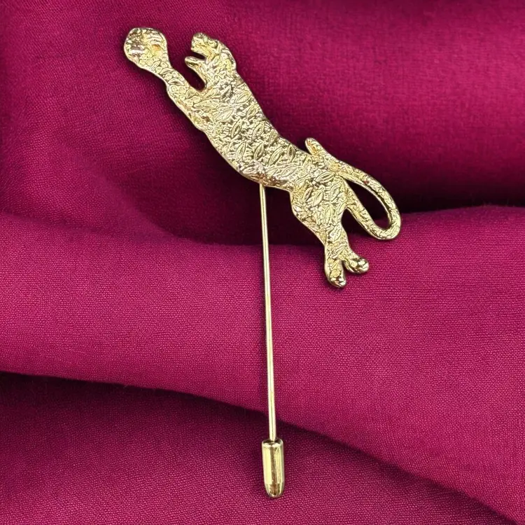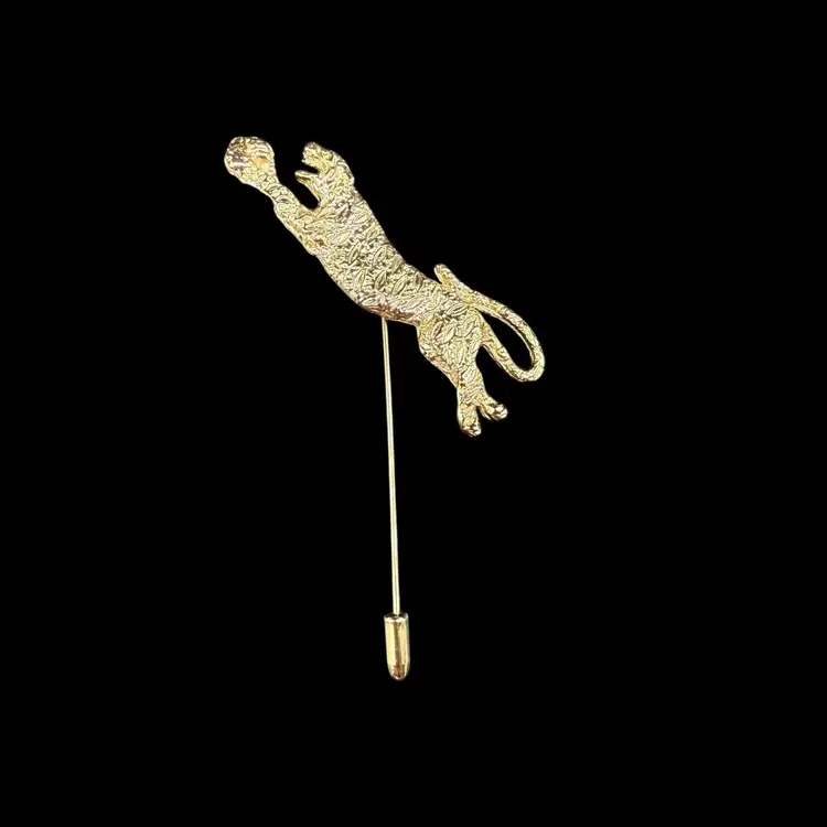 This Vintage Leopard Cheetah Big Cat Gold Tone Textured Lapel Stick Pin features a unique leopard shape design, perfect for everyday wear or special occasions. Made of metal with a gold tone finish, this retro piece exudes beauty and artistry with its animal-themed motif. Measuring 3 inches in length, this pin is a perfect addition to any fashion enthusiast's collection, adding a touch of jungle-inspired charm to their outfit.