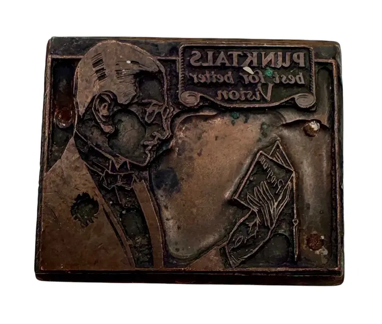 Wood and metal printers block. ‘Goodman’ is written on the back.