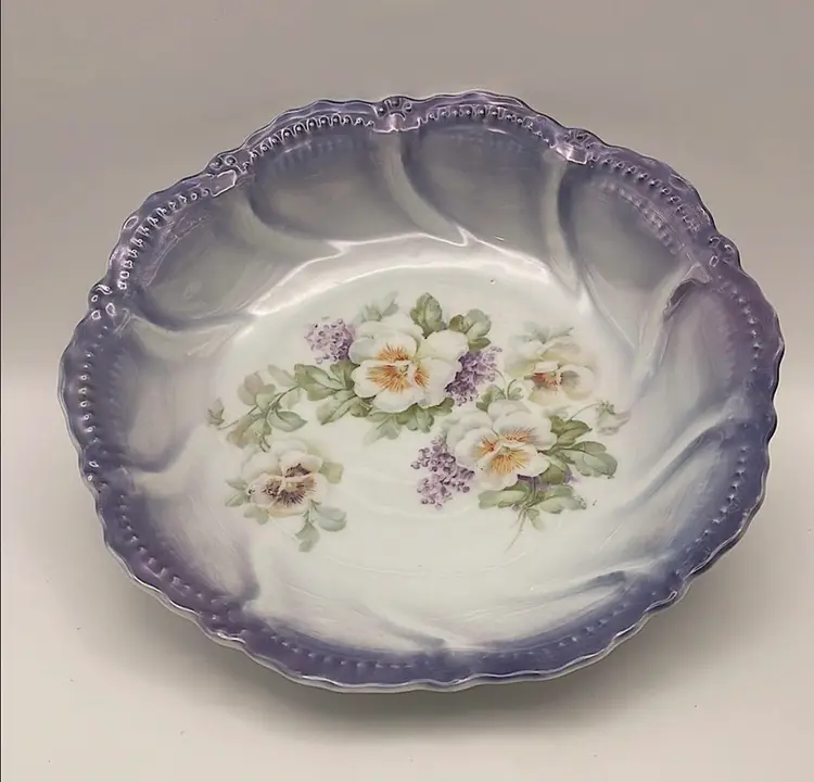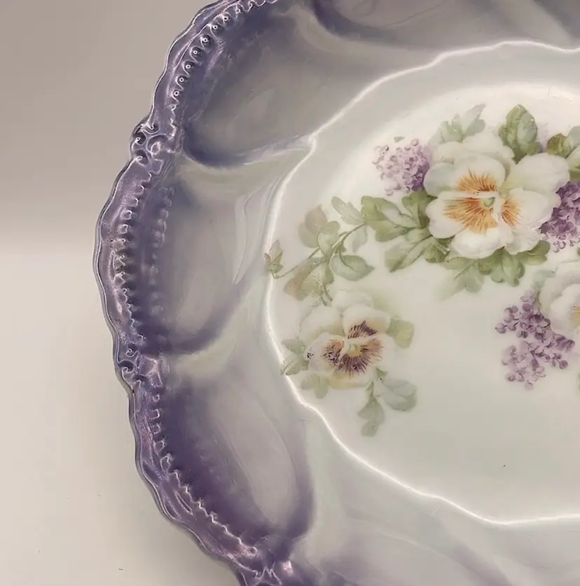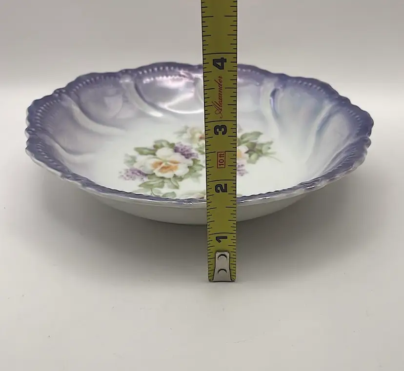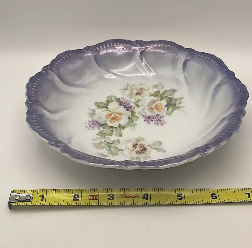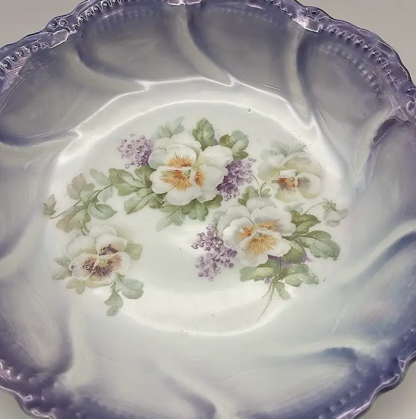 Vintage, Leuchtenburg Germany, Handpainted Porcelain Bowl. Pansy/Lilac Appliques. Beautiful Luster Rim! Please see pictures for measurements.