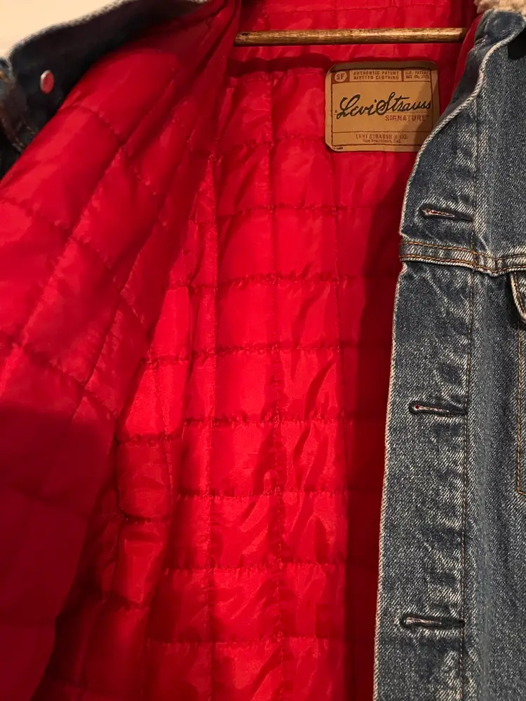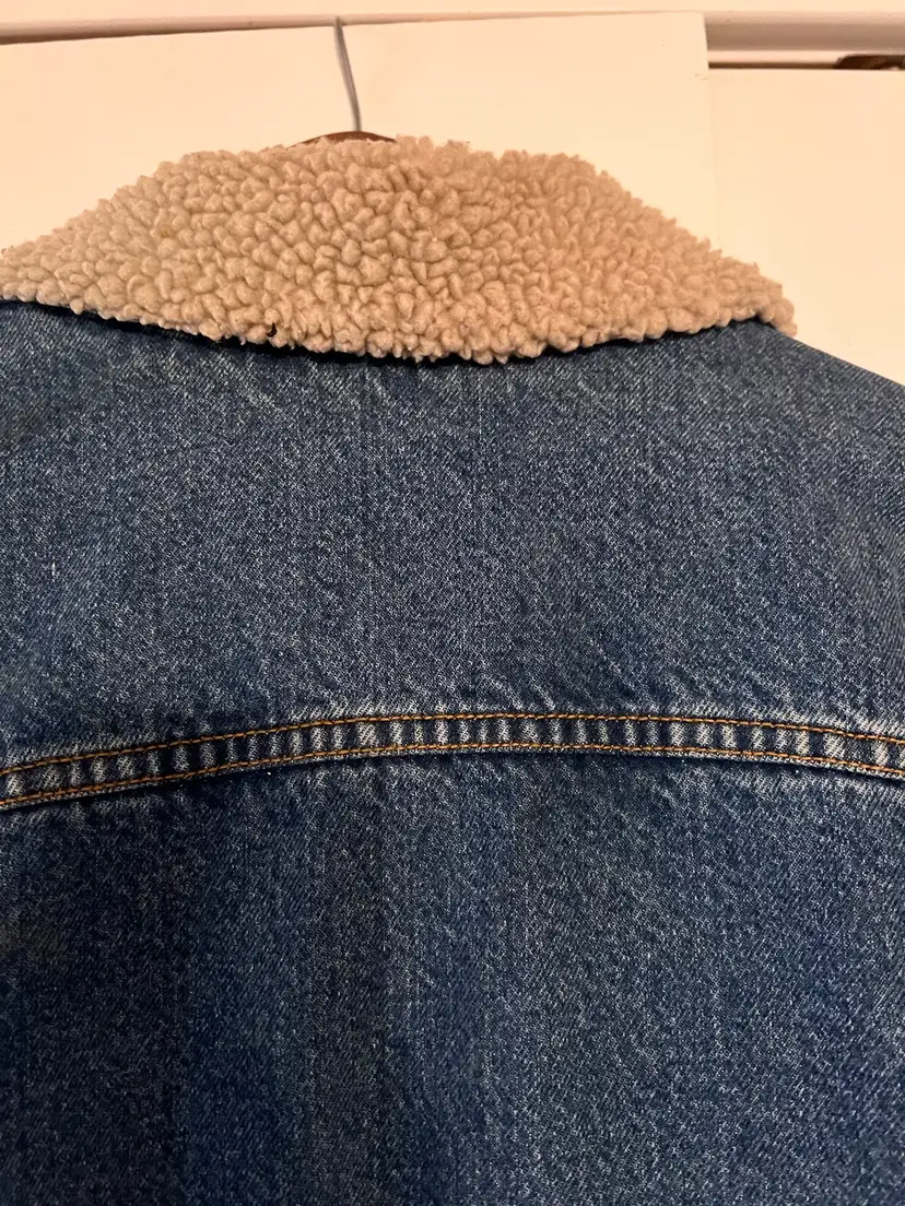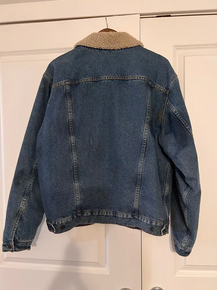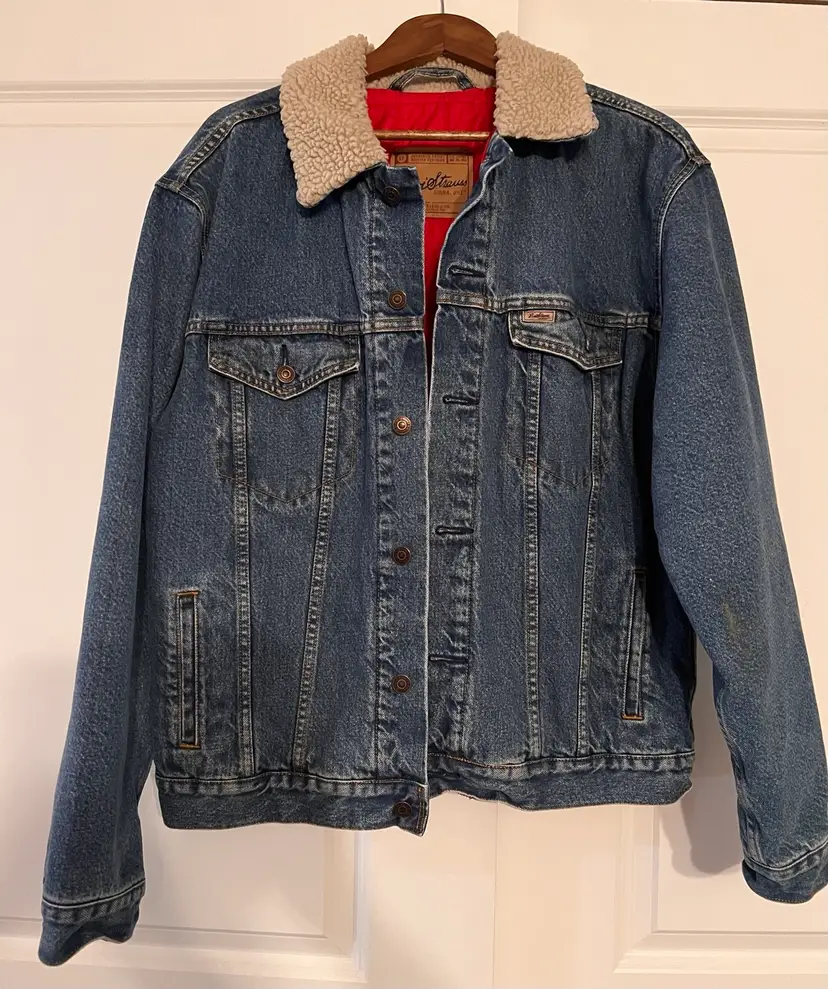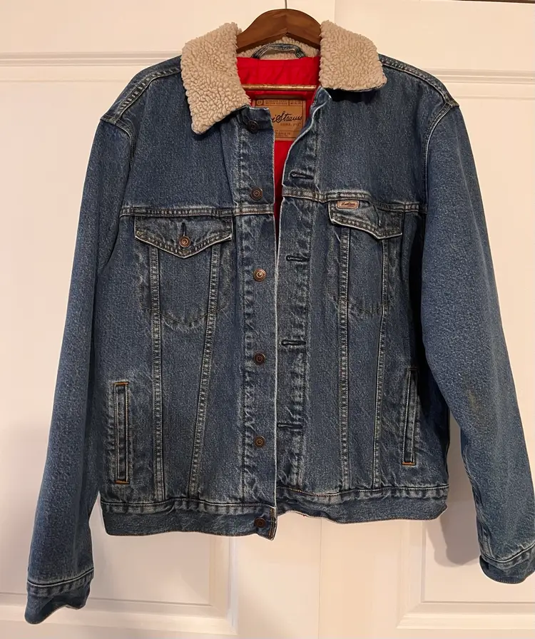 Jacket has Sherpa collar and red quilted lining. Measurements as follows: 20” shoulder to shoulder 44” Chest 40” waist 24” shoulder to wrist